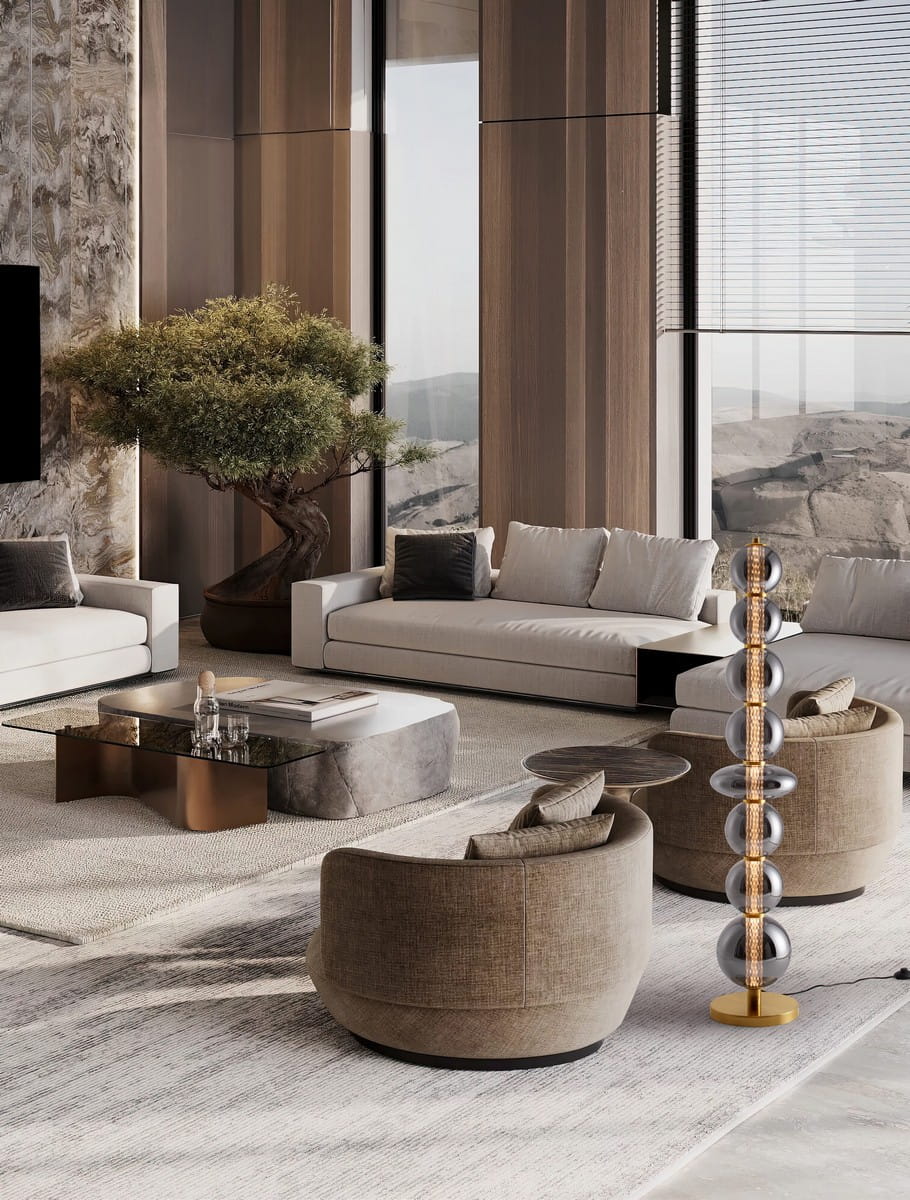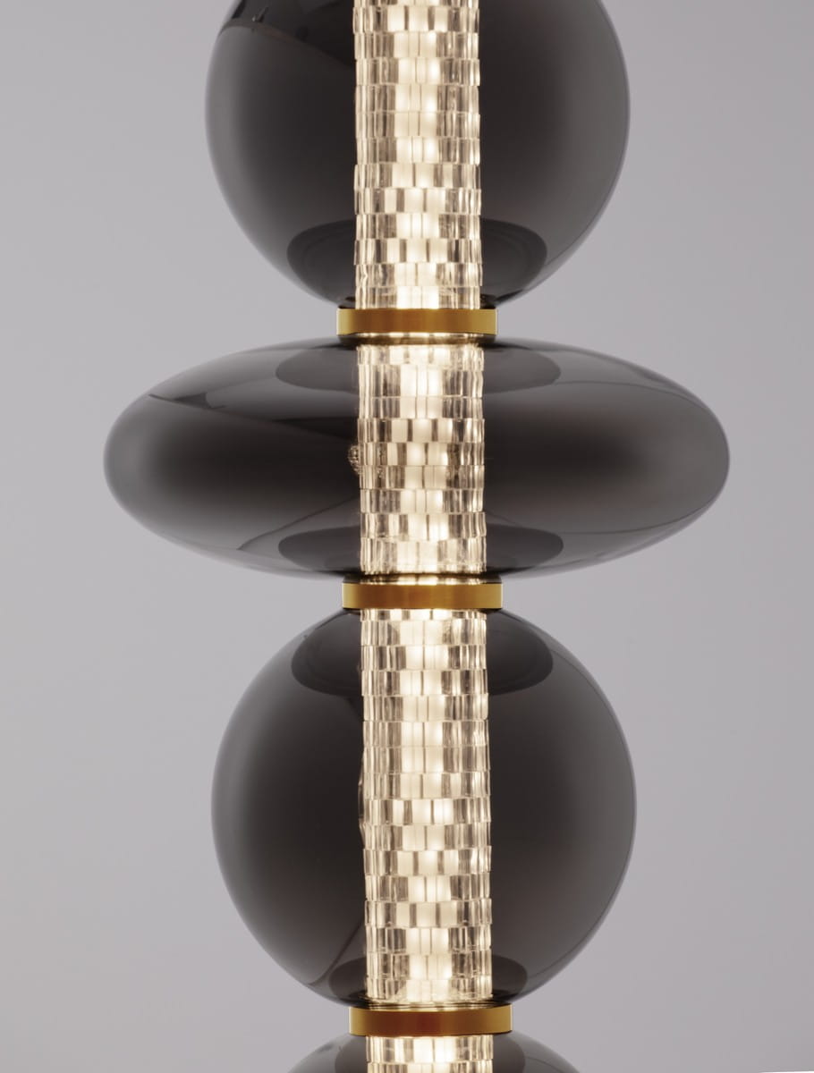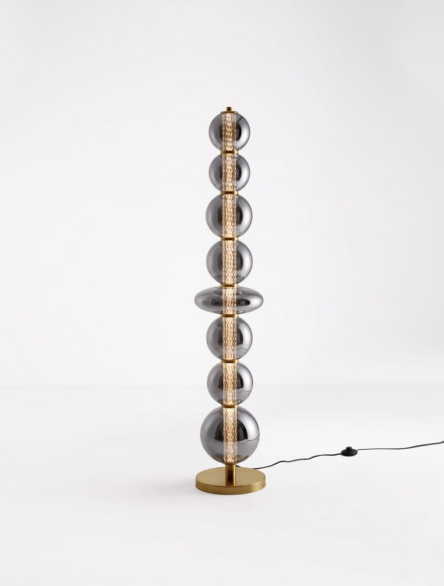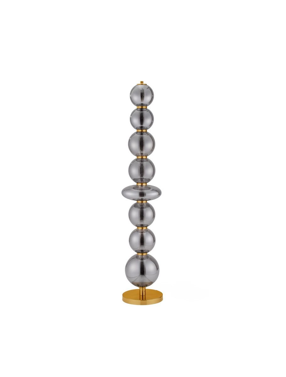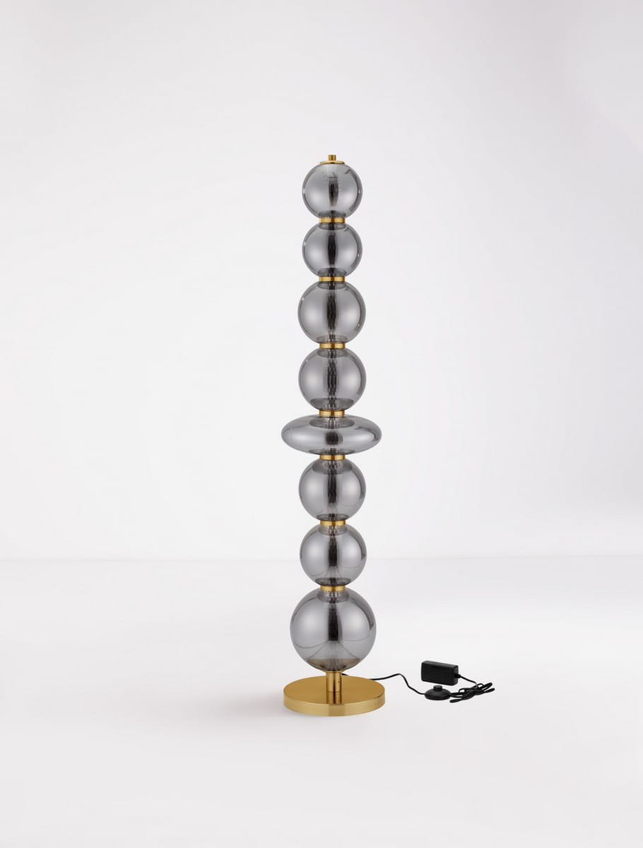 Morros to nowoczesna lampa podłogowa, która przyciąga wzrok swoją niecodzienną, rzeźbiarską sylwetką. Składająca się z regularnie ułożonych kulistych form wykonanych ze szkła w dymionym odcieniu, osadzonych na złotej, metalowej podstawie – tworzy wyjątkowy akcent we wnętrzu, łącząc artystyczny charakter z funkcjonalnością.
