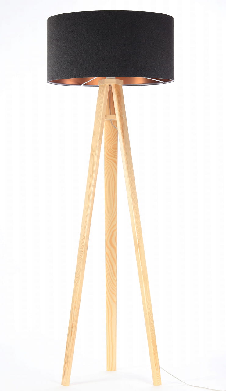 Lampa podłogowa Tripod z cudownym miedzianym wnętrzem to odpowiedź na nowoczesną formę oświetlenia w Twoim domu! Światło skryte w ciemnoszarym abażurze elegancko wypełnia promieniami pomieszczenie i tworzy nietuzinkowy klimat z nutą ekstrawagancji, dzięki drewnianej podstawie.