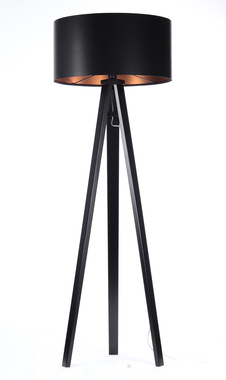 Lampa podłogowa Tripod z cudownym miedzianym wnętrzem to odpowiedź na nowoczesną formę oświetlenia w Twoim domu! Światło skryte w czarnym abażurze elegancko wypełnia promieniami pomieszczenie i tworzy nietuzinkowy klimat z nutą ekstrawagancji, dzięki czarnej podstawie.