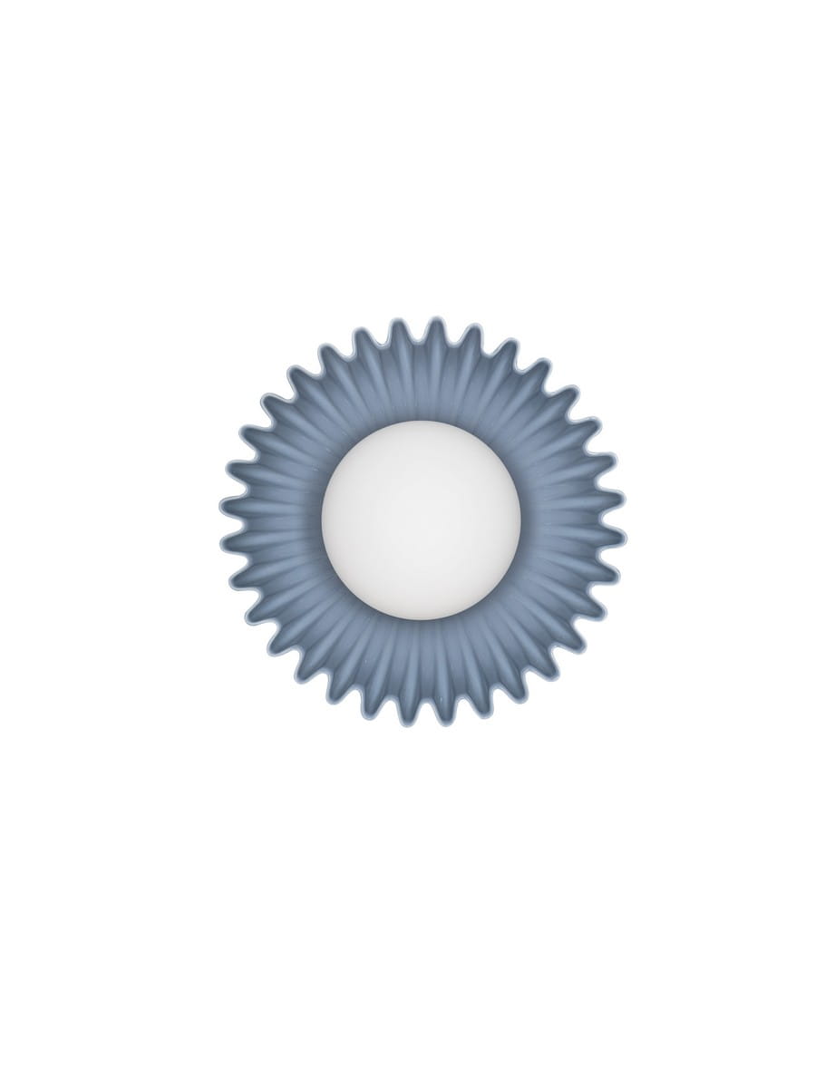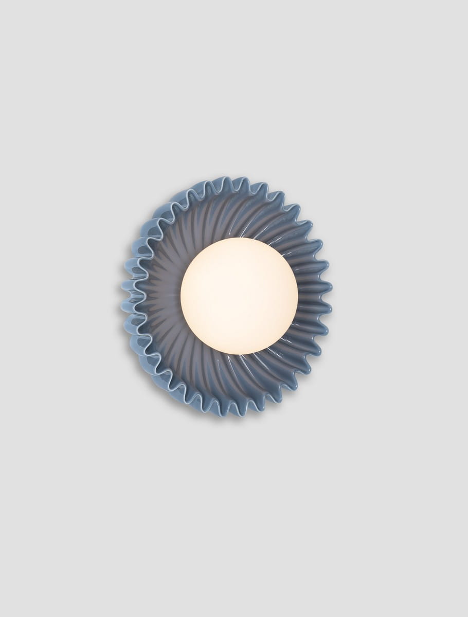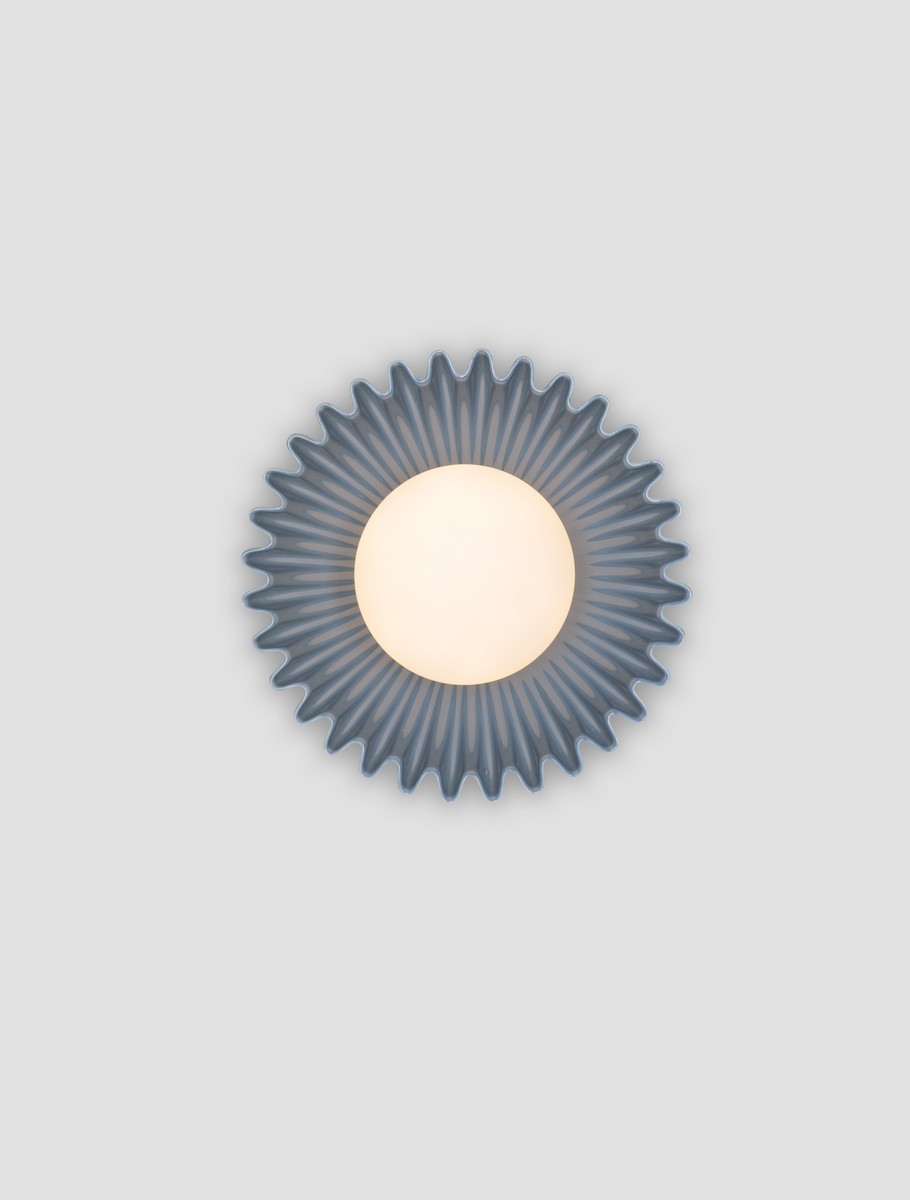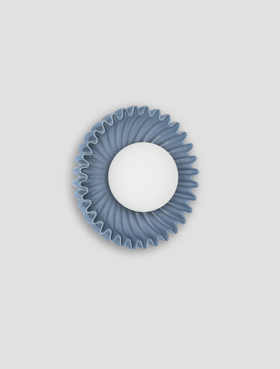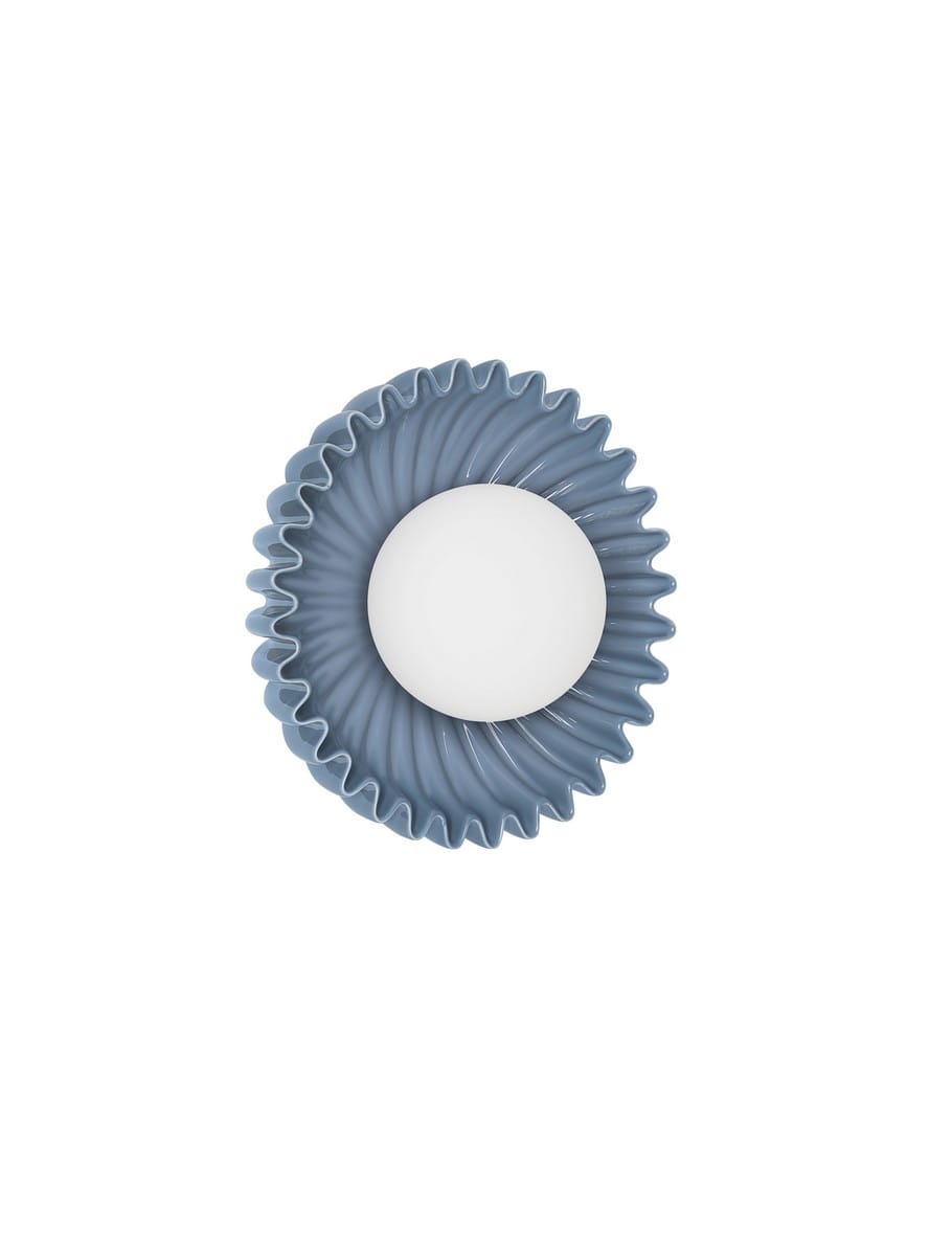 Wykonana z ceramiki i szkła lampa dostępna jest w czterech kolorach: stalowym niebieskim, eleganckim zielonym, subtelnym kremowym oraz ciepłym beżowym. Centralny szklany klosz rozprasza światło w sposób miękki i równomierny, nadając przestrzeni przytulny charakter. Ceramiczna rozeta, dzięki efektownej rzeźbionej strukturze, tworzy ciekawe refleksy świetlne, nawet gdy lampa jest wyłączona.