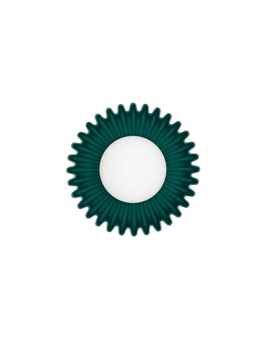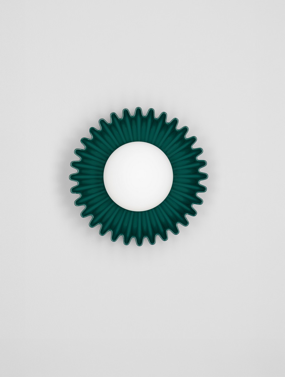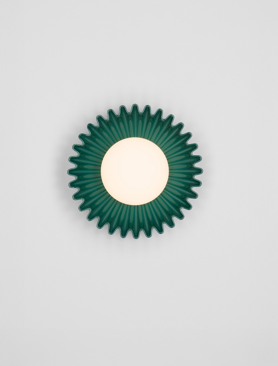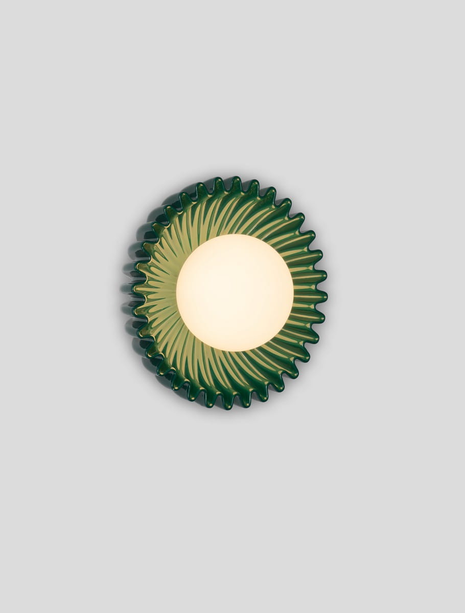 Wykonana z ceramiki i szkła lampa dostępna jest w czterech kolorach: stalowym niebieskim, eleganckim zielonym, subtelnym kremowym oraz ciepłym beżowym. Centralny szklany klosz rozprasza światło w sposób miękki i równomierny, nadając przestrzeni przytulny charakter. Ceramiczna rozeta, dzięki efektownej rzeźbionej strukturze, tworzy ciekawe refleksy świetlne, nawet gdy lampa jest wyłączona.