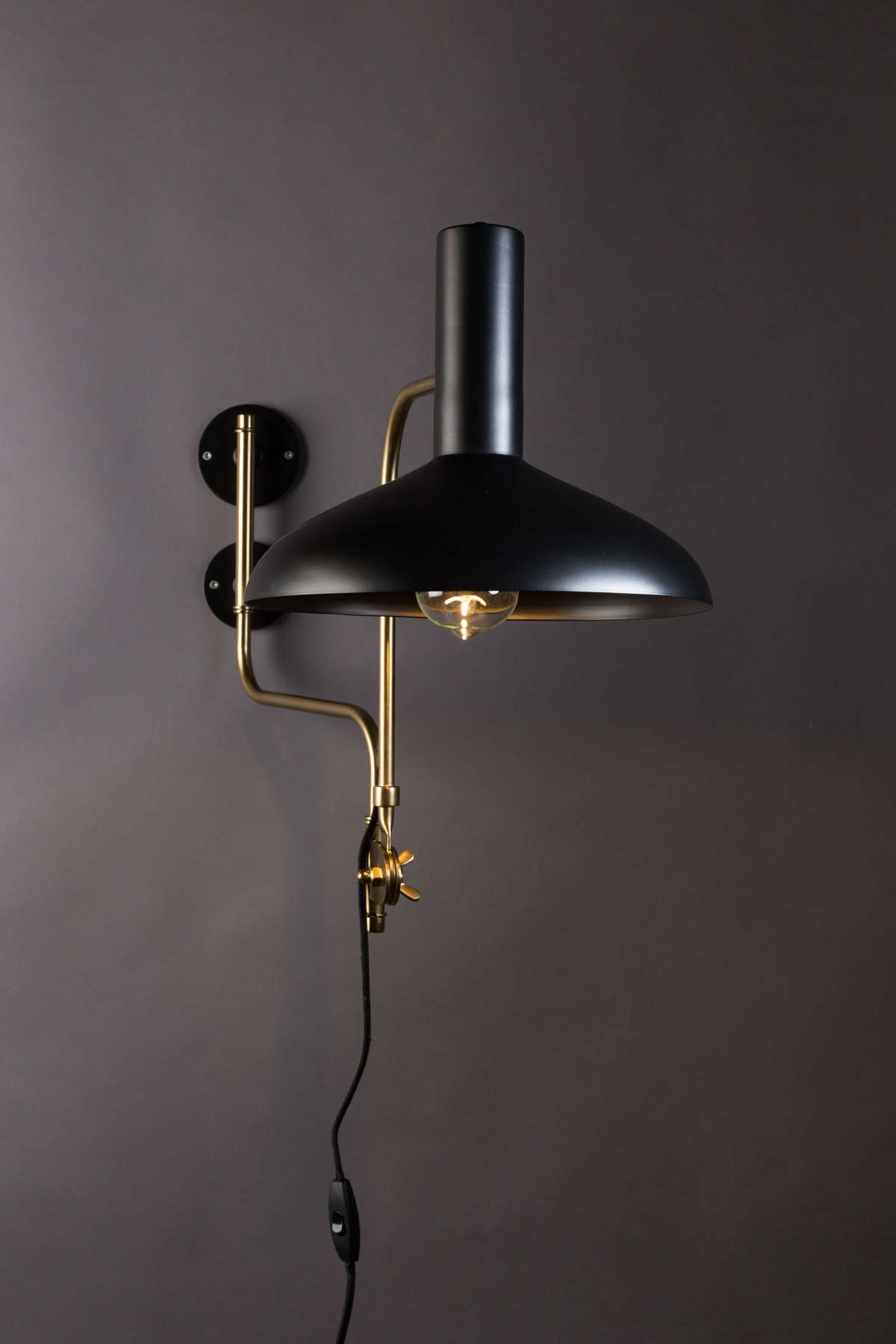 Lampa ścienna Devi to elegancka forma w stylu retro, połączona z doskonała jakością. Żelazny klosz o ciekawym kształcie, podtrzymuje mosiężny korpus, który przymocowany jest do ściany za pomocą dwóch okrągłych podstaw. Klosz i podstawa wykończona jest w błyszczącym, czarnym kolorze nadając całości eleganckiego charakteru. Metalowa konstrukcja tworzy idealne zestawienie z ciemną oprawą tworząc klimatyczny dodatek do salonu czy biura. Z ramienia wychodzi czarny, teksturowany kabel z włącznikiem światła.