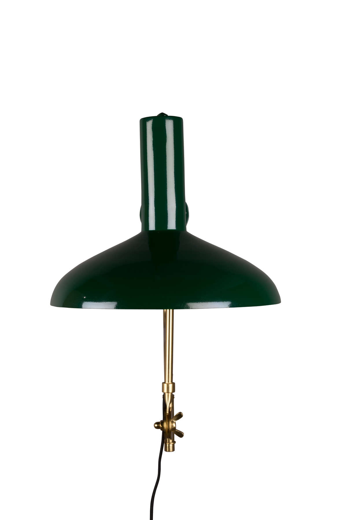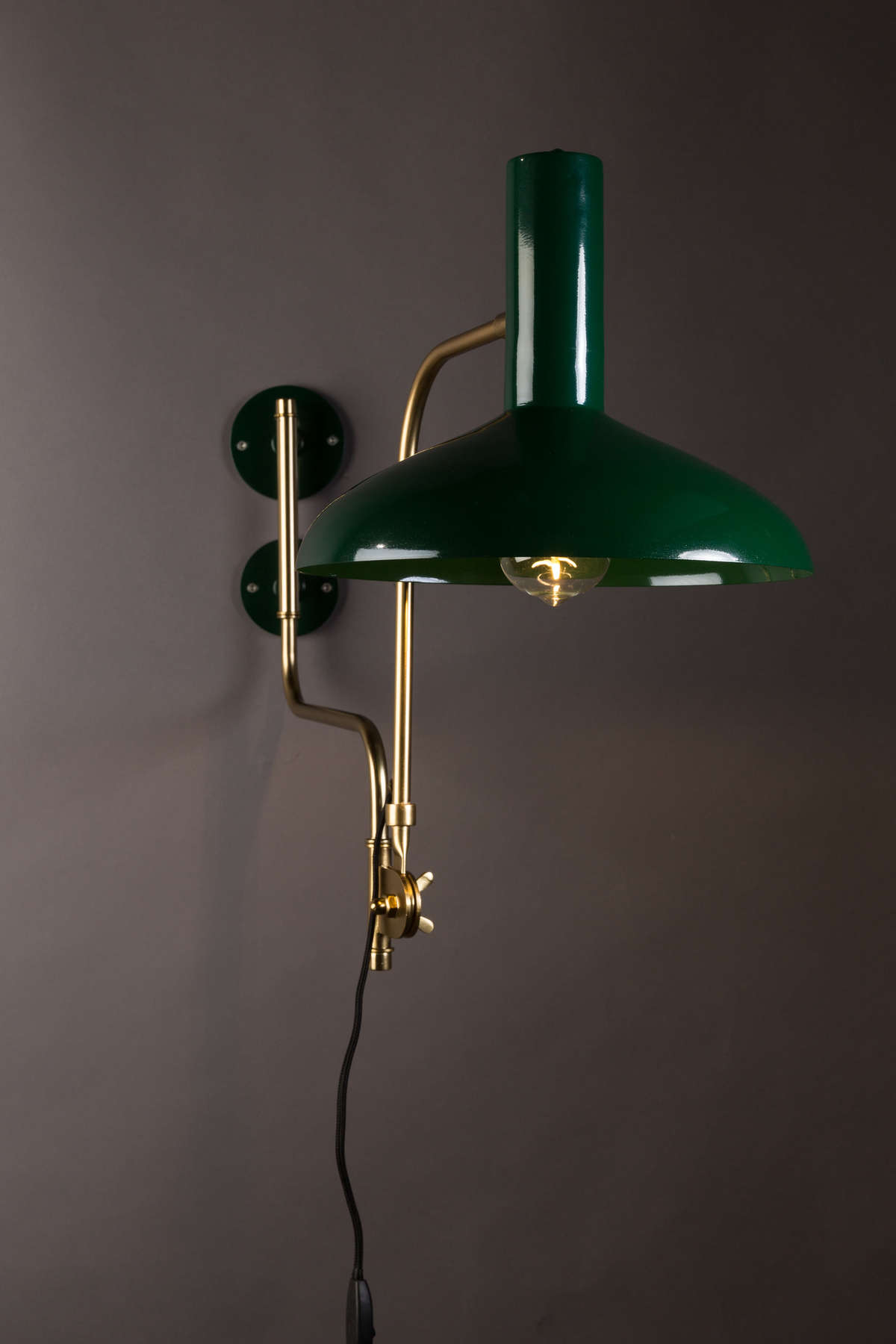 Lampa ścienna Devi to elegancka forma w stylu retro, połączona z doskonała jakością. Żelazny klosz o ciekawym kształcie, podtrzymuje mosiężny korpus, który przymocowany jest do ściany za pomocą dwóch okrągłych podstaw. Klosz i podstawa wykończona jest w błyszczącym kolorze butelkowej zieleni nadając całości eleganckiego charakteru. Metalowa konstrukcja tworzy idealne zestawienie z ciemną oprawą tworząc klimatyczny dodatek do salonu czy biura. Z ramienia wychodzi czarny, teksturowany kabel z włącznikiem światła.