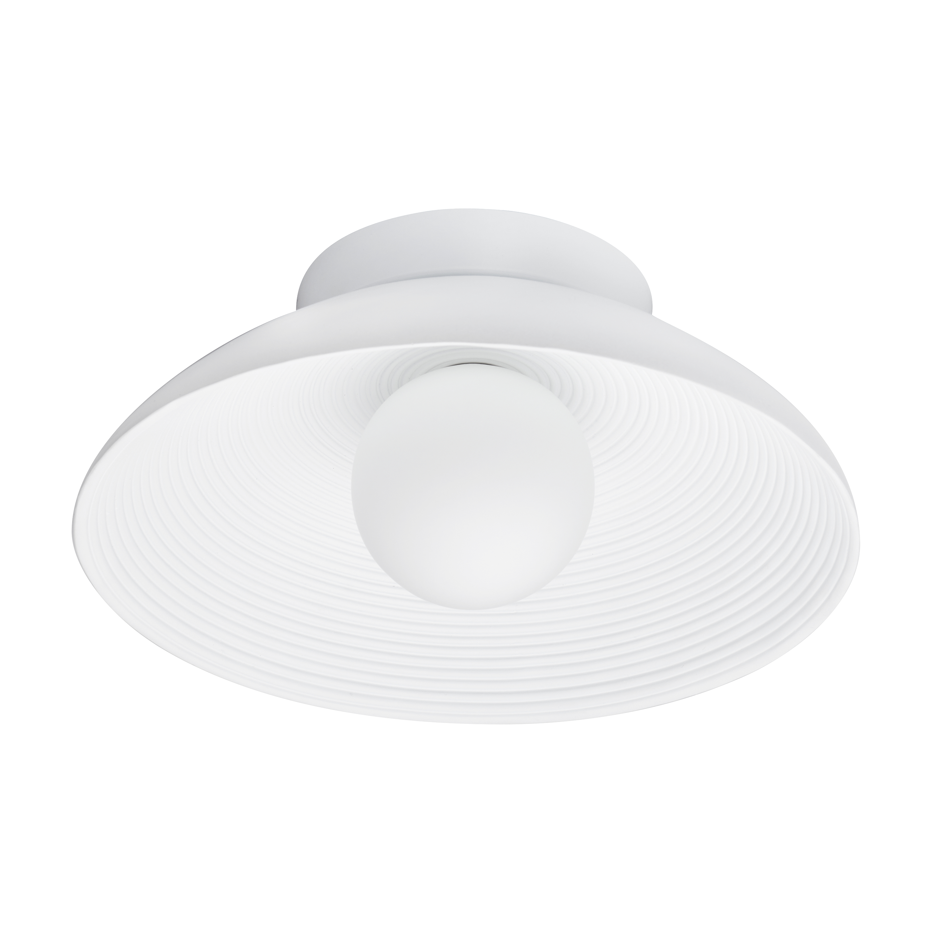 Kinkiet ILUSIONI to połączenie minimalistycznego designu z dekoracyjną głębią. Jego charakterystyczna forma w kształcie misy, z subtelnym ryflowaniem rozchodzącym się koncentrycznie od środka, przyciąga wzrok i nadaje wnętrzu artystycznego wyrazu. Lampę wieńczy centralny, mlecznobiały szklany klosz, który delikatnie rozprasza światło, tworząc kojącą atmosferę.