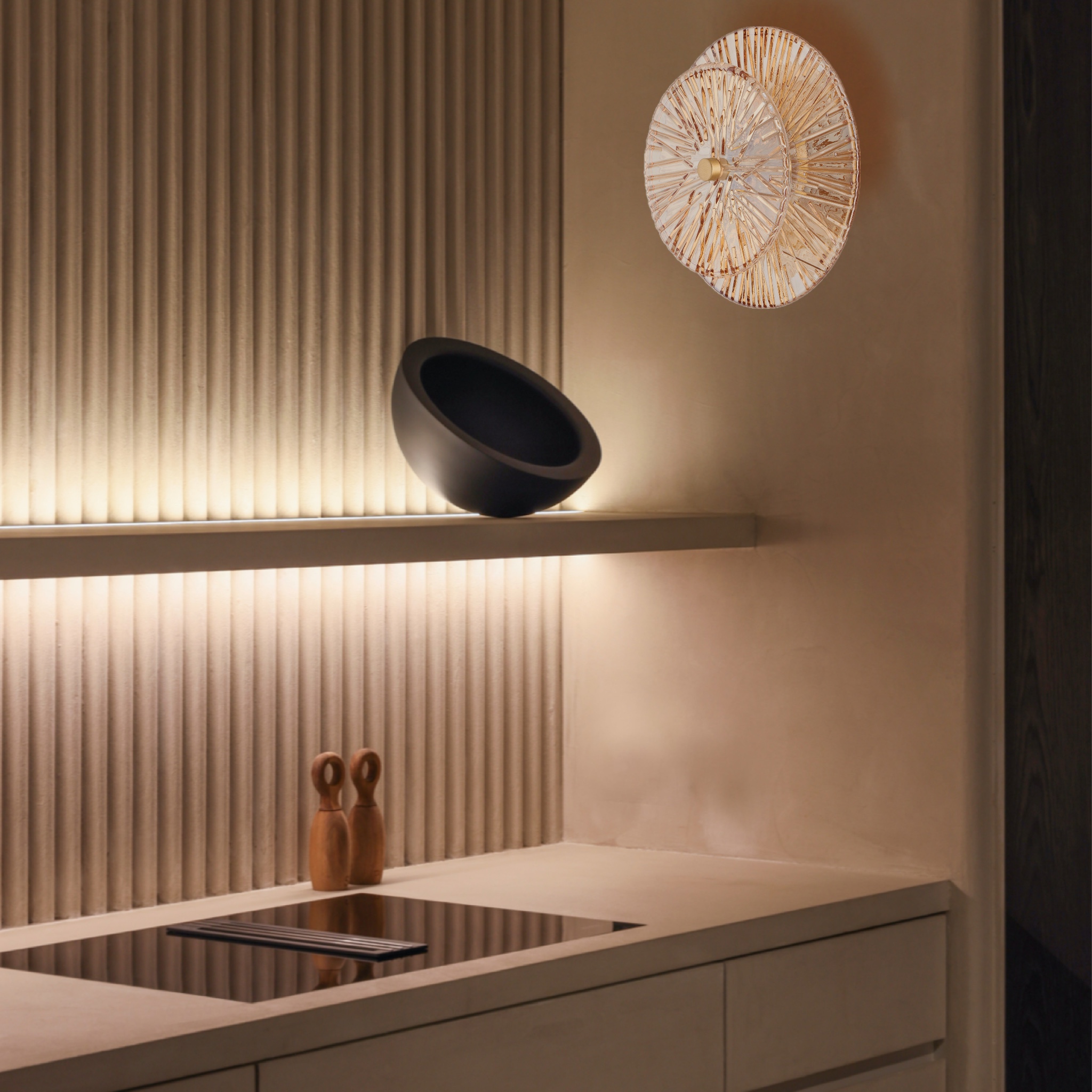 Delikatnie prążkowana powierzchnia szkła w bursztynowym odcieniu załamuje światło, tworząc fascynujące refleksy i miękkie, rozproszone oświetlenie. Lampa nie tylko rozświetla przestrzeń, ale także ją dekoruje – dodaje wnętrzom głębi i przytulności, zachowując jednocześnie lekkość wizualną.