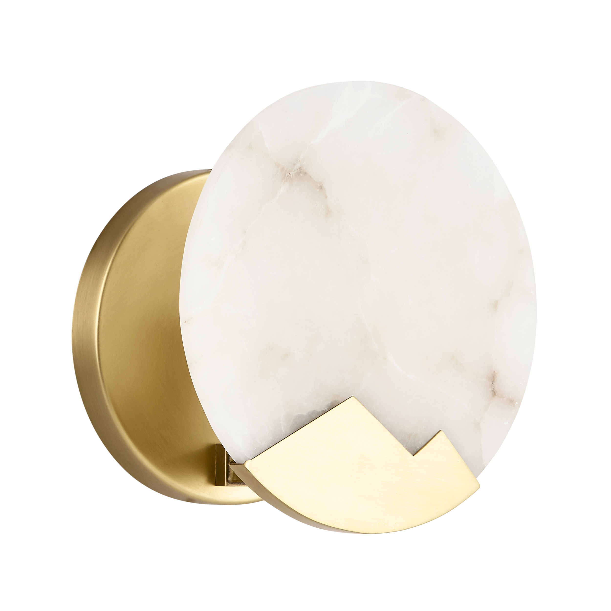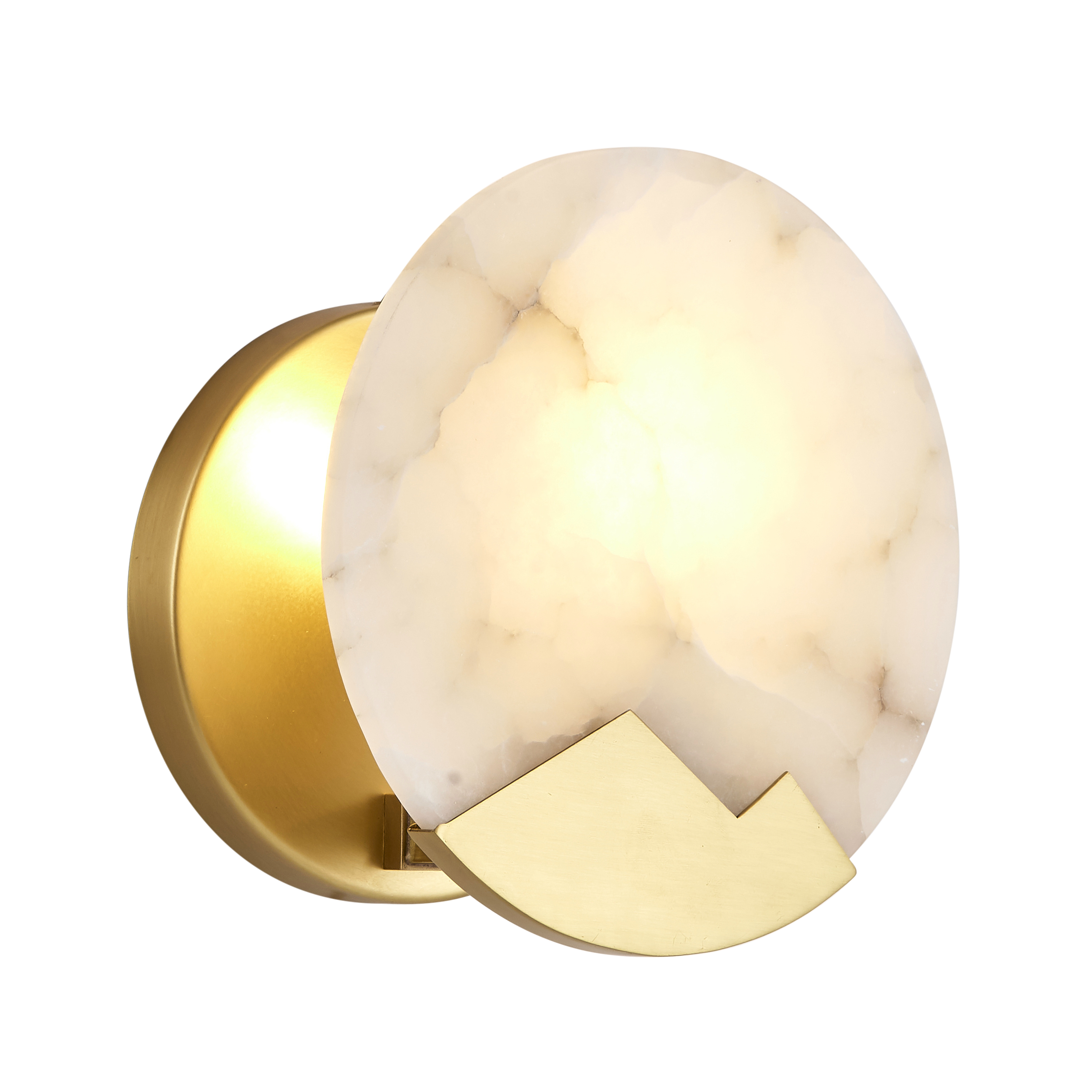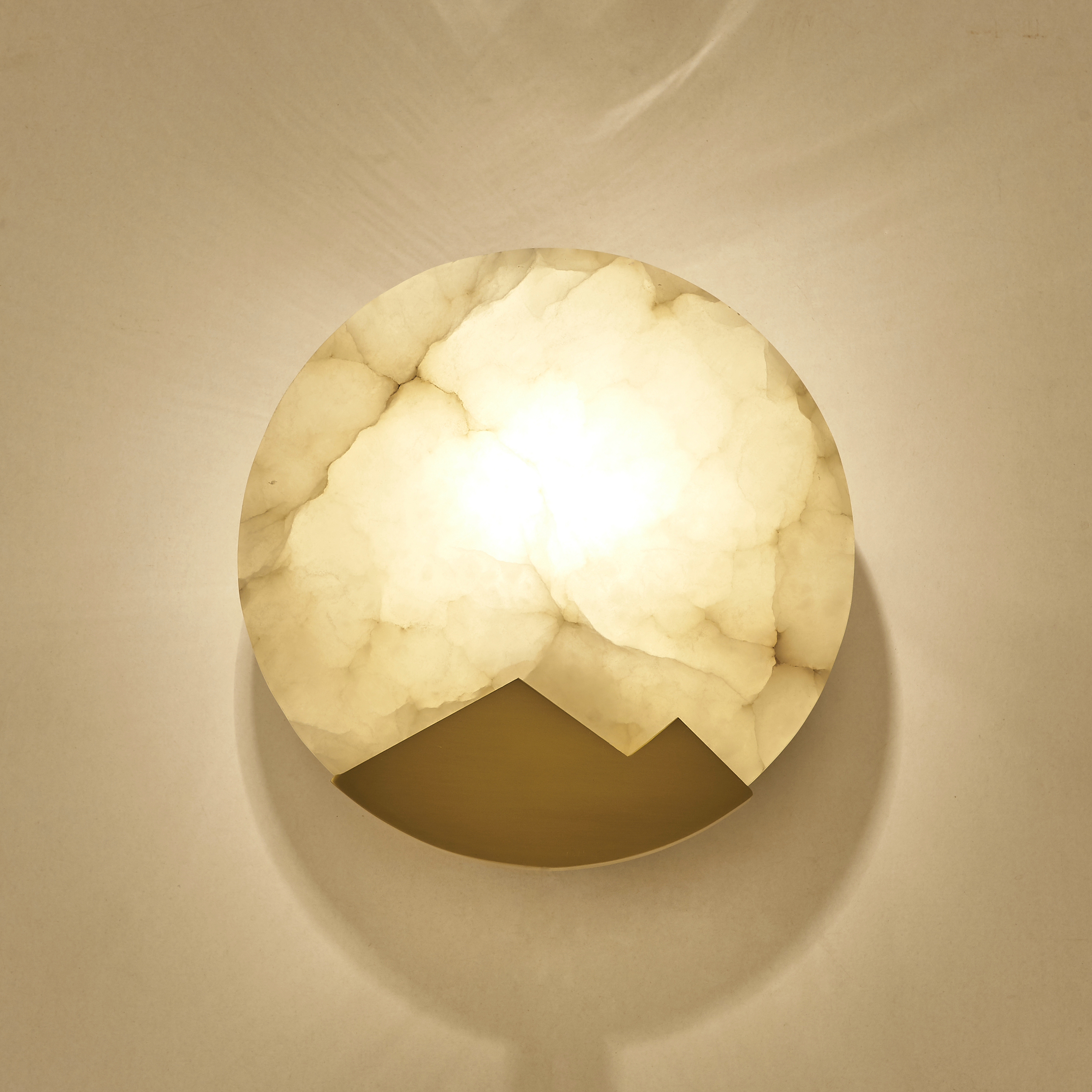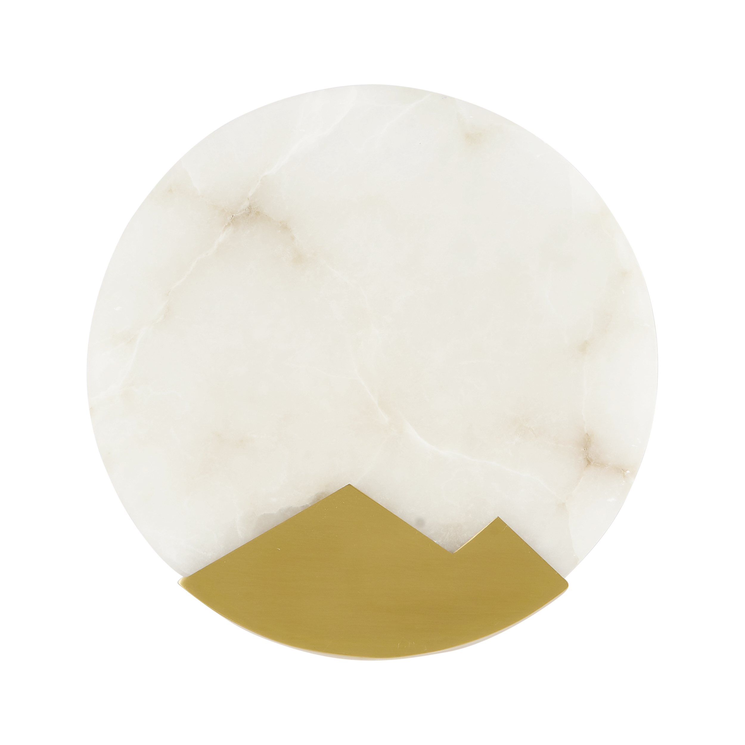 Okrągła tarcza z marmuru została uzupełniona geometrycznym akcentem z mosiądzu, który przełamuje klasyczną formę i wprowadza nowoczesny sznyt. Lampa emituje delikatne, rozproszone światło, które tworzy przytulną, nastrojową atmosferę – idealną do wnętrz mieszkalnych, ale także butikowych przestrzeni komercyjnych.