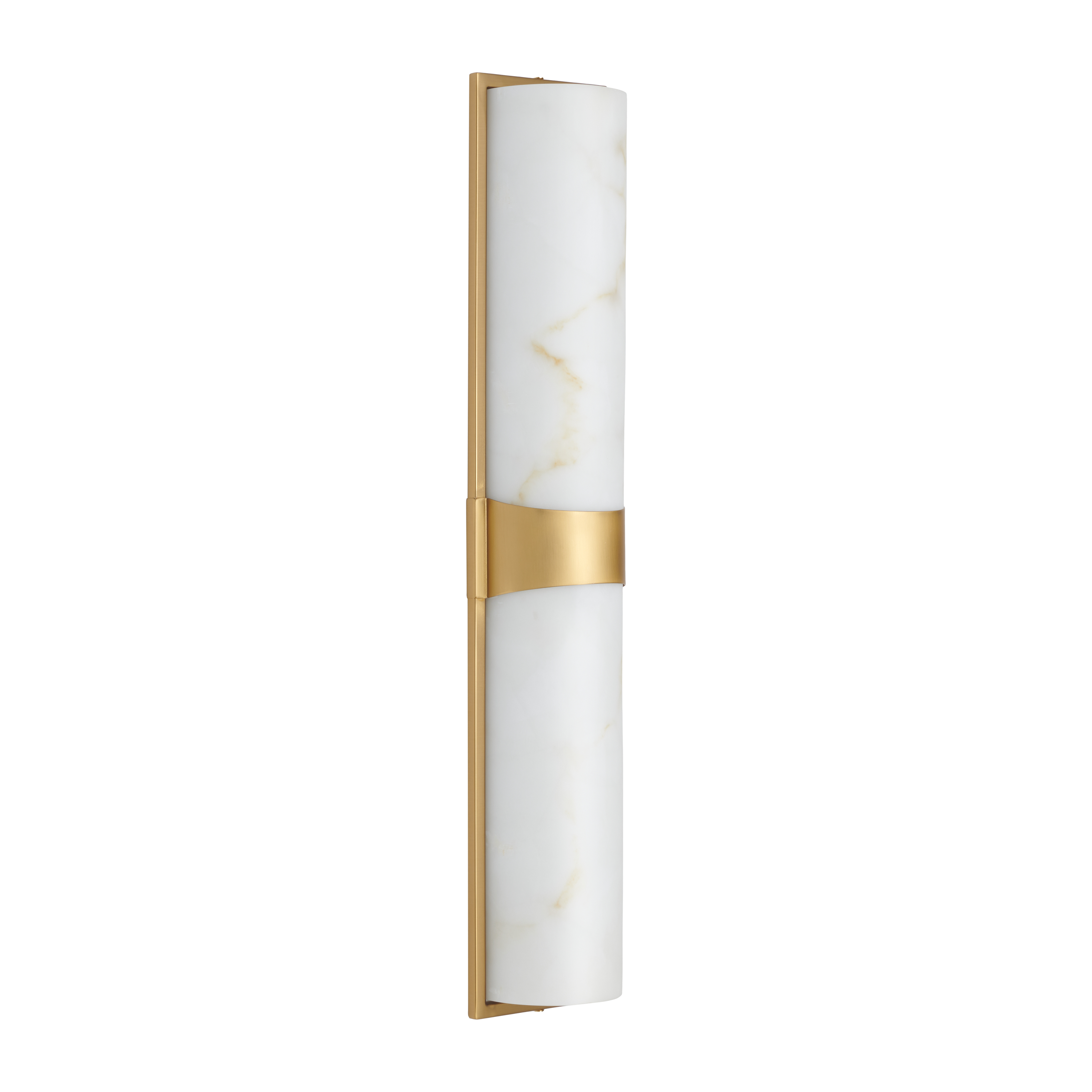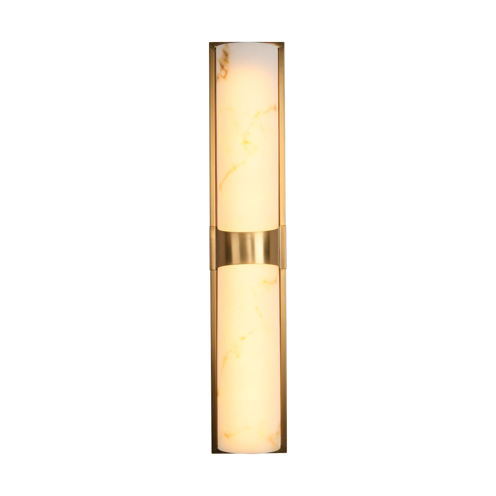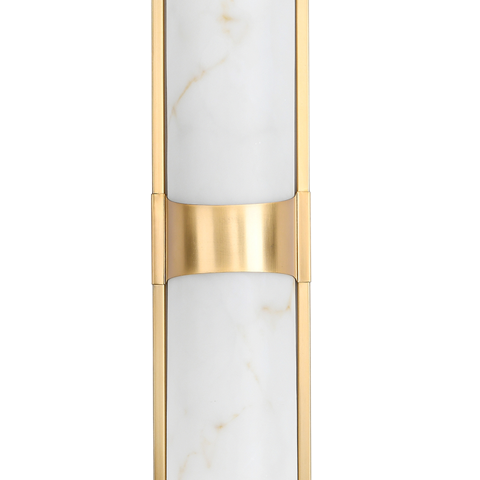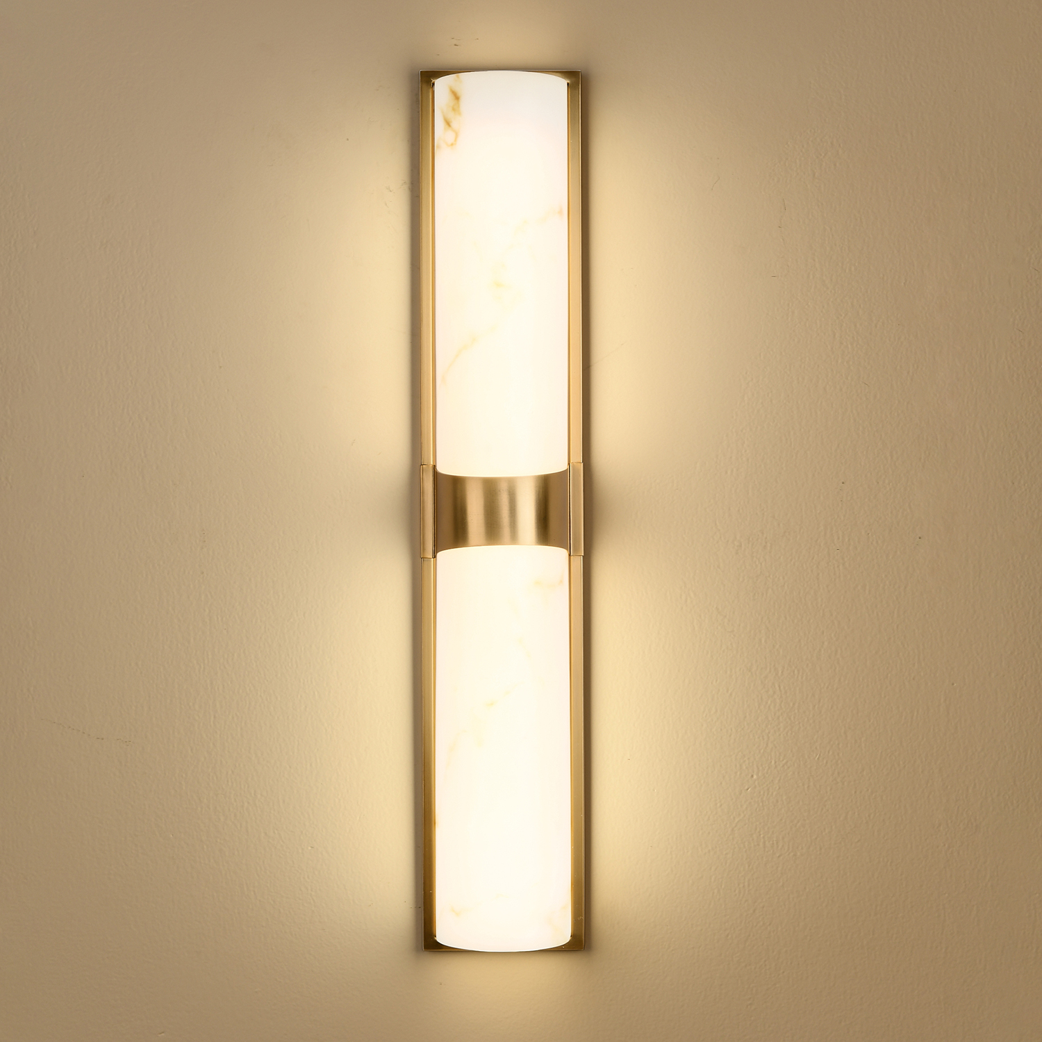 Centralna część kinkietu z półprzezroczystego marmuru delikatnie rozprasza światło, tworząc przytulną i klimatyczną aurę. Opasanie z metalu w kolorze mosiądzu podkreśla geometrię formy i dodaje całości nowoczesnego wyrazu. Każdy egzemplarz wykonany jest z naturalnego kamienia, dzięki czemu posiada unikatowe użylenie i indywidualny charakter.