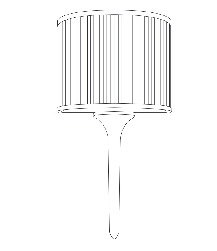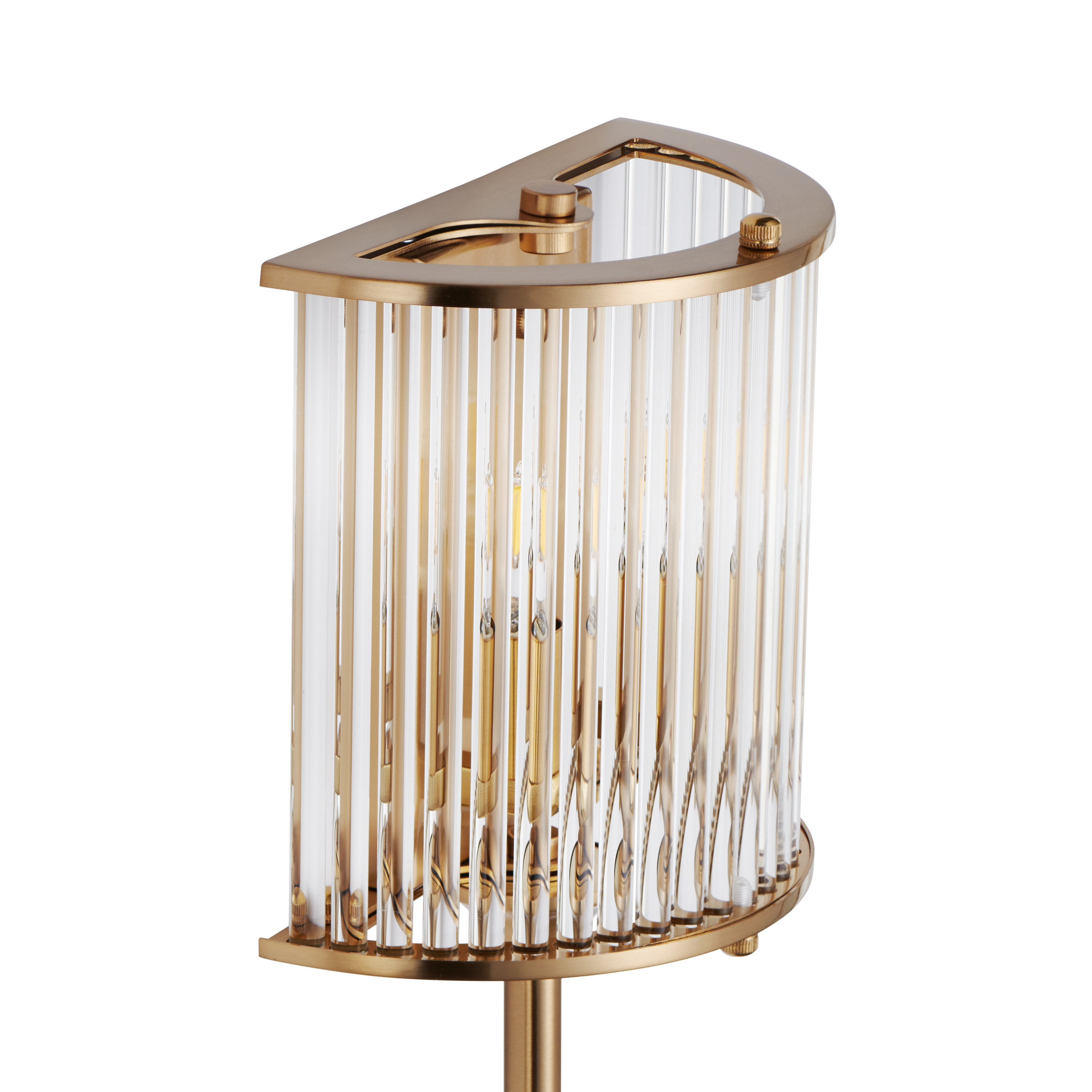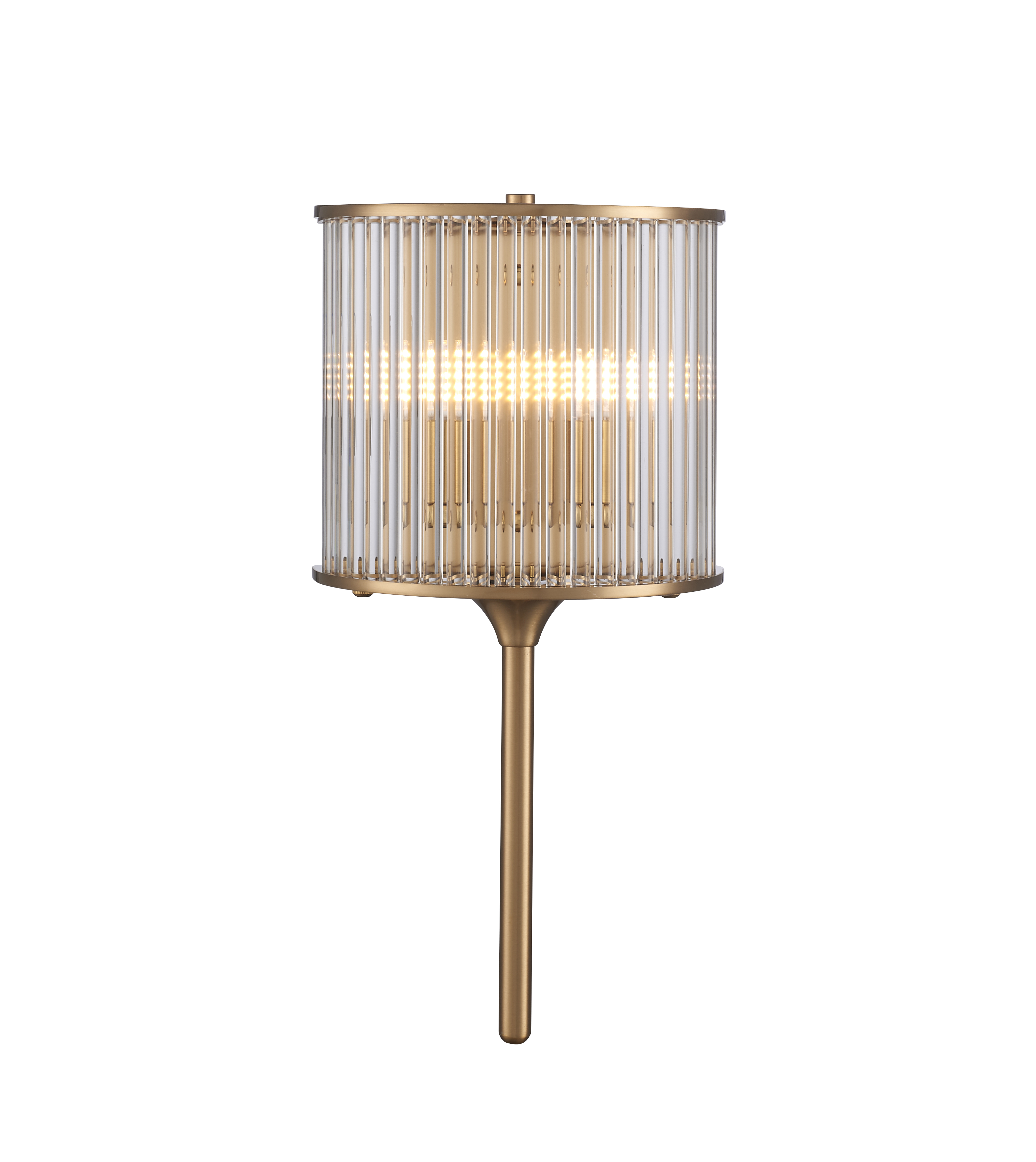 Centralnym punktem kinkietu jest cylindryczny klosz wykonany z pionowo osadzonych, przezroczystych prętów szklanych. Subtelnie rozpraszają one światło, tworząc miękły, nastrojowy blask.