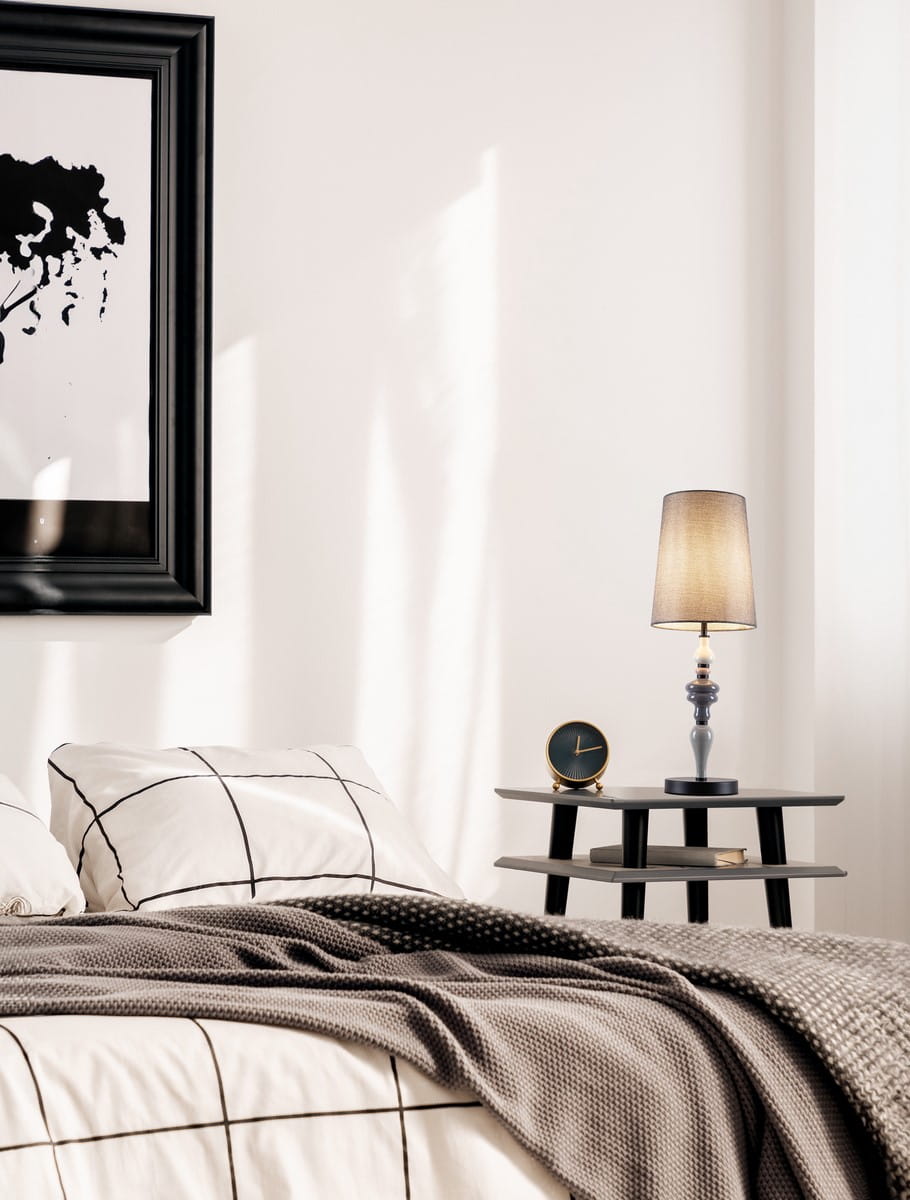 Kolorystyka lampy to subtelne połączenie odcieni szarości, bieli i czerni, które pomimo klasycznego designu lampy wprowadzają do wnętrza element nowoczesności.