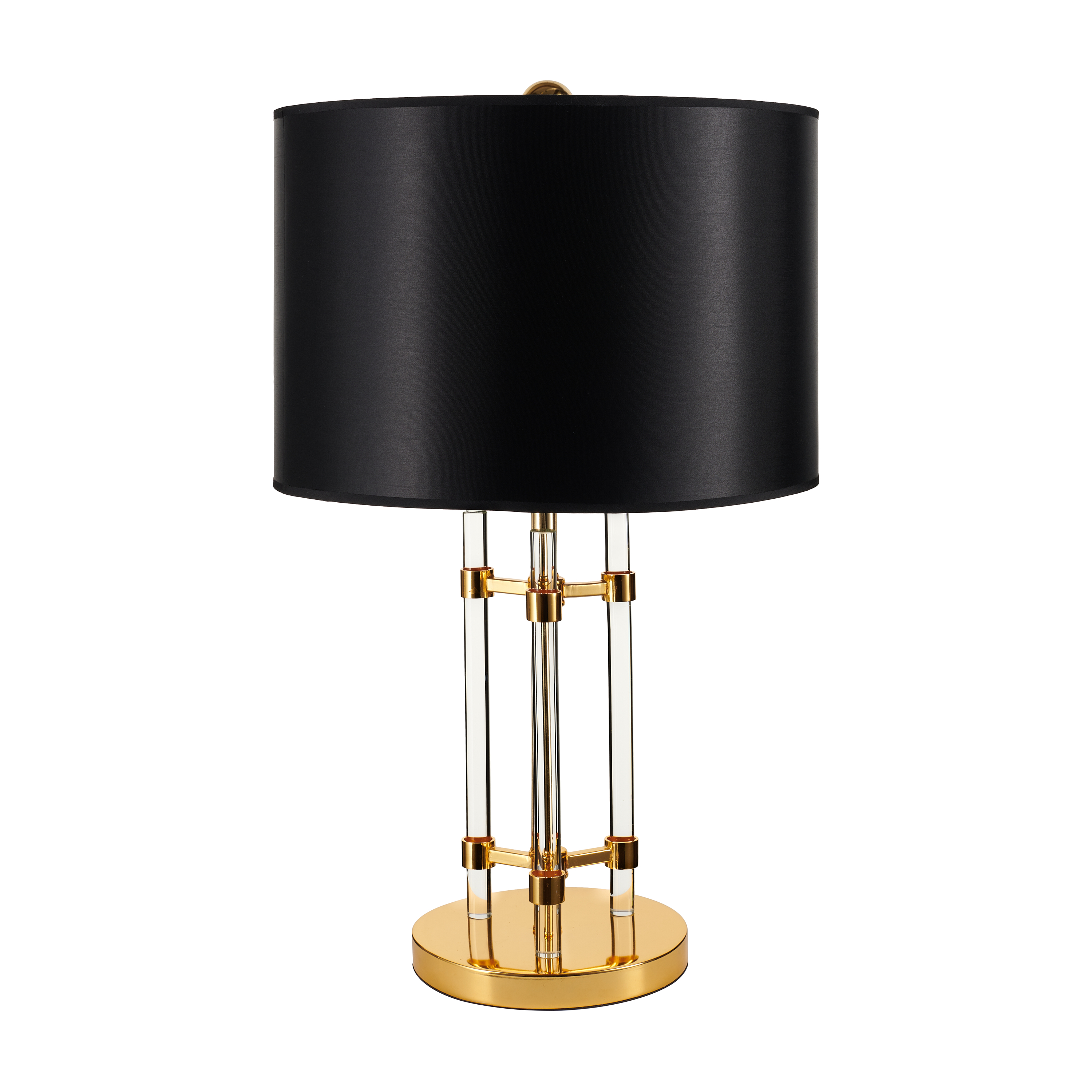 Połączenie lustrzanej złotej podstawy z czarnym, satynowym abażurem tworzy ponadczasowy kontrast, który emanuje stylem i klasą. Szklane, dekoracyjne pręty w podstawie nie tylko wzmacniają konstrukcję, ale również odbijają światło w sposób subtelny i elegancki.