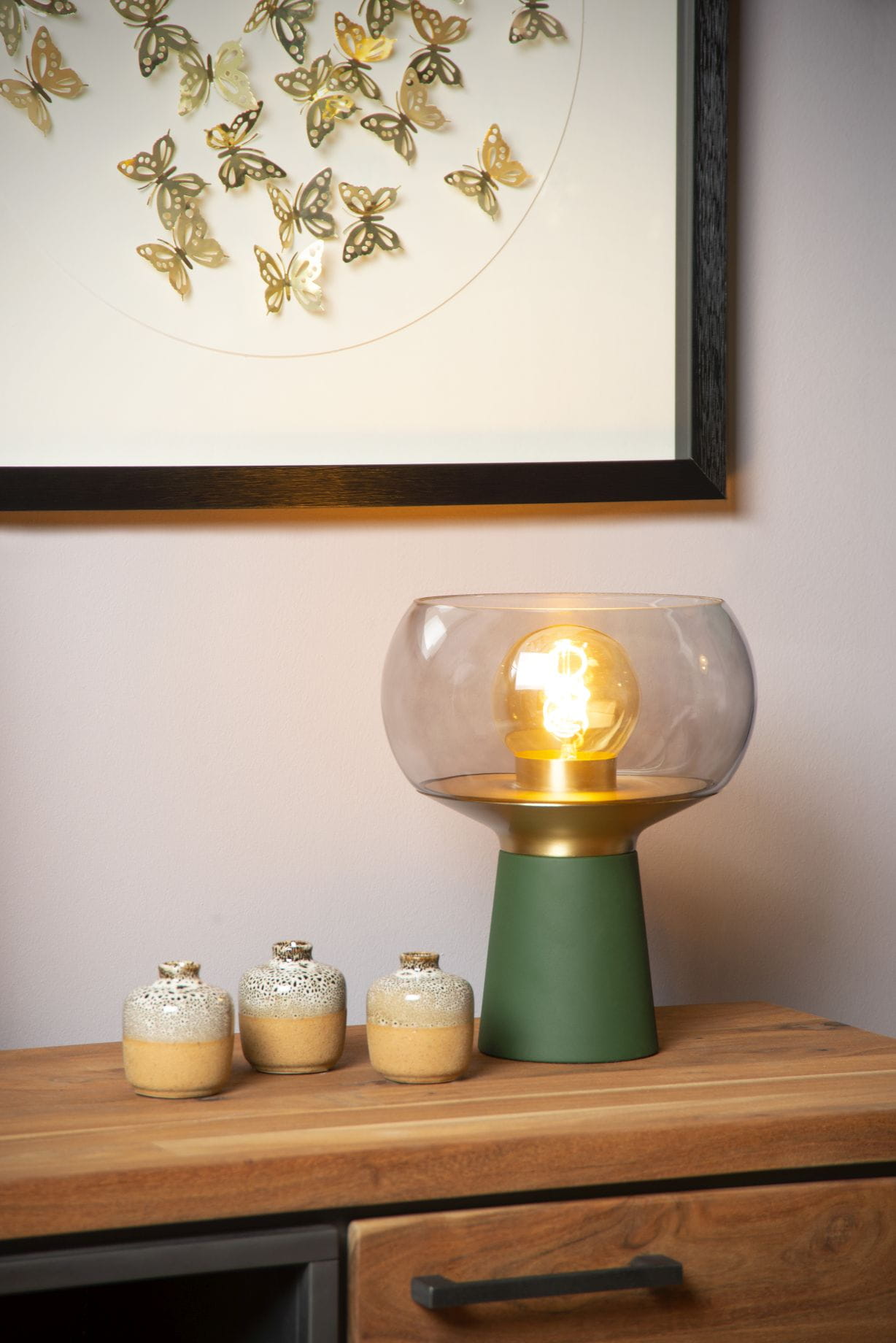 Półowalny klosz wykonany został ze wysokiej jakości szkła o przydymionym wykończeniu, dzięki czemu lampa jest nie tylko wysoce funkcjonalna, ale również elegancka i stylowa. Całość utrzymuje stalowa podstawa w kolorze butelkowej zieleni ze złotym akcentem u góry, przez co konstrukcja lampy jest stabilna i trwała. Z użyciem ściemnialnej żarówki możemy regulować jasność światła, dzięki czemu jesteśmy w stanie stworzyć we wnętrzu klimatyczną i ciepłą atmosferę według własnych potrzeb. Lampa nadaje się do użytku ze źródłem światła LED. Włącznik światła umieszczony został na kablu przy podstawie.