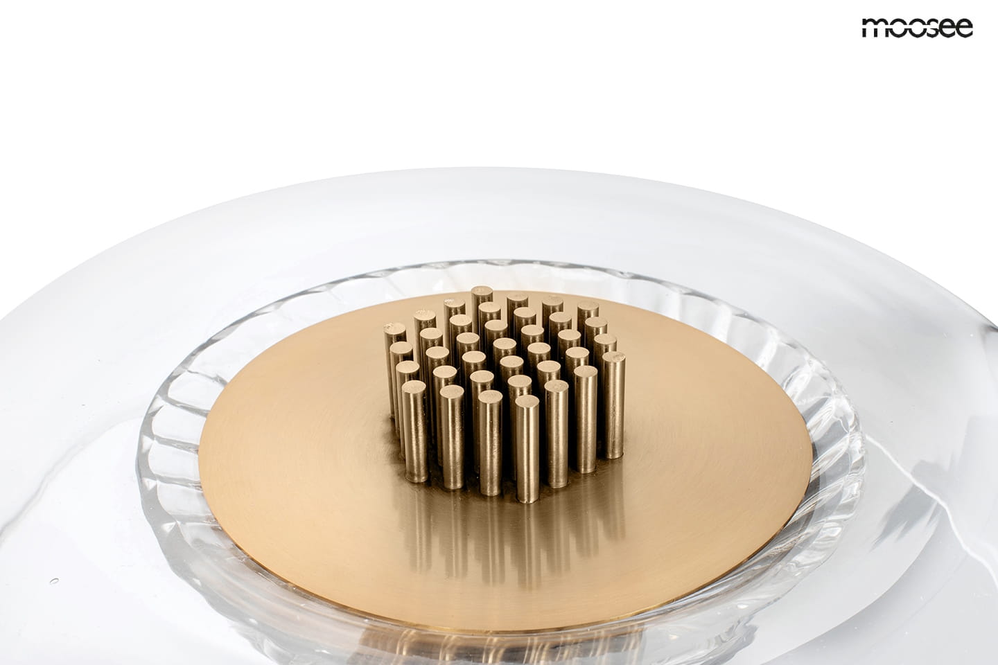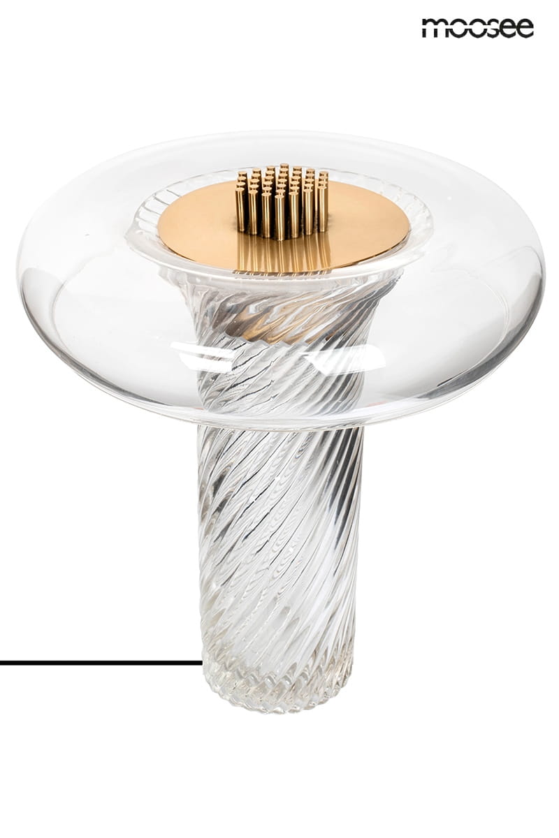 Lampa stołowa Icar zachwyca swą transparentną konstrukcją ze szkła, urozmaiconą złotymi detalami ze stali.