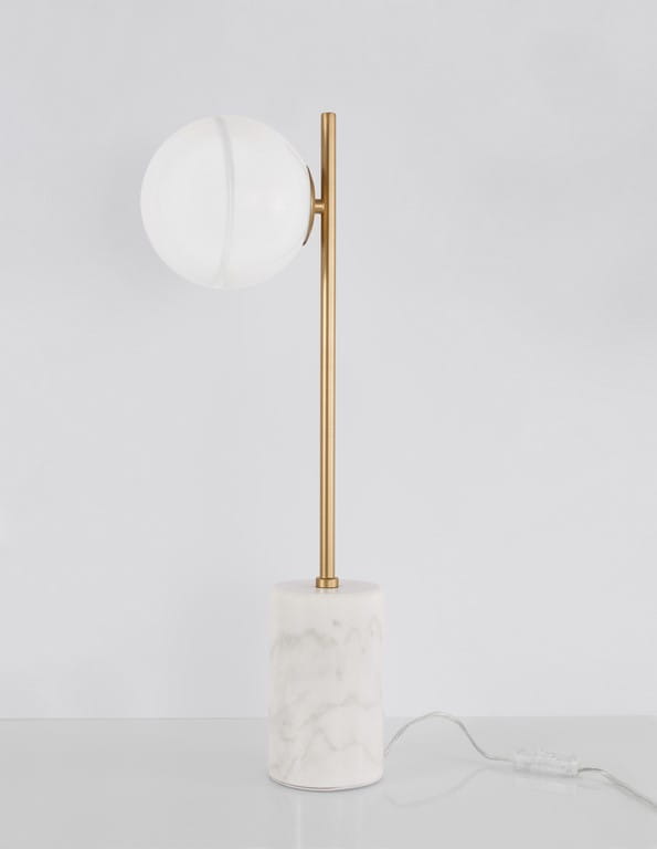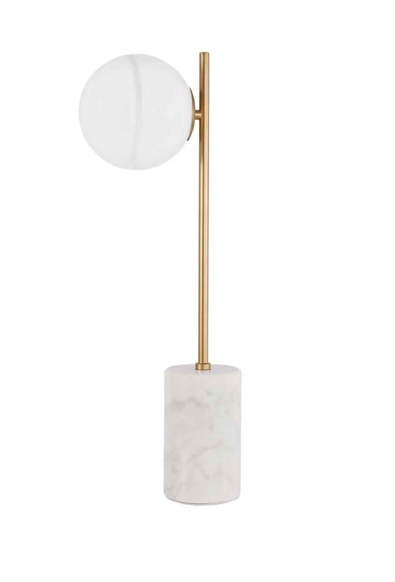 Lampa Perez wyróżnia się prostą, ale efektowną konstrukcją. Składa się z pionowego metalowego ramienia w kolorze złotym, które podtrzymuje szklany klosz o kulistym kształcie. Całość osadzona jest na solidnej podstawie wykonanej z białego marmuru, co nadaje jej elegancji i stabilności.