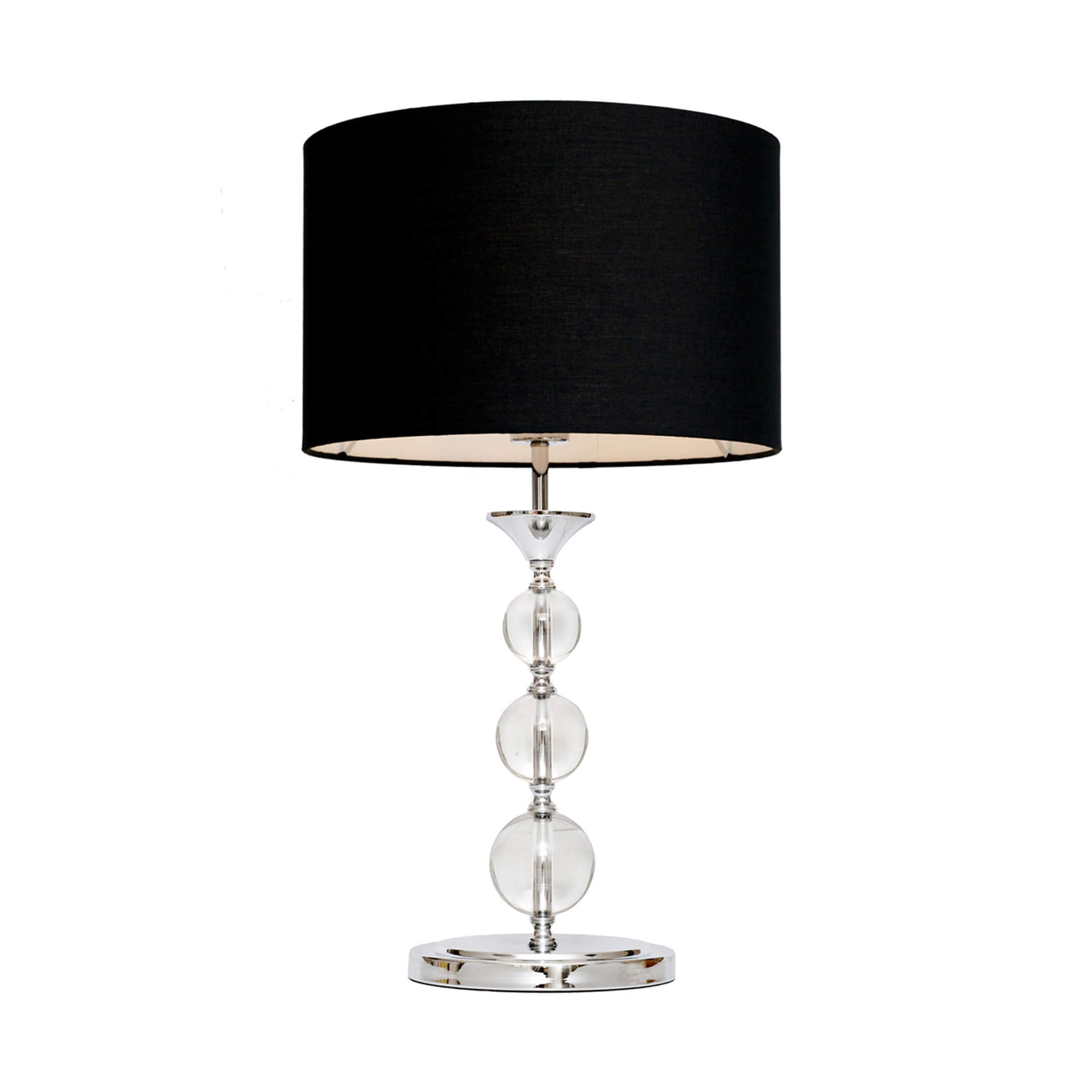 Lampa REA ma czarny abażur w prostym kształcie walca, wykonany z tkaniny. Model wyróżnia się chromowaną podstawą, którą zdobią szklane kule.