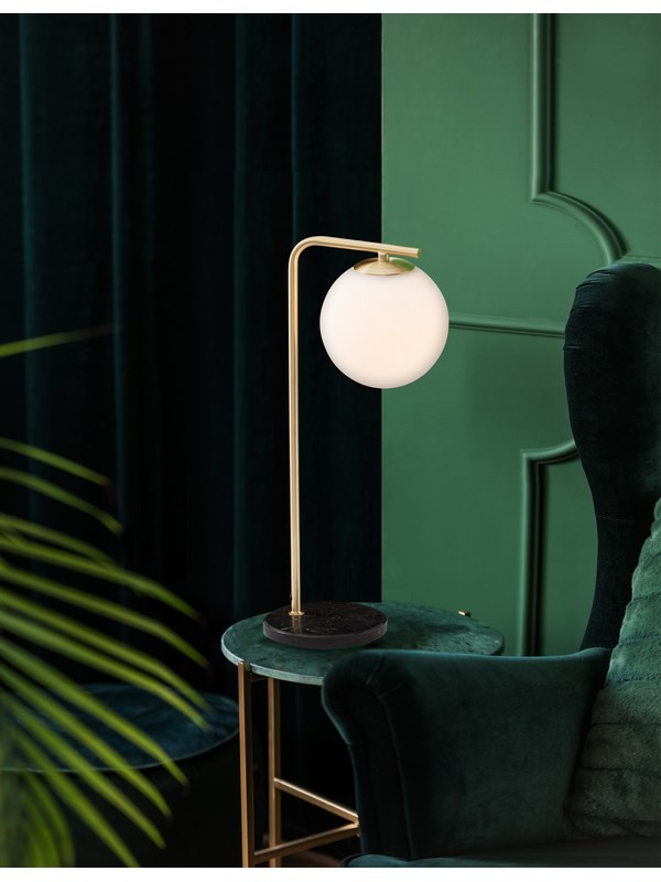 Lampa stołowa Rioja to wyjątkowe połączenie nowoczesnego designu i klasycznej elegancji. Wykonana z metalu w satynowym odcieniu złota, osadzona na solidnej marmurowej podstawie, przyciąga wzrok i wnosi do wnętrza nutę luksusu. Kulisty klosz z białego szkła subtelnie rozprasza światło, tworząc przytulną atmosferę sprzyjającą relaksowi.