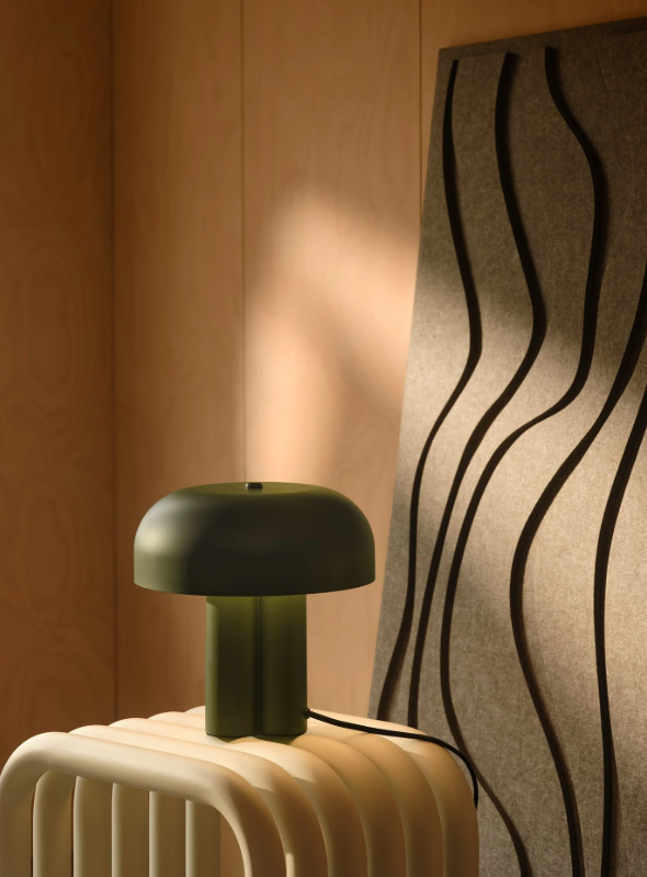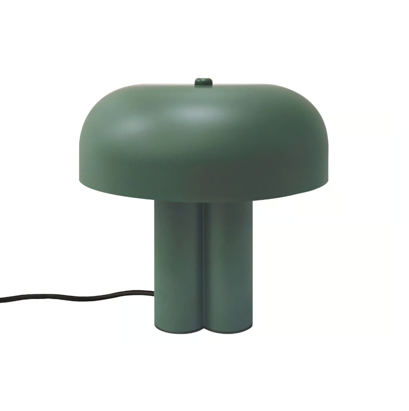 Oprawa wykonana z metalu w głębokim odcieniu ciemnej zieleni (PANTONE 19-5918 TPG) prezentuje się niezwykle szlachetnie i nowocześnie. Konstrukcja klosza sprawia, że światło jest kierowane w dół, tworząc nastrojową iluminację blatu, a jednocześnie subtelnie rozświetlając podstawę lampy. Całość dopełnia estetyczny, czarny przewód w oplocie tekstylnym o długości 150 cm.