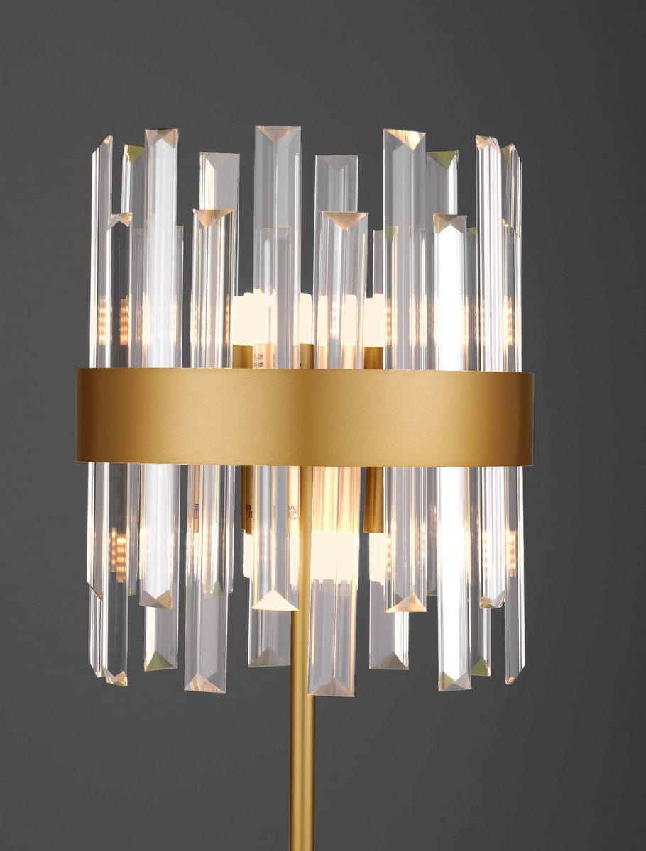 Klosz lampy składa się z metalowej obręczy w kolorze złota, na której osadzone zostały transparentne kryształowe elementy. Gładka, lekko połyskująca powierzchnia metalu harmonijnie współgra z kryształowymi detalami, tworząc wrażenie lekkości i elegancji. Kryształy w kształcie smukłych, prostych brył pięknie rozpraszają światło, tworząc dynamiczne refleksy na ścianach, co podkreśla ekskluzywny charakter wnętrza.