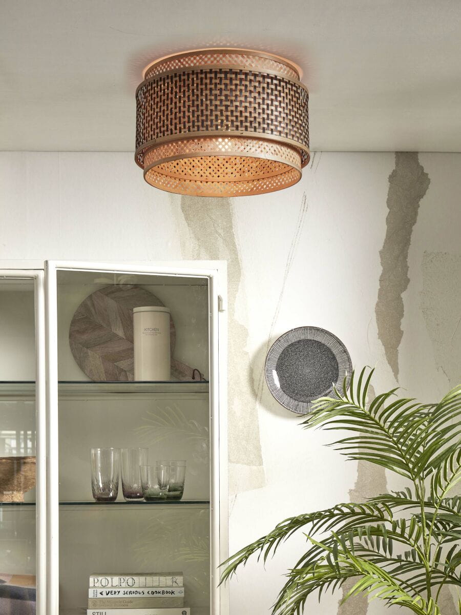 Abażur składa się z dwóch kloszy nałożonych na siebie, które wspólnie tworzą ciekawą formę. Zewnętrzny klosz został wykonany z połączenia naturalnej i czarnej plecionki bambusowej, układającej się w geometryczny wzór. Ażurowa plecionka klimatycznie rozprasza światło, tworząc wokół kloszy świetlisty wzór. Całość do sufitu przymocowana jest za pomocą czarnej podsufitki wykonanej z żelaza.