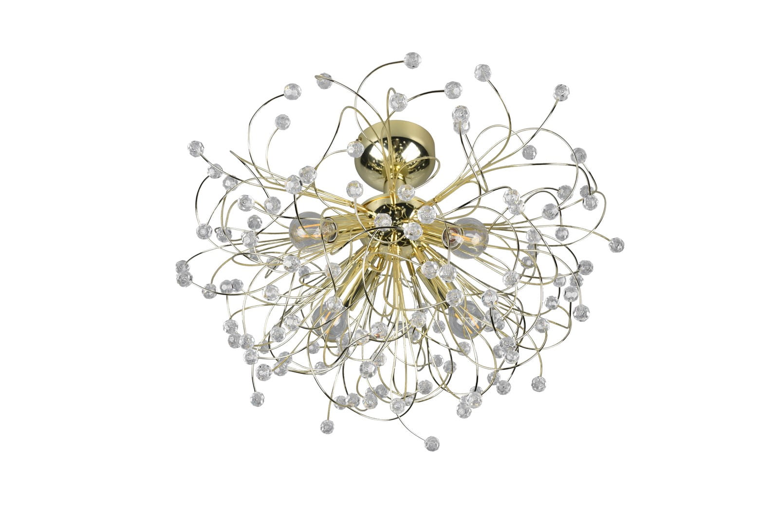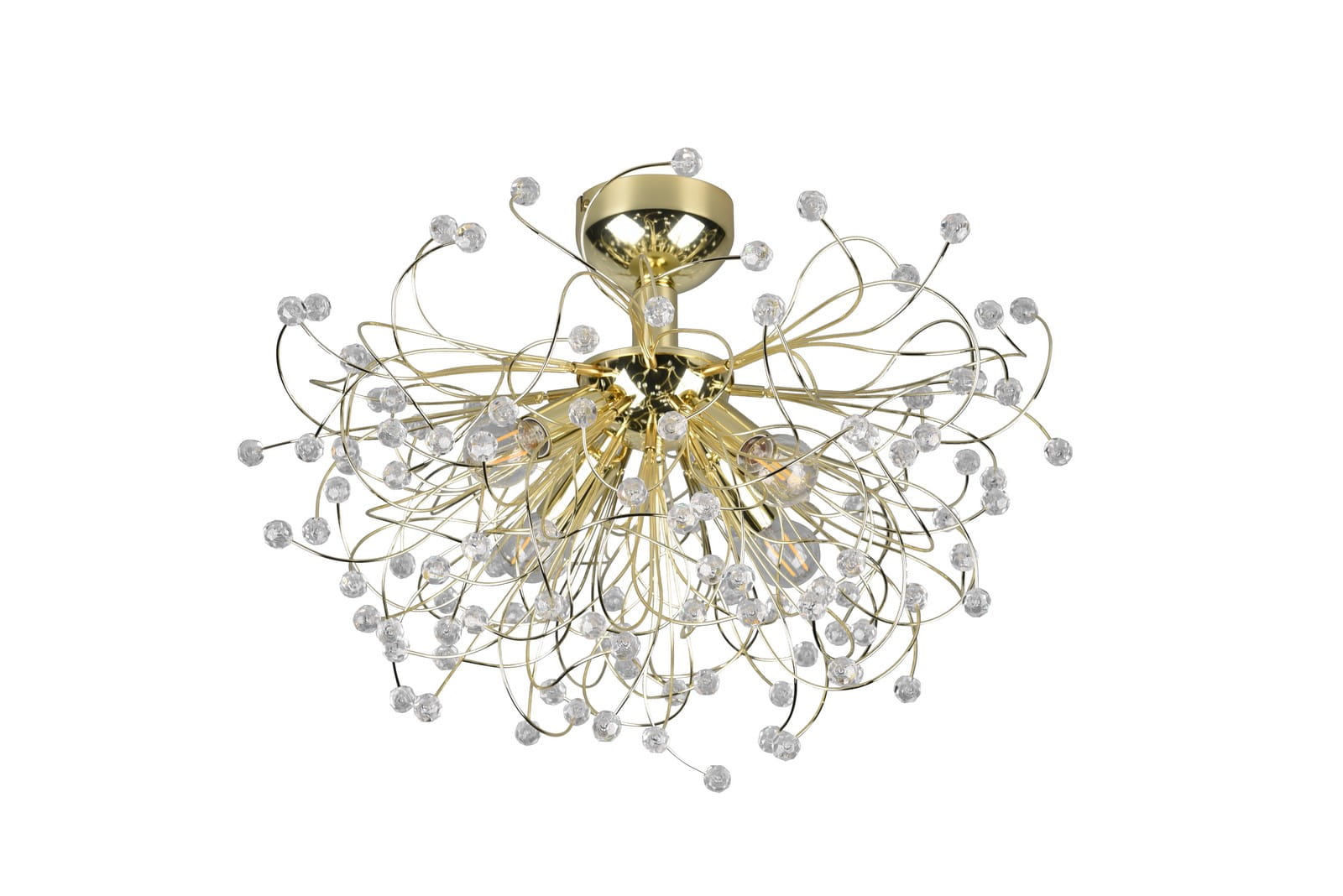 Konstrukcja lampy wykonana została z wysokiej jakości metalu w kolorze złotym. Całość utrzymuje okrągła podsufitka, z której zwisają liczne pręciki o delikatnej formie. Na ich końcach przymocowane zostały kryształy, dzięki którym otrzymujemy rewelacyjny efekt wizualny. Niebanalna budowa lampy Gloria rozgałęzia swoje ramiona we wszystkich kierunkach, co kształtem może przypominać meduzę. Fenomenalnie prezentuje się przy zapalonym, jak i zgaszonym świetle. Z zastosowaniem ściemnialnej żarówki w łatwy sposób dostosujemy jasność oświetlenia do własnych potrzeb.
