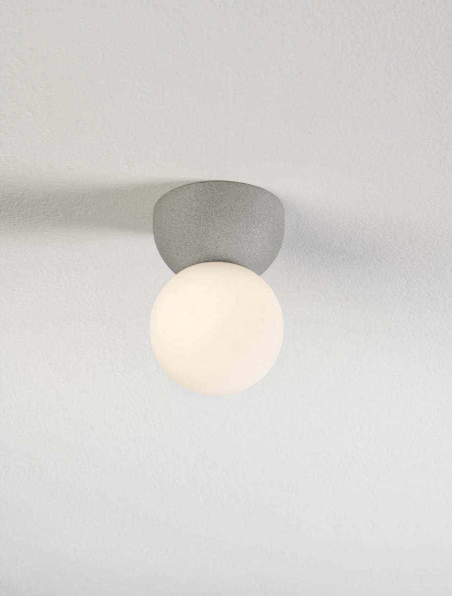 Matowa, betonowa baza podtrzymuje kulisty klosz z mlecznego szkła, który rozprasza światło, tworząc miękką i równomierną poświatę. Trosila nie zawiera źródła światła w zestawie, ale została przystosowana do ściemnialnych żarówek, co pozwala dopasować natężenie oświetlenia do aktualnych potrzeb i nastroju.