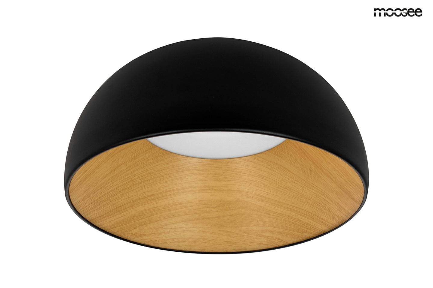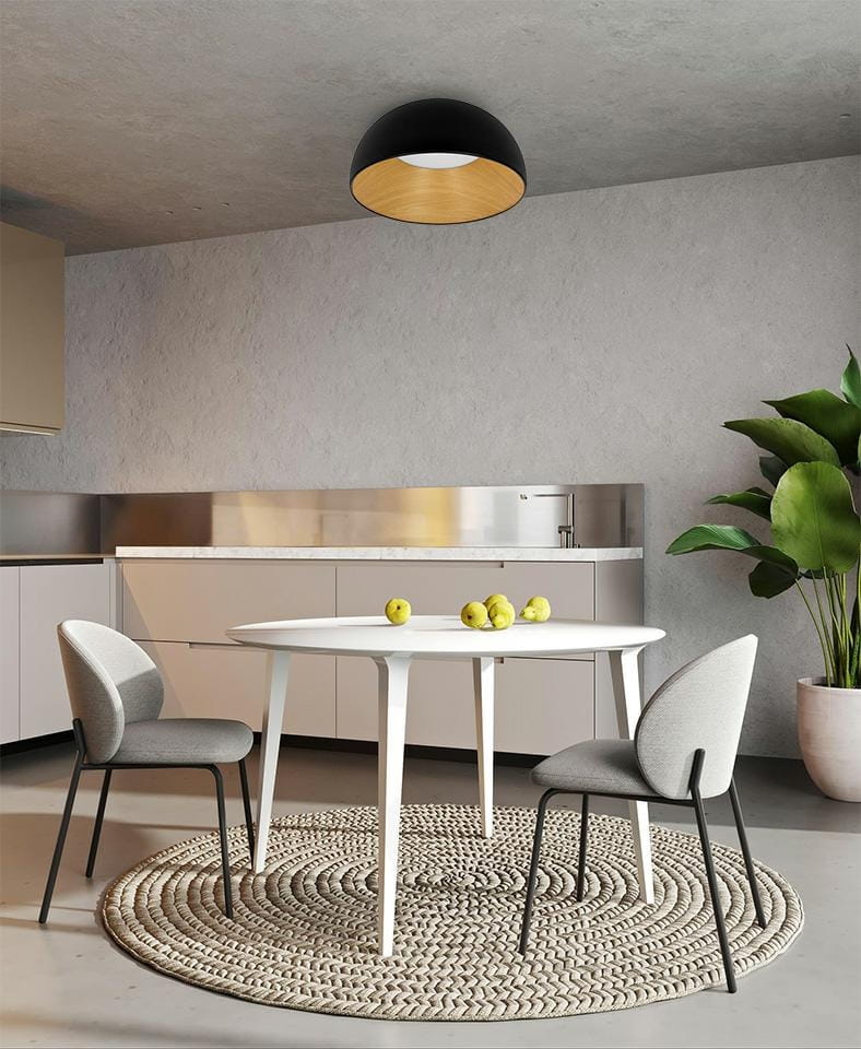Prosty, półokrągły klosz wykonano z metalu i aluminium w klasycznym czarnym kolorze. Wnętrze lampy zostało wykończone materiałem imitującym naturalne drewno, co dodaje całości ciepła i przytulności. Naturalny odcień drewna z widocznymi słojami, idealnie komponuje się metalowym, czarnym kloszem, tworząc ciekawy kontrast.