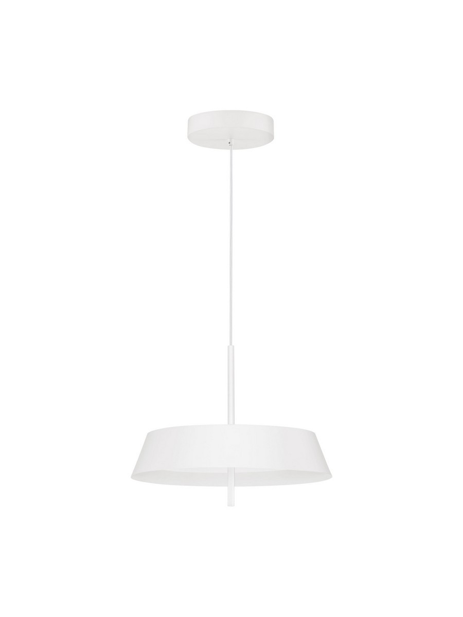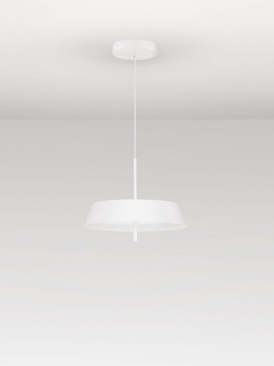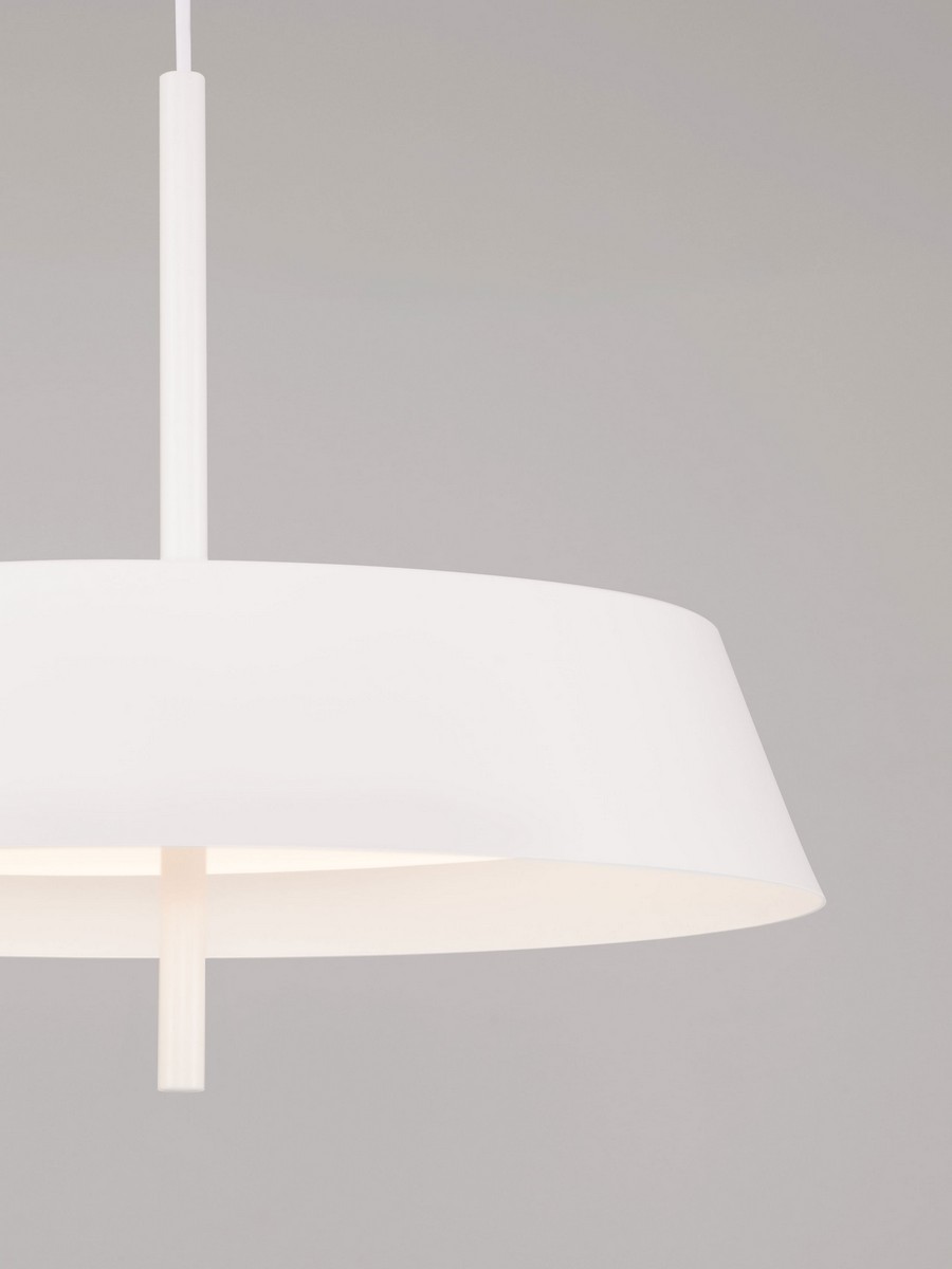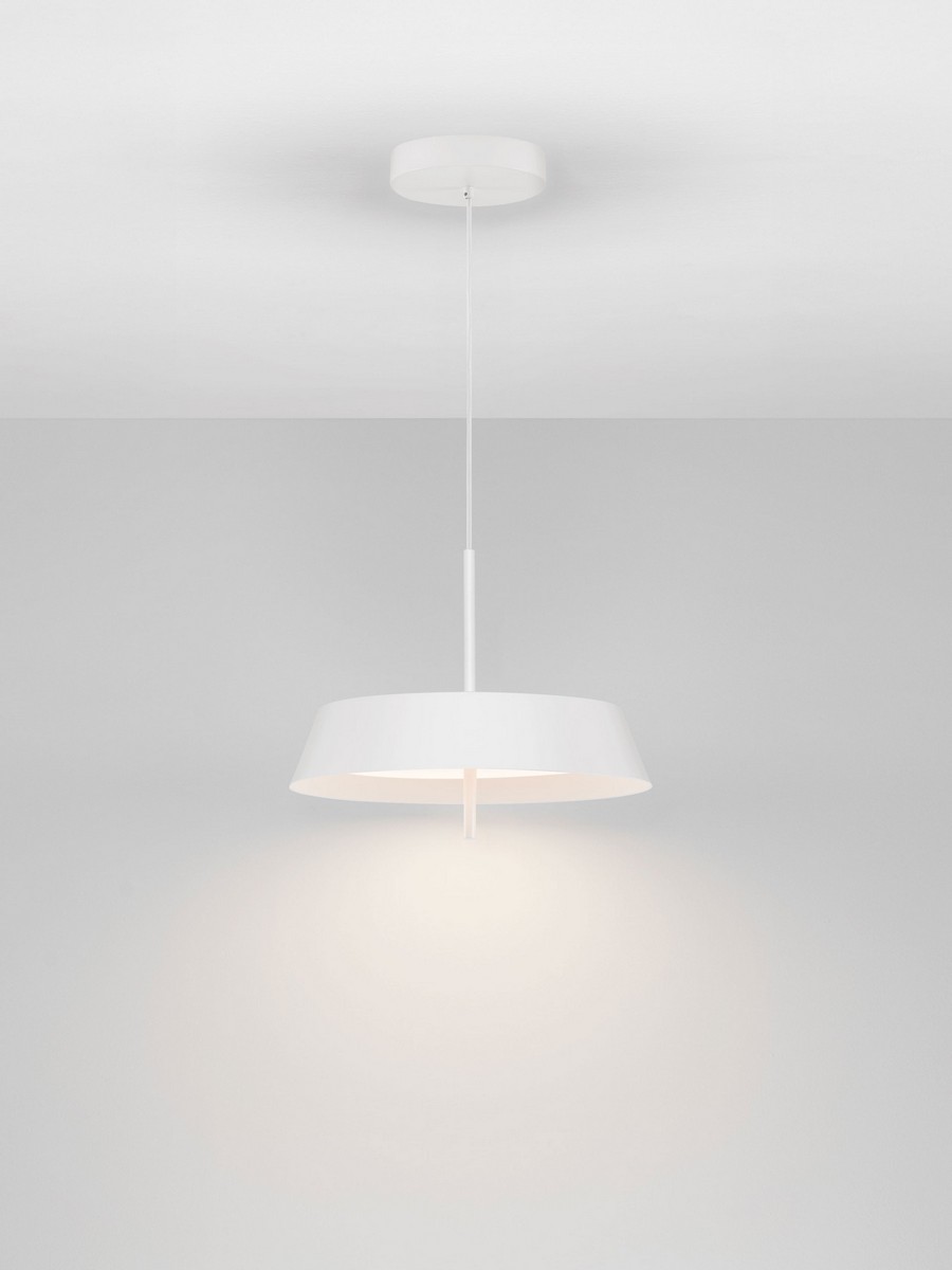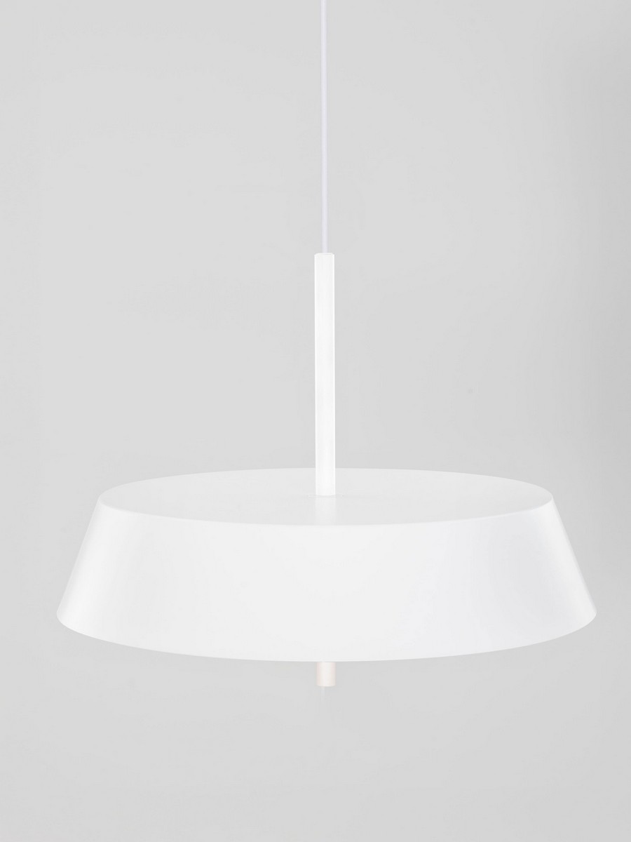 Lampa wisząca Aguila to subtelna oprawa o geometrycznej formie, która wprowadza do wnętrza nowoczesny styl i wizualną lekkość. Wariant o szerokości 45 cm idealnie nadaje się do średnich i dużych pomieszczeń, stanowiąc wyrazisty, ale nienachalny element dekoracyjny. Smukła konstrukcja klosza, wykonana z aluminium i stali, została pokryta eleganckim, matowym białym lakierem, który doskonale komponuje się z jasnymi, skandynawskimi oraz nowoczesnymi aranżacjami.