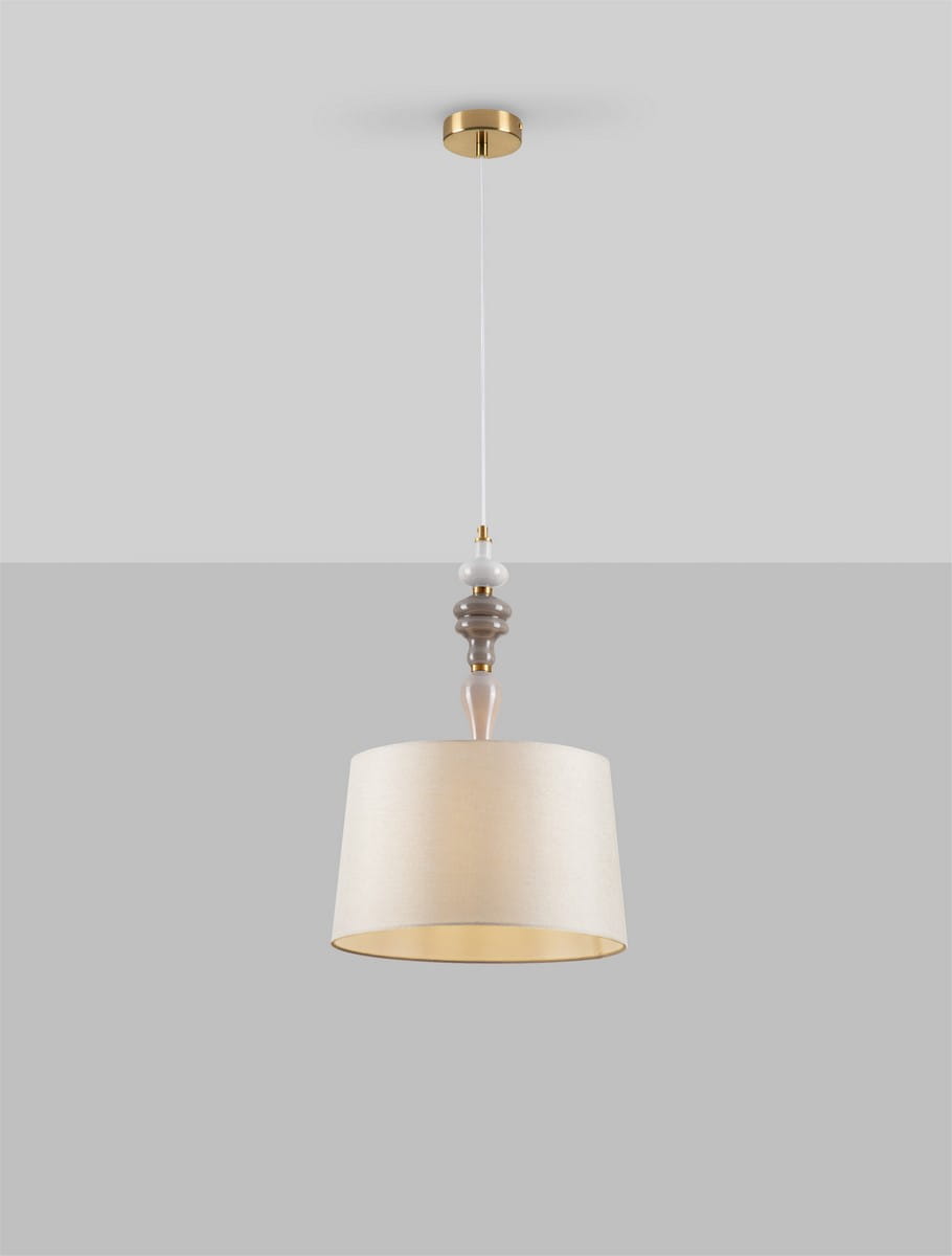 Lampa wisząca Alem to eleganckie i stylowe oświetlenie, które doskonale wpisuje się w klasyczne wnętrza, nadając im wyrafinowanego charakteru. Lampa wykonana została z połączenia kilku materiałów najwyższej jakości. Podsufitka oraz główna konstrukcja zostały stworzone z trwałego metalu, co gwarantuje solidność i długowieczność. Dekoracyjne elementy przypominające koraliki o organicznym kształcie wykonane zostały z ceramiki, które dodają subtelnej elegancji oraz podkreślają wyjątkowy design lamp. Całość dopełnia klosz z tkaniny, który subtelnie przepuszcza światło.