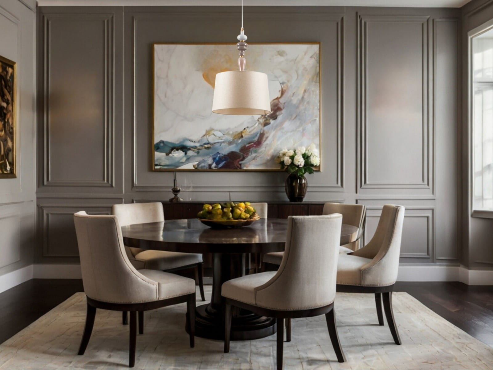 Kolorystyka lampy to subtelne połączenie odcieni beżu, bieli i szarości z elementami złotego wykończnia, które wprowadzają do wnętrza wyrafinowaną elegancję.