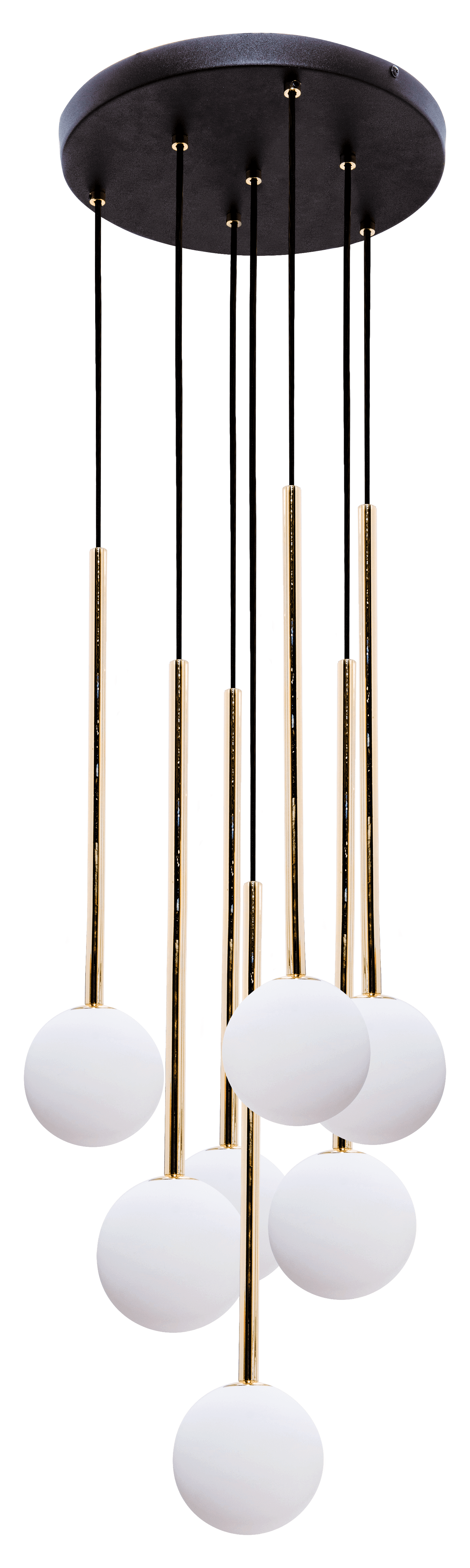 Nowoczesna lampa wisząca z kulami marki Zuma Line. Siedem mlecznych kloszy w kształcie kul rozmieszczono nieregularnie na na metalowych przewodach wychodzących z czarnej podsufitki. Mleczne szkło subtelnie tłumi światło, zapewniając równomierne rozproszenie.