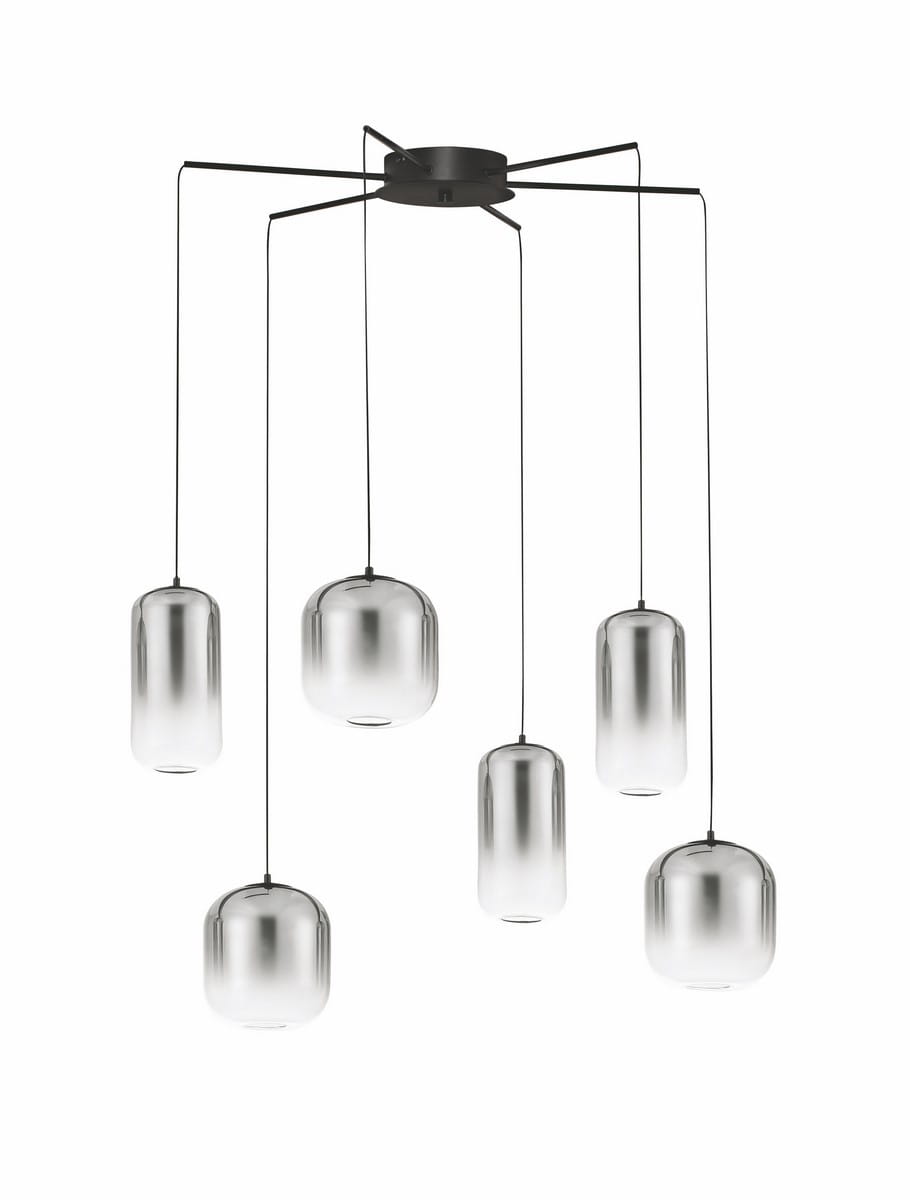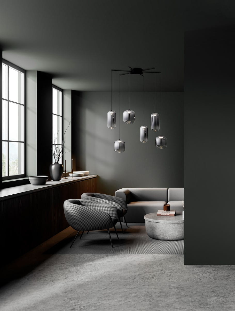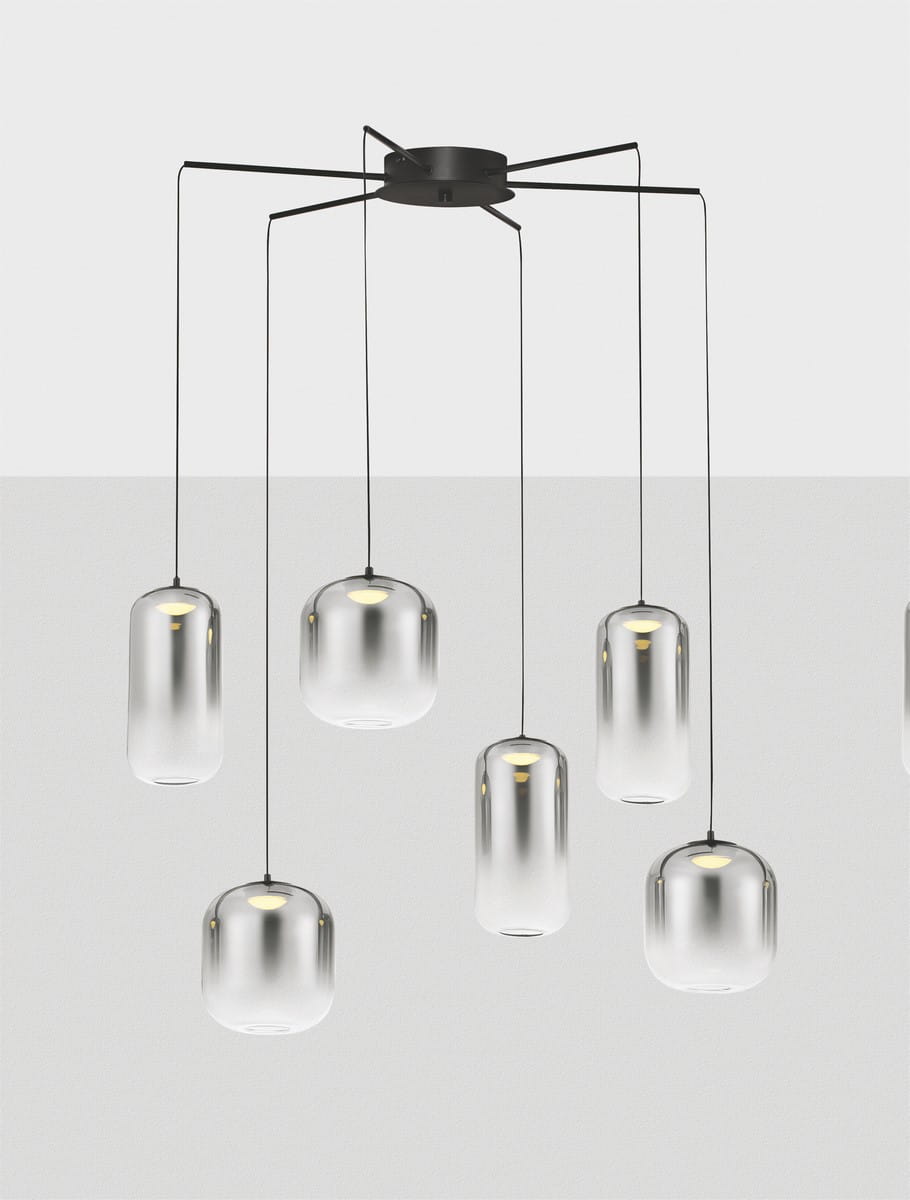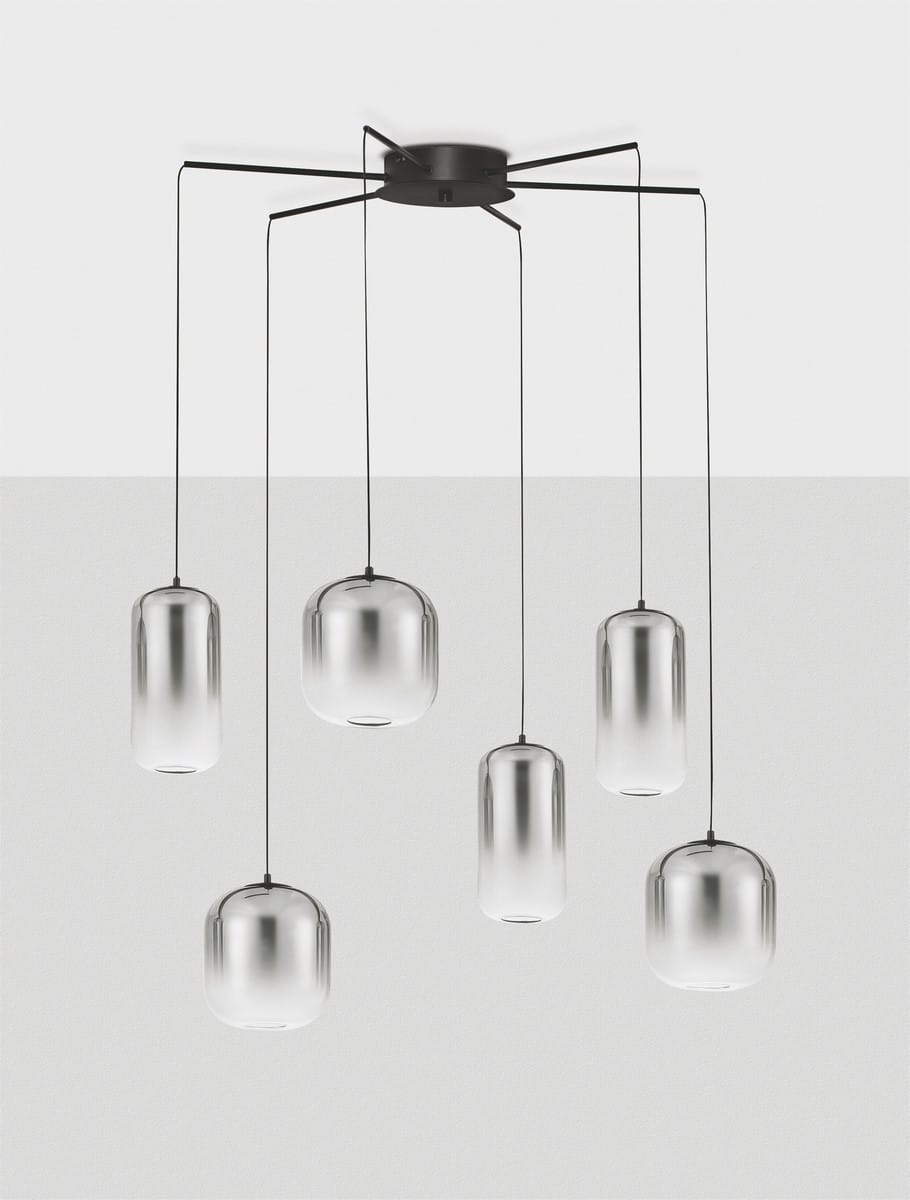 Klosze lampy Anuco mają subtelny, cylindryczny kształt, a ich dymione wykończenie tworzy wyjątkowy efekt świetlny, nadając wnętrzu miękkiego, rozproszonego światła. Lampa składa się z kilku zwisających ramion, które harmonijnie współgrają, tworząc efektowne kompozycje świetlne. Ich zróżnicowana wysokość dodaje lampie dynamiki i lekkości, idealnie podkreślając przestrzenie w stylu nowoczesnym, industrialnym lub glamour.