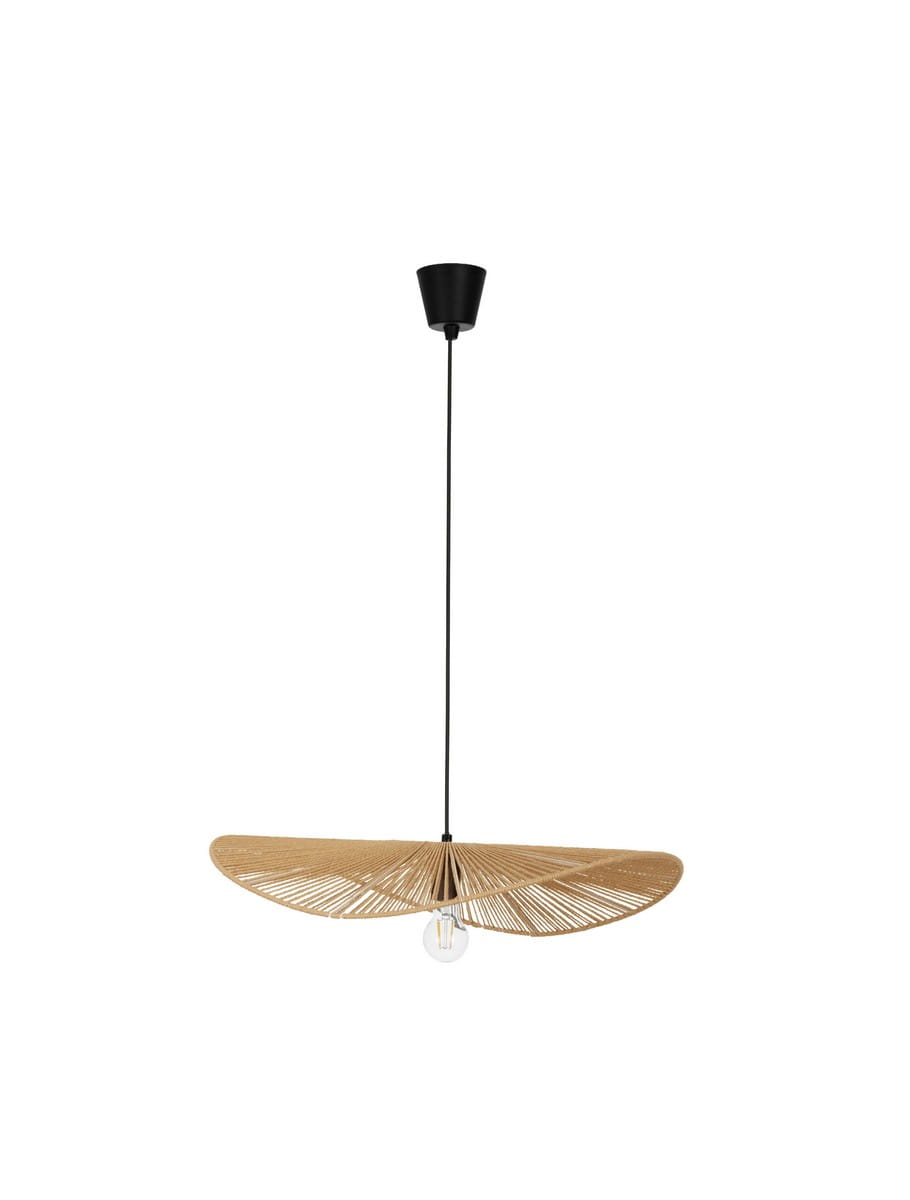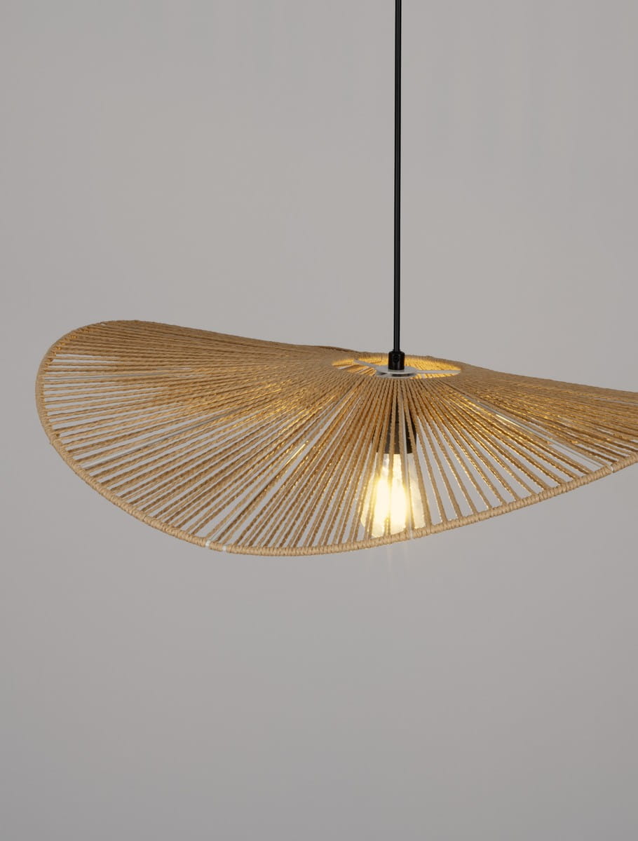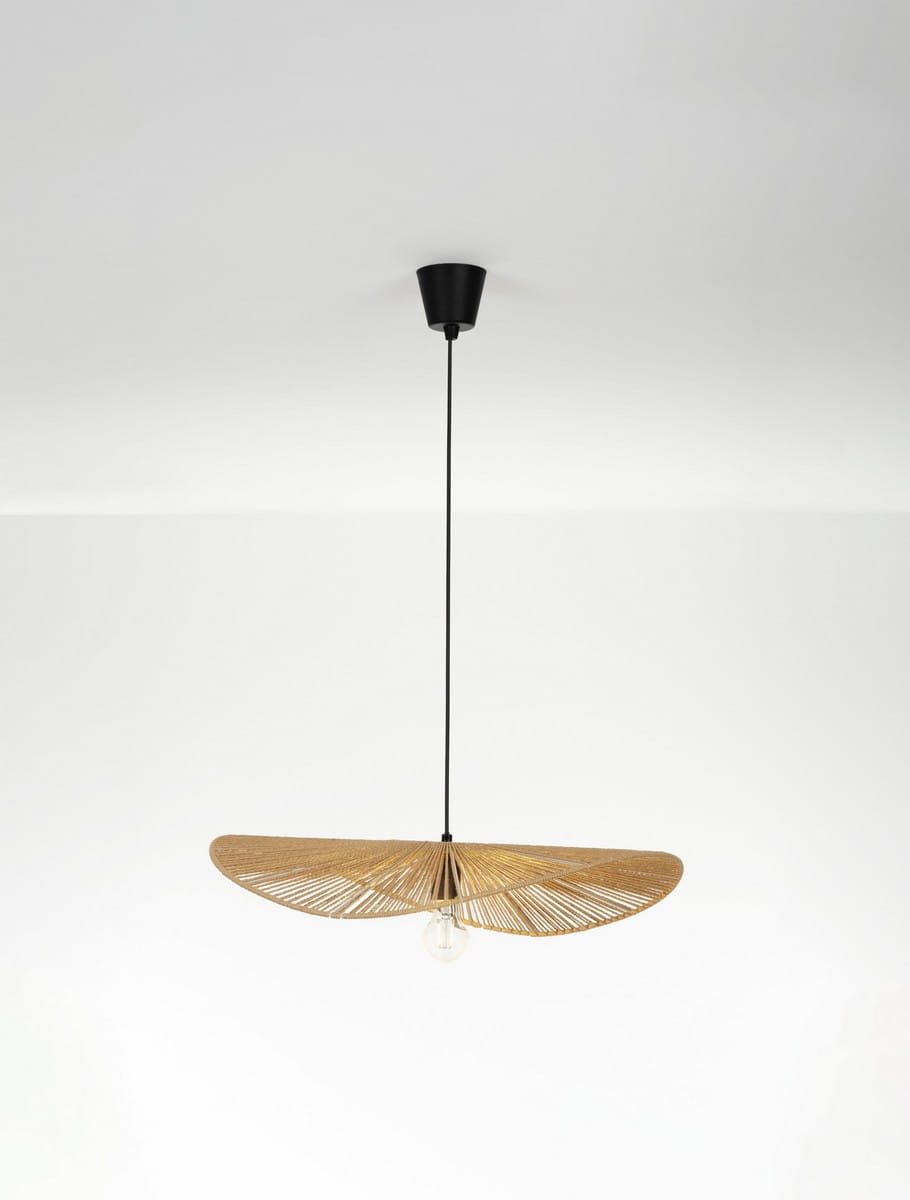 Delikatna, otwarta forma klosza sprawia, że światło swobodnie rozchodzi się po pomieszczeniu, tworząc miękką i przyjemną atmosferę. Naturalny odcień sznurka w połączeniu z minimalistycznym, czarnym zawieszeniem nadaje lampie wyważony, boho charakter, który doskonale wpasuje się w aranżacje inspirowane naturą, style japandi, skandynawski czy nowoczesny minimalizm.