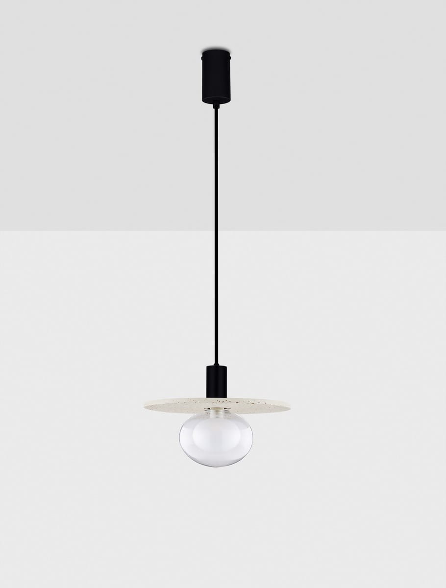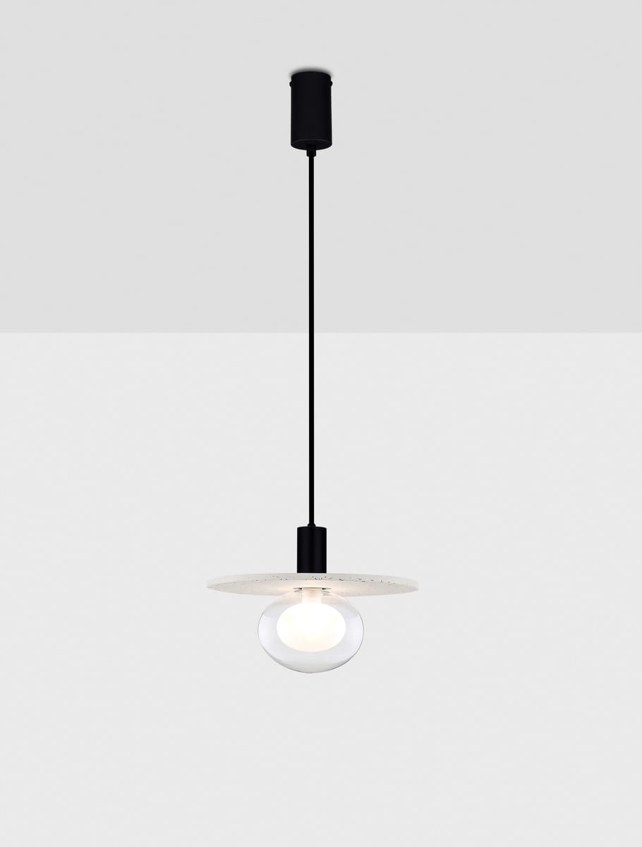 Jej klosz to wyjątkowy element – minimalistyczny betonowy dysk o subtelnej strukturze, nadaje każdej lampie niepowtarzalny charakter. Zawieszony centralnie szklany klosz w formie przejrzystej kuli subtelnie rozprasza światło, zapewniając przyjemną atmosferę w każdym wnętrzu.