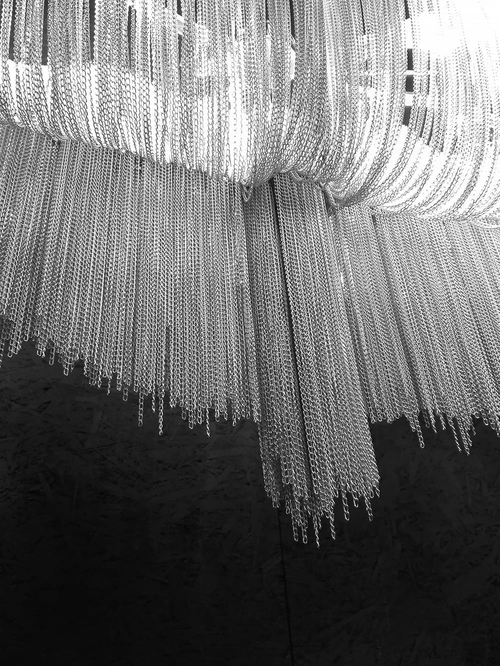 Niezwykła lampa wisząca, zainspirowana projektem Terzani Atlantis posiada nieregularne kształty, niczym fale oceanu. Została wykonana z aluminium i stalowych, drobnych łańcuszków, dzięki którym światło jest przyjemnie rozproszone, a sama lampa wygląda ekskluzywnie i elegancko. W środku lampy znajduje się aż 10 mocowań na żarówki, co daje całkiem intensywne i równomierne oświetlenie.