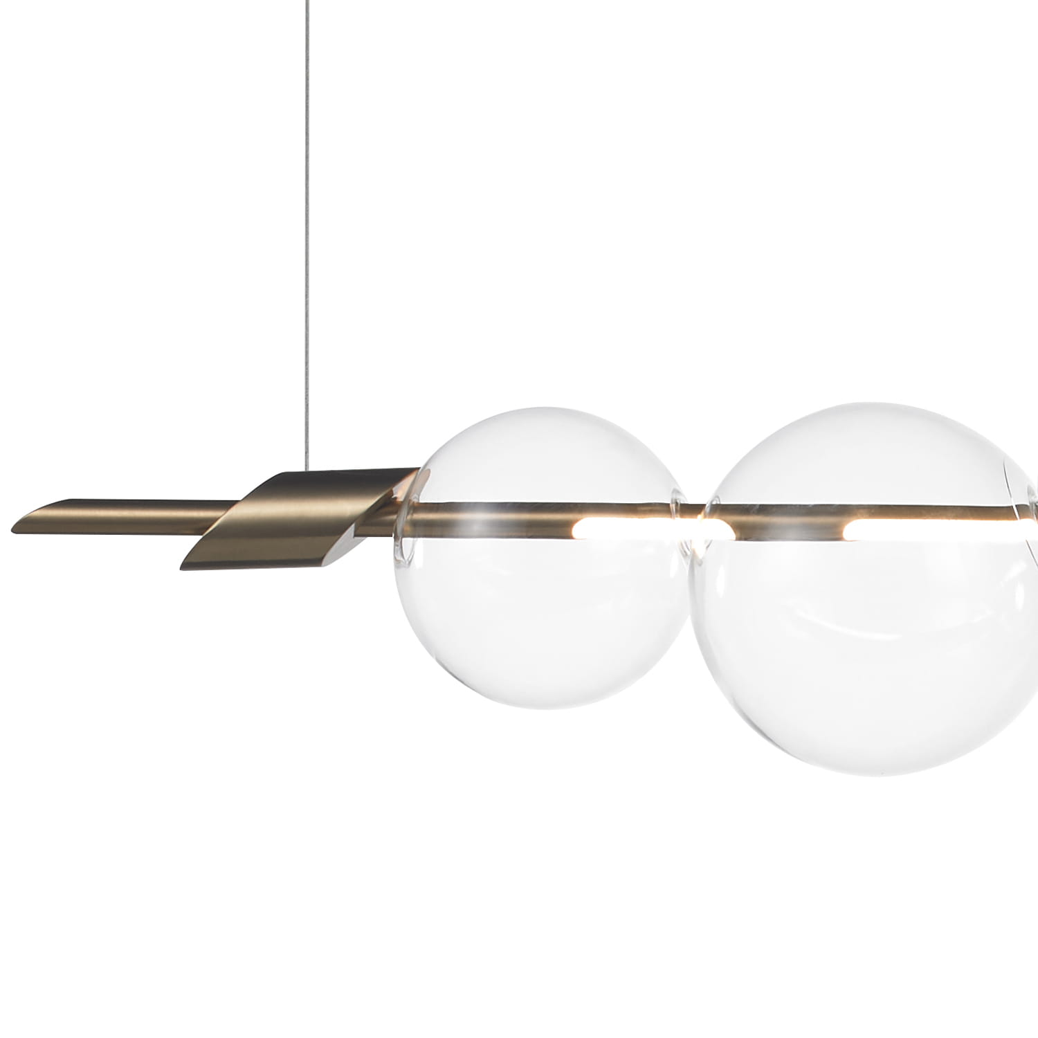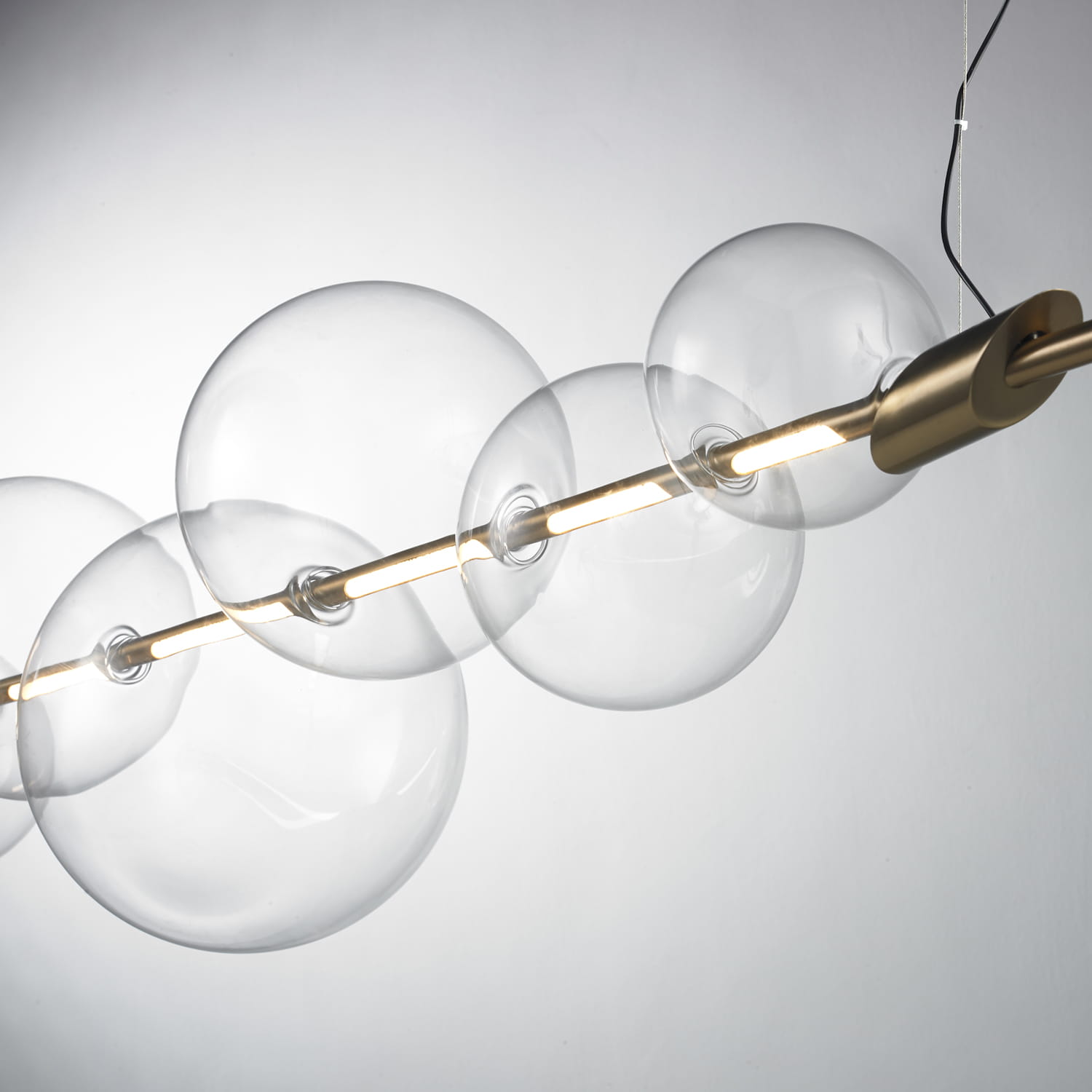 Minimalistyczne połączenie metalowej rurki z 7 szklanymi kloszami nada wnętrzu nowoczesnego klimatu, tworząc wyjątkowy element dekoracyjny. Oprawa wykonana została z metalu w złotym kolorze, co idealnie komponuje się z transparentnymi kulami. Całość zawieszona jest na subtelnych kablach wykonanych z tworzywa PVC, których długość można regulować.