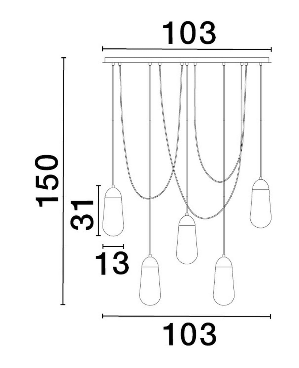 Minimalistyczne klosze o wydłużonym kształcie składają się z białej osłonki wykonanej ze szkła oraz czarnej, metalowej nakładki. Elementy płynnie łączą się ze sobą, tworząc jednolitą, owalną formę. Lampa składa się z pięciu takich kloszy, zawieszonych liniowo na długim, czarnym kablu, który tworzy swobodną i oszczędną w środkach kompozycję, dodatkowo podkreślając surowy charakter całości. Zestawienie kontrastującej, czarno-białej kolorystki jest uniwersalnym rozwiązaniem o ponadczasowym klimacie. Lampę utrzymuje podłużna podsufitka i jej liniowa forma idealnie zaprezentuje się nad kuchenną wyspą czy nad stołem w jadalni, odpowiednio oświetlając przestrzeń.