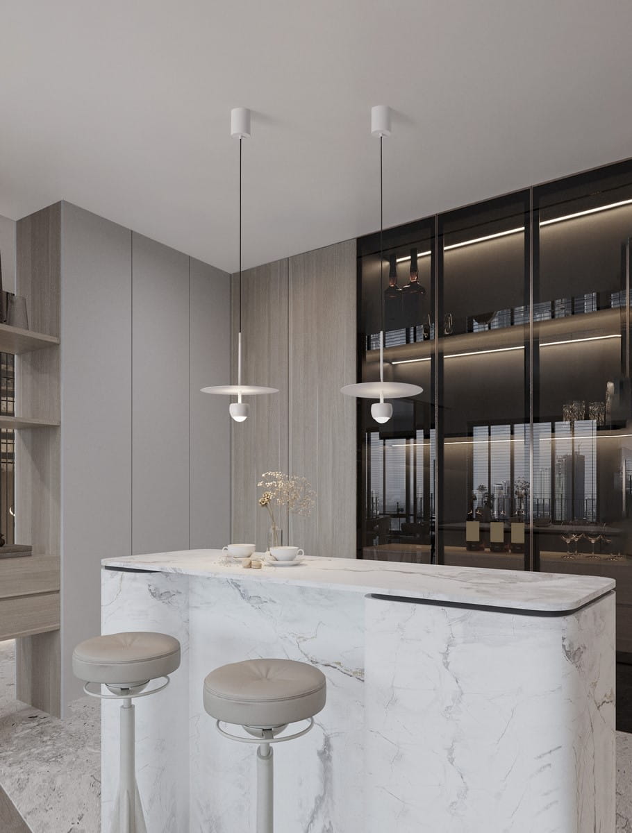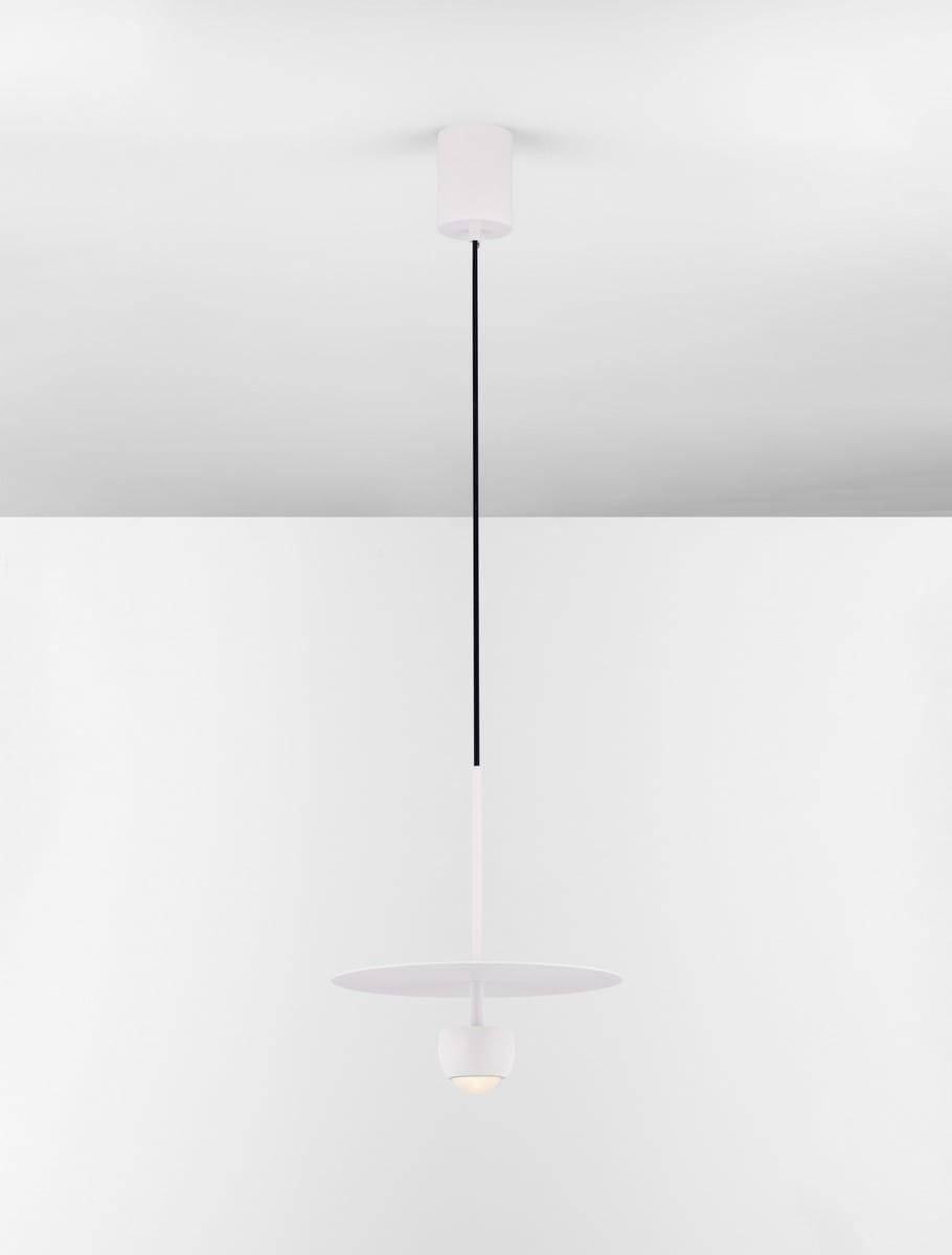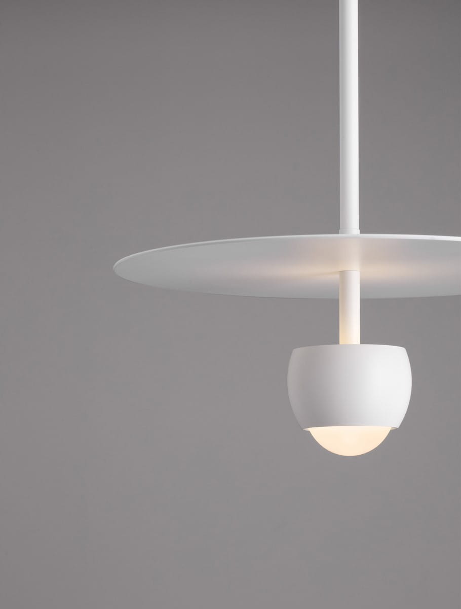 Górna część klosza w formie płaskiego dysku subtelnie rozprasza światło, tworząc przyjemną atmosferę, podczas gdy dolna, kulista część zapewnia skierowane, punktowe oświetlenie, idealne do wyeksponowania konkretnych przestrzeni. Prosty, ale jednocześnie intrygujący design sprawia, że lampa Baila pasuje zarówno do nowoczesnych salonów, jadalni, jak i przestrzeni biurowych.