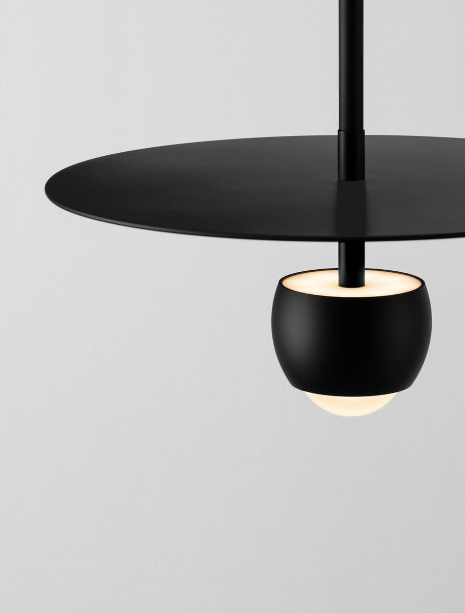 Górna część klosza w formie płaskiego dysku subtelnie rozprasza światło, tworząc przyjemną atmosferę, podczas gdy dolna, kulista część zapewnia skierowane, punktowe oświetlenie, idealne do wyeksponowania konkretnych przestrzeni. Prosty, ale jednocześnie intrygujący design sprawia, że lampa Baila pasuje zarówno do nowoczesnych salonów, jadalni, jak i przestrzeni biurowych.