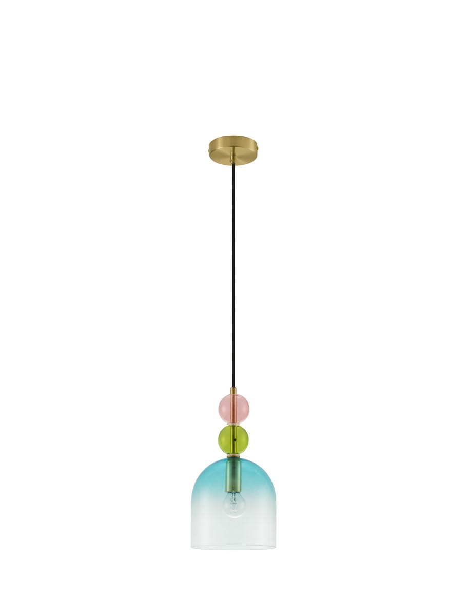 Lampa kojarzy się ze wzornictwem stylu Memphis, wyróżniającego się prowokującym i nieskrępowanym stylem, często zabawnym i odważnym. Połączenie geometrycznych, obłych kształtów w kontrastujących kolorach tworzy niepowtarzalną i niezwykle piękną kompozycję, która będzie ozdabiać wnętrze niczym misternie wykonana biżuteria. Asymetryczne klosze w pastelowych kolorach wykonane zostały z transparentnego szkła i wspólnie tworzą geometryczne formy o subtelnej linii. Wewnątrz każdego z kloszy znajduje się złota, metalowa tuba zakończona źródłem światła. Całość utrzymuje czarny kabel, wychodzący z okrągłej podsufitki, również w złotym kolorze.