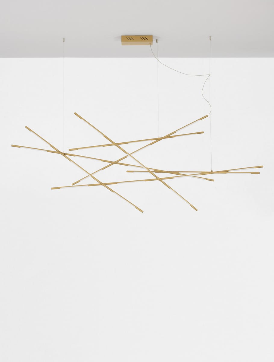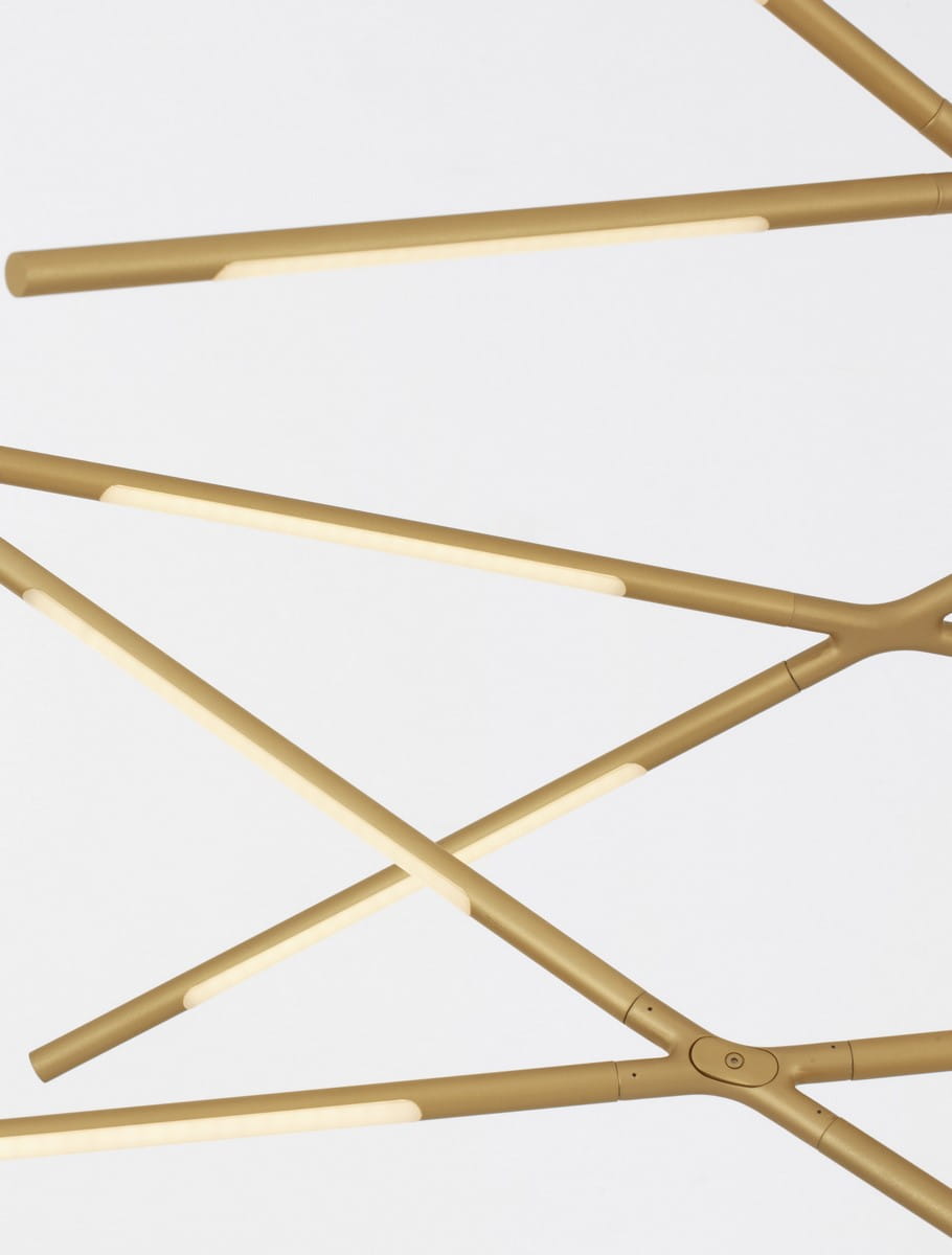 Lampa Bell Grande składa się z sześciu metalowych ramion ułożonych w dynamiczny, asymetryczny wzór, który dodaje wnętrzu nowoczesnego charakteru. Metalowa konstrukcja malowana jest proszkowo na kolor złoty, co nadaje lampie luksusowego wyglądu. Każde z ramion zakończone jest akrylową osłonką, pod którą znajduje się wbudowane źródło światła LED. Osłonki te rozpraszają światło, tworząc przyjemną, równomierną poświatę a wbudowane LED-y zapewniają energooszczędność oraz długowieczność, tworząc idealne oświetlenie do przestrzeni jadalnianych, salonów czy kuchni.