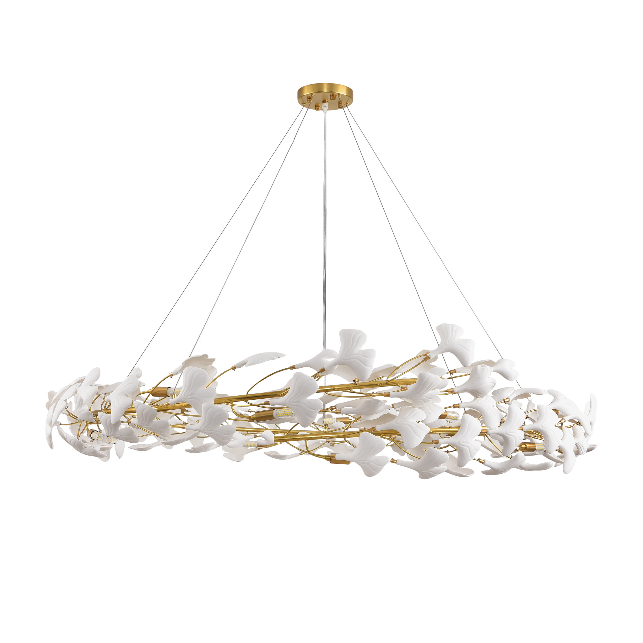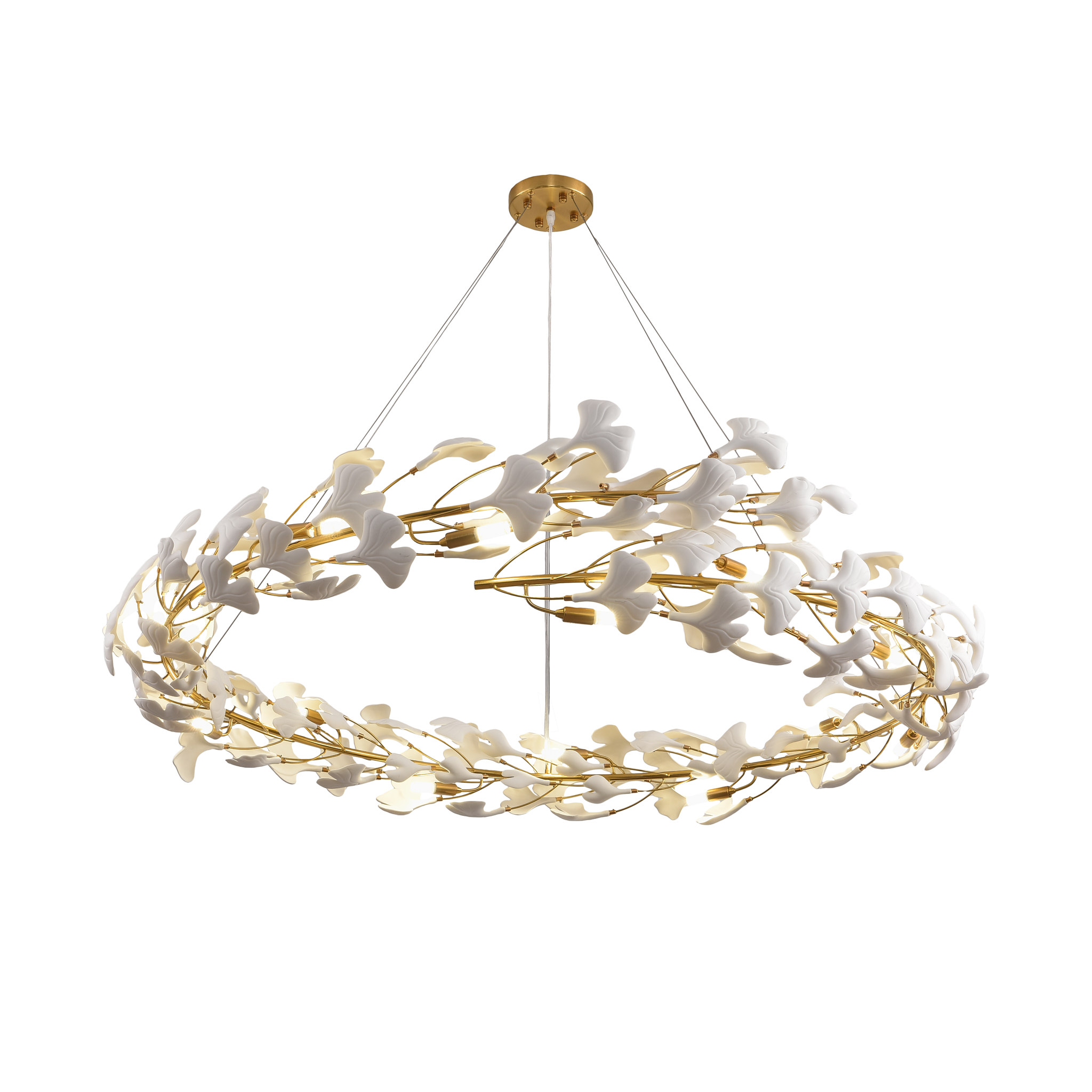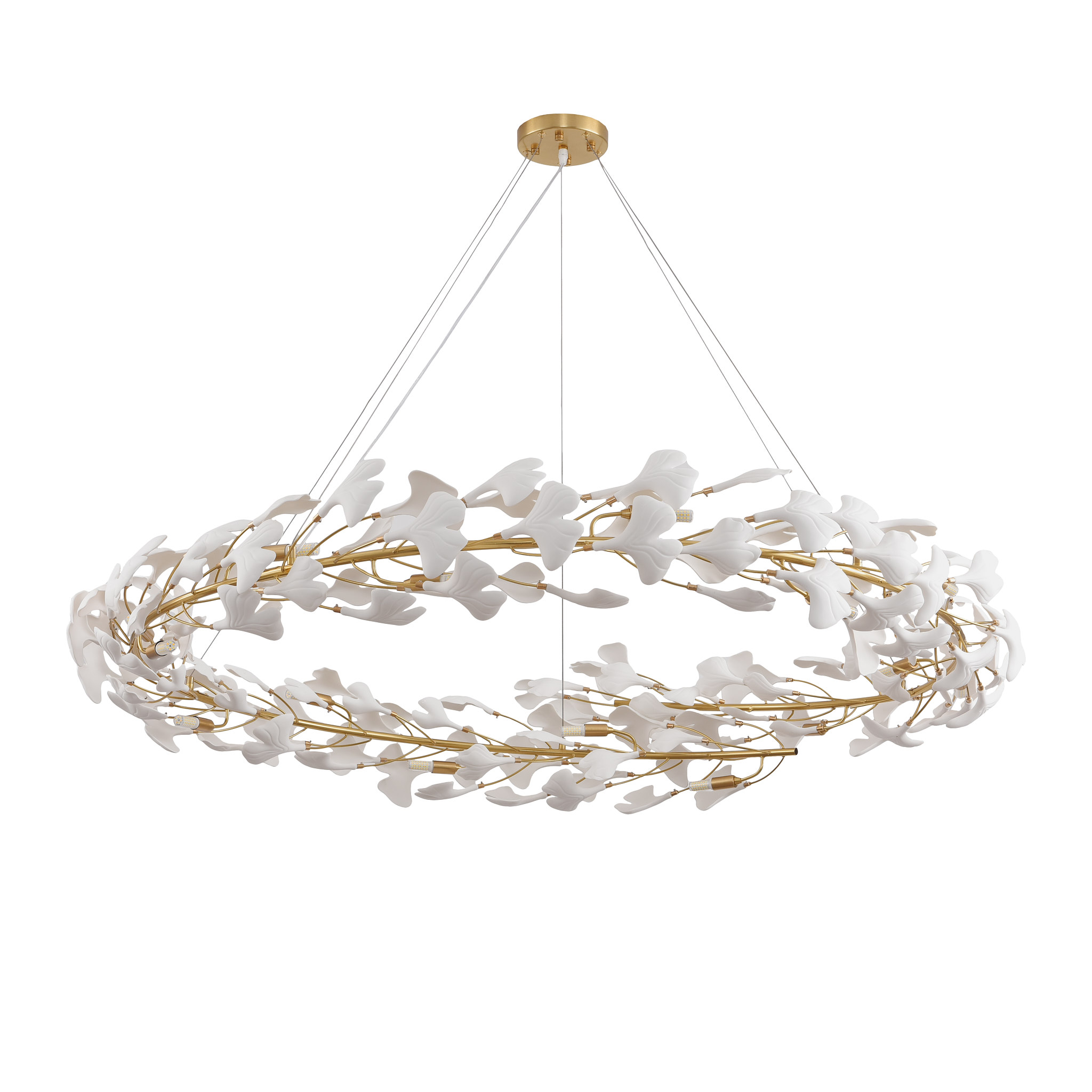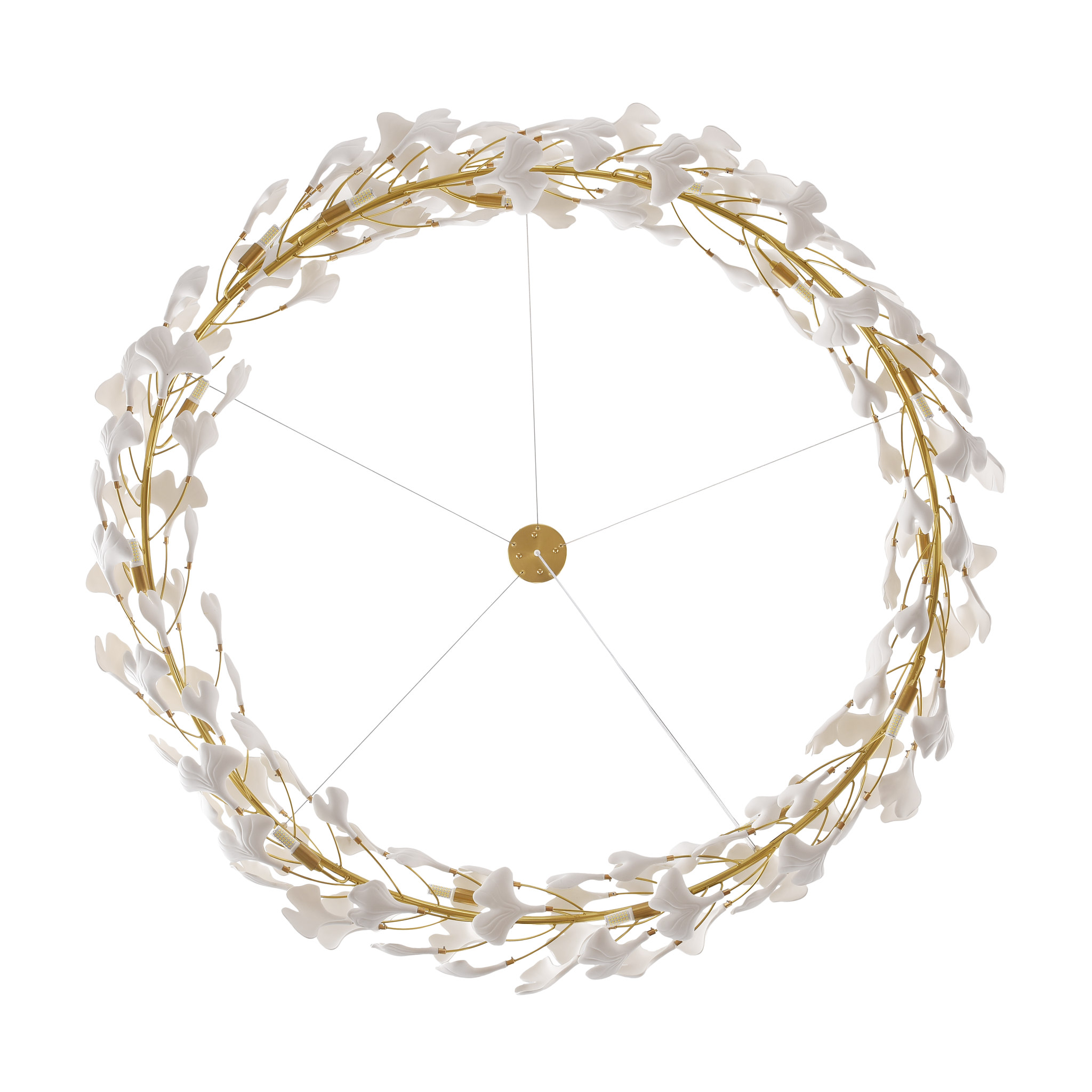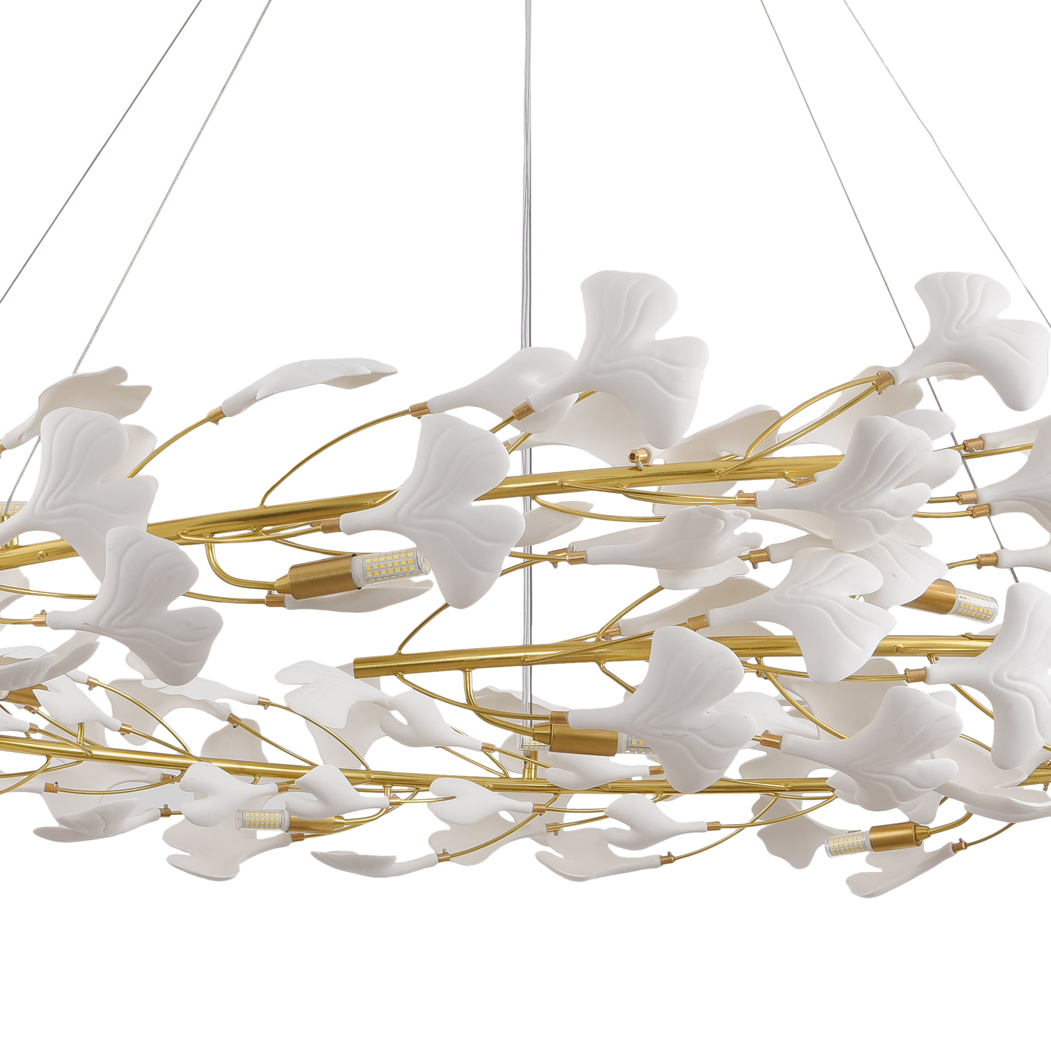 Lampa wisząca BOTANIKA 150 to niezwykła kompozycja światła i formy, inspirowana naturą i sztuką. Jej wyjątkowy projekt bazuje na motywie liści Ginkgo – symbolu długowieczności i harmonii – które zostały misternie odwzorowane z matowej, białej ceramiki. Delikatne listki oplatają metalowy stelaż w kolorze polerowanego złota, tworząc efektowny, przestrzenny wieniec.