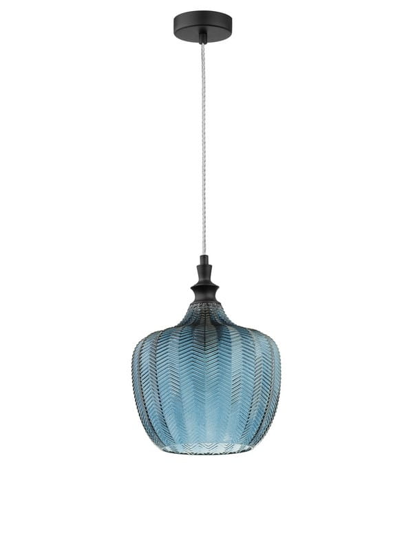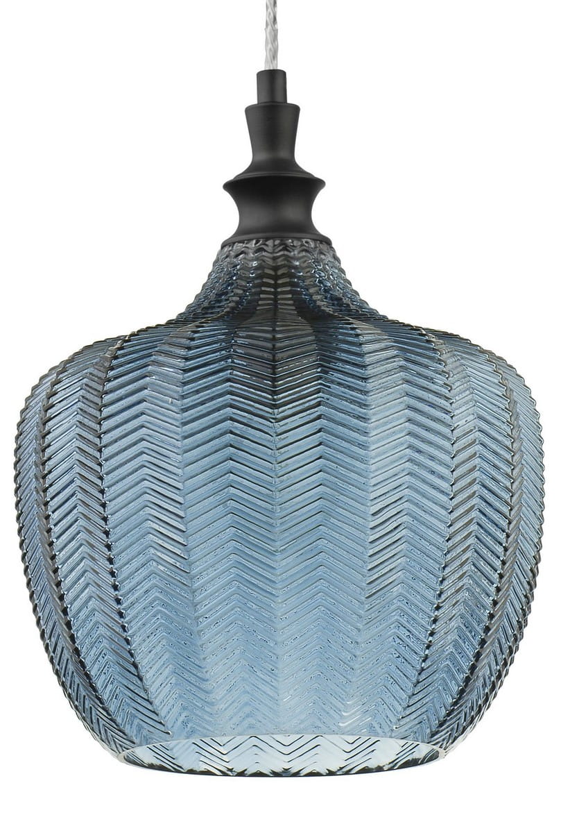 Lampa wisząca Burgos to wyjątkowy przykład harmonijnego połączenia klasyki z nowoczesnym podejściem do formy. Wykonana z grubego, niebieskiego szkła o wyraźnej fakturze w jodełkowy wzór, stanowi elegancki i ponadczasowy akcent dekoracyjny, który idealnie odnajdzie się w różnorodnych aranżacjach wnętrz – od stylu retro, przez mid-century modern, aż po współczesny minimalizm z odrobiną koloru.