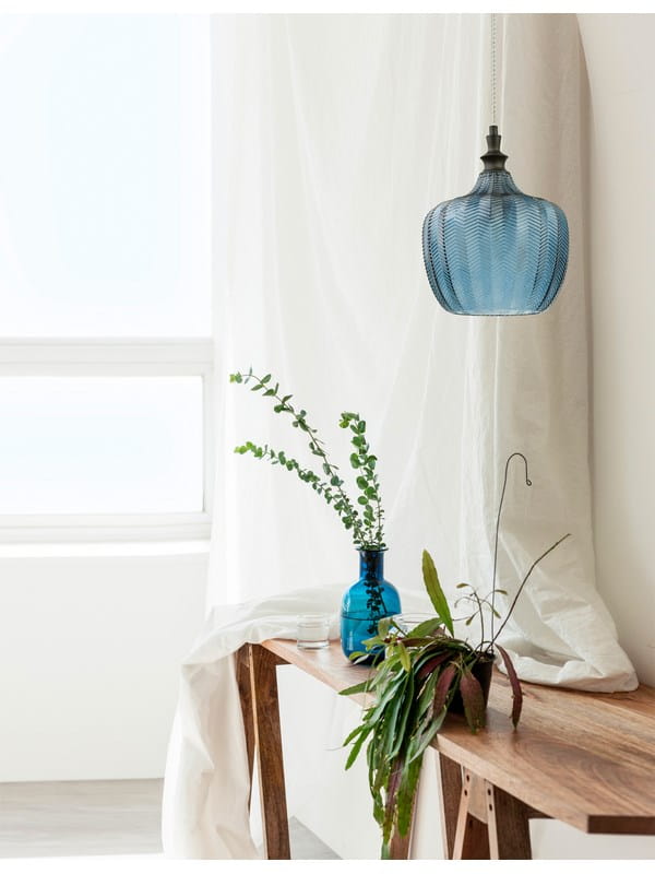 Klosz lampy przyciąga uwagę swoją unikalną formą – delikatnie zaokrągloną i stylowo profilowaną. Jego niebieskie zabarwienie tworzy przyjemną grę światła i cienia, emitując ciepły, lekko przytłumiony blask, który sprzyja relaksowi i budowaniu nastrojowej atmosfery. Czarne detale, takie jak oprawka i podsufitka, kontrastują z barwą szkła, dodając całości wyrazistego charakteru.