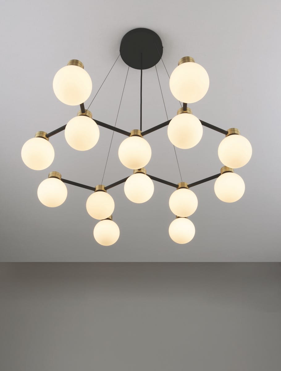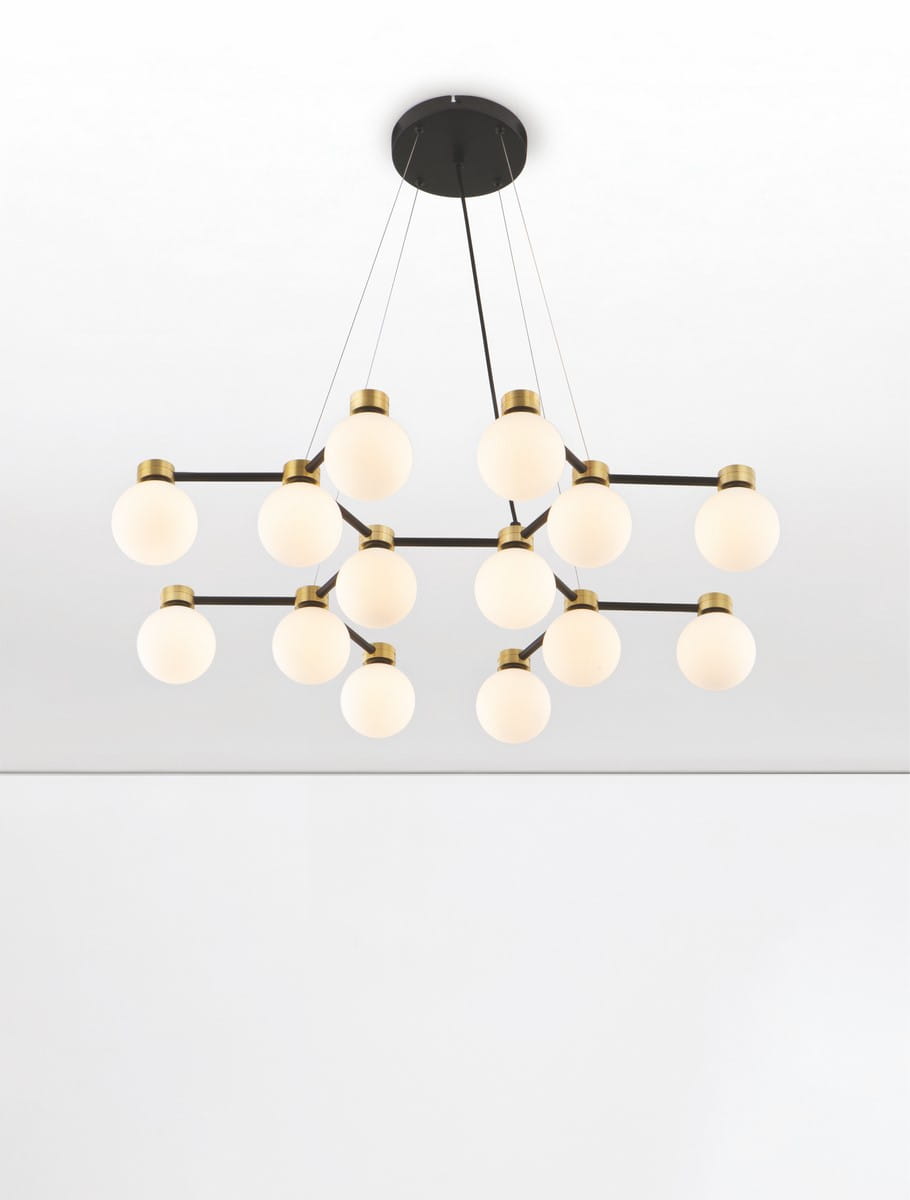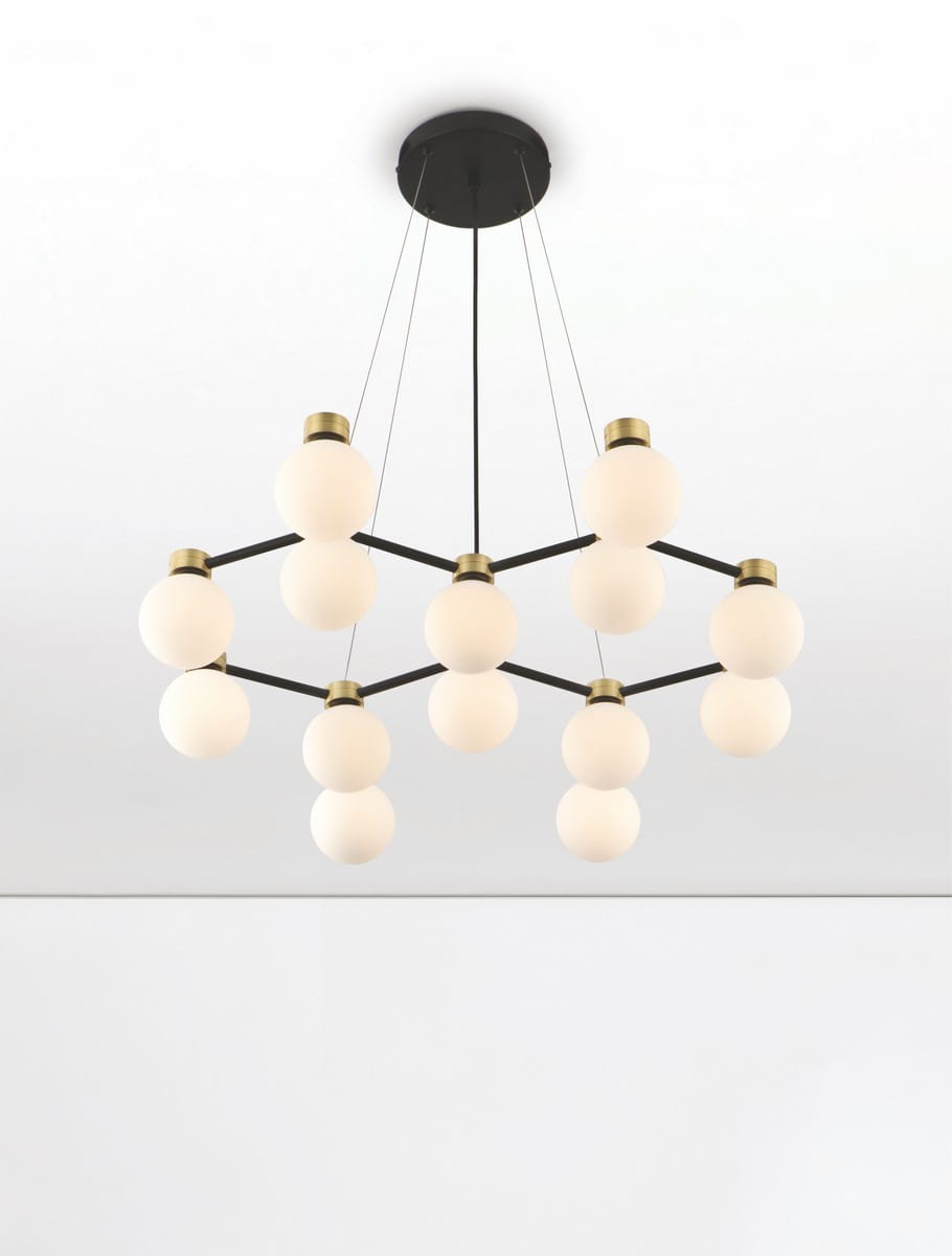 Konstrukcja lampy opiera się na smukłych, czarnych ramionach, które tworzą geometryczny, rozłożysty układ. Każde z ramion zwieńczone jest białymi, kulistymi kloszami wykonanymi z mlecznego szkła, co nadaje całości subtelnej lekkości i zapewnia przyjemne, rozproszone światło. Elementy w złotym kolorze dodają lampie wyrafinowanego blasku, tworząc elegancki kontrast z czarną podstawą.