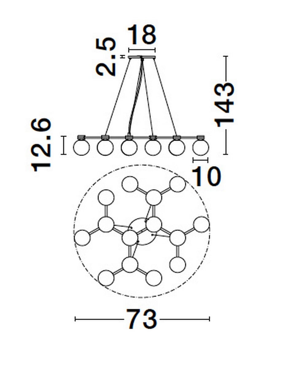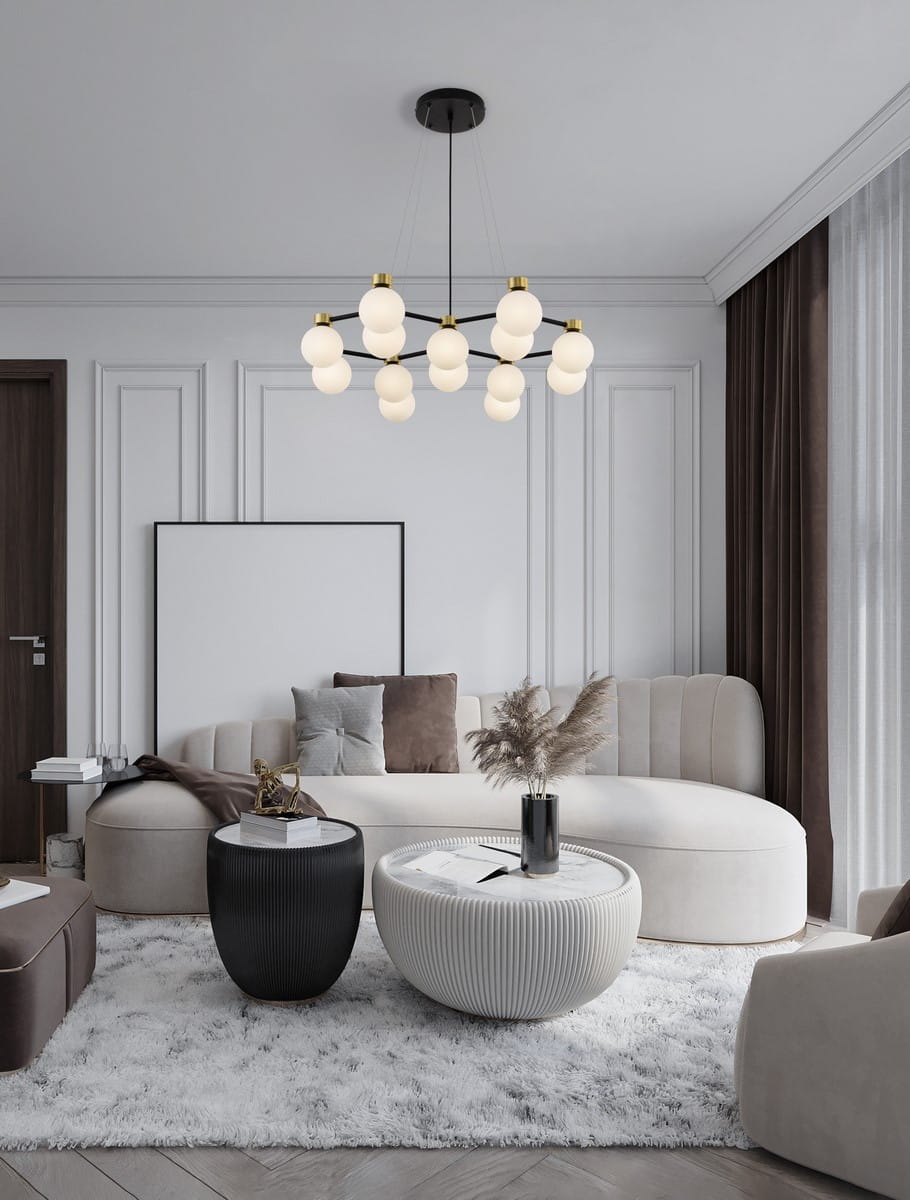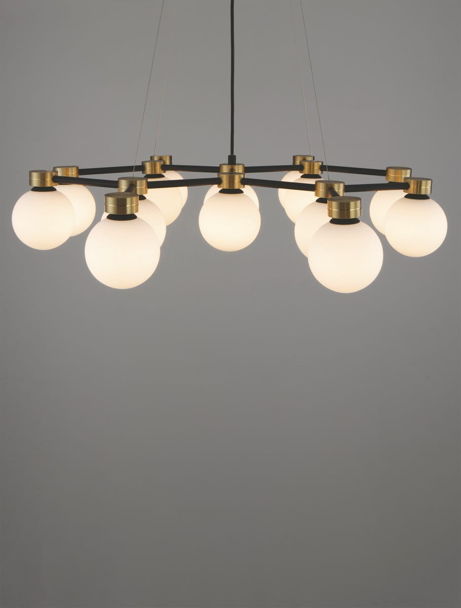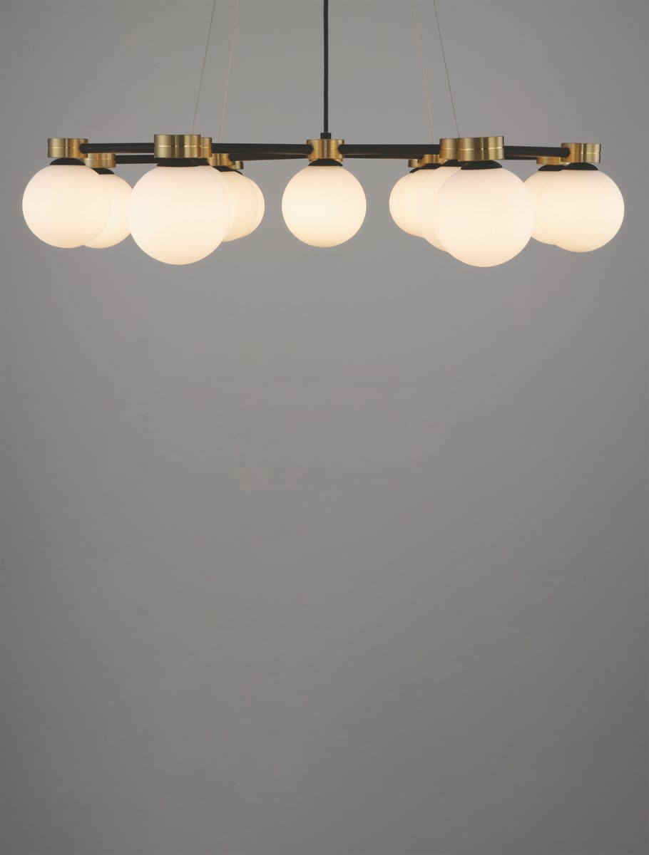 Konstrukcja lampy opiera się na smukłych, czarnych ramionach, które tworzą geometryczny, rozłożysty układ. Każde z ramion zwieńczone jest białymi, kulistymi kloszami wykonanymi z mlecznego szkła, co nadaje całości subtelnej lekkości i zapewnia przyjemne, rozproszone światło. Elementy w złotym kolorze dodają lampie wyrafinowanego blasku, tworząc elegancki kontrast z czarną podstawą.
