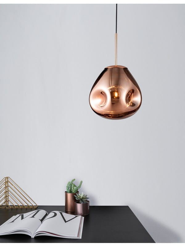 Szklany klosz lampy jest delikatnie nieregularny, co w połączeniu z błyszczącą powierzchnią tworzy dynamiczną grę odbić i refleksów świetlnych. Lampa Carmen najlepiej prezentuje się jako pojedynczy akcent nad stolikiem kawowym lub w serii nad wyspą kuchenną, gdzie pełni nie tylko funkcję użytkową, ale również dekoracyjną.