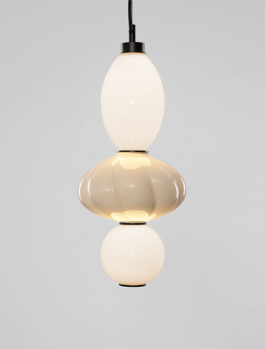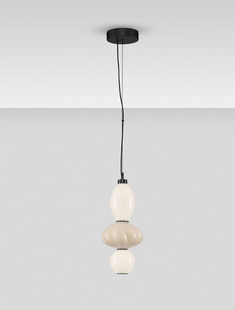 Delikatnie zaokrąglone kształty, zróżnicowana wielkość segmentów oraz starannie dobrane proporcje sprawiają, że lampy Casurno stają się nie tylko źródłem światła, ale także ozdobą wnętrza – zarówno jako pojedyncze akcenty, jak i zestawione w efektowne grupy. Czarna podsufitka i przewód nadają całości elegancji i graficznego wykończenia, kontrastując z pastelową lekkością kloszy.