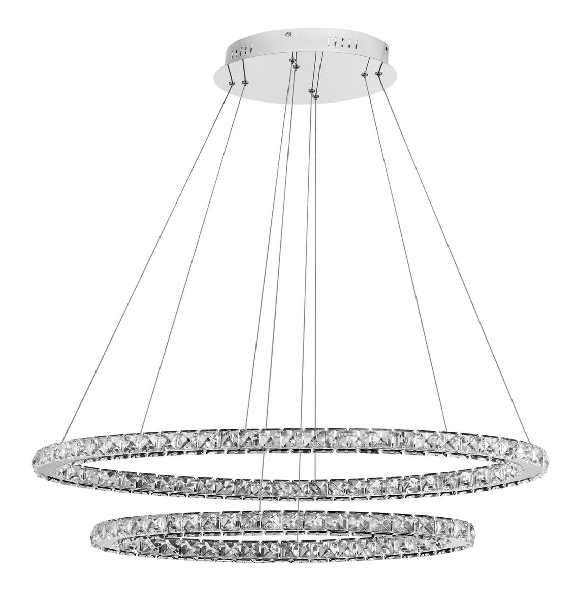 Kompozycja składa się z dwóch ringów zawieszonych kaskadowo, które wykonane są z kryształków osadzonych na metalowej konstrukcji. Konstrukcja oraz okrągła podsufitka wykończone zostały w chromie, który idealnie komponuje się z transparentym kryształem. Lampa posiada wbudowane źródło światła LED, które tworzy niepowtarzalny efekt świetlny.