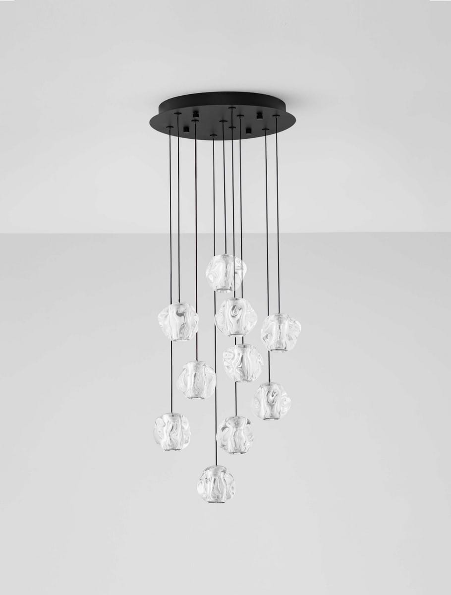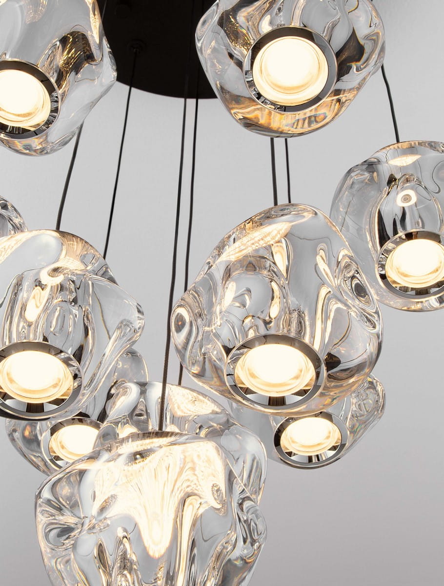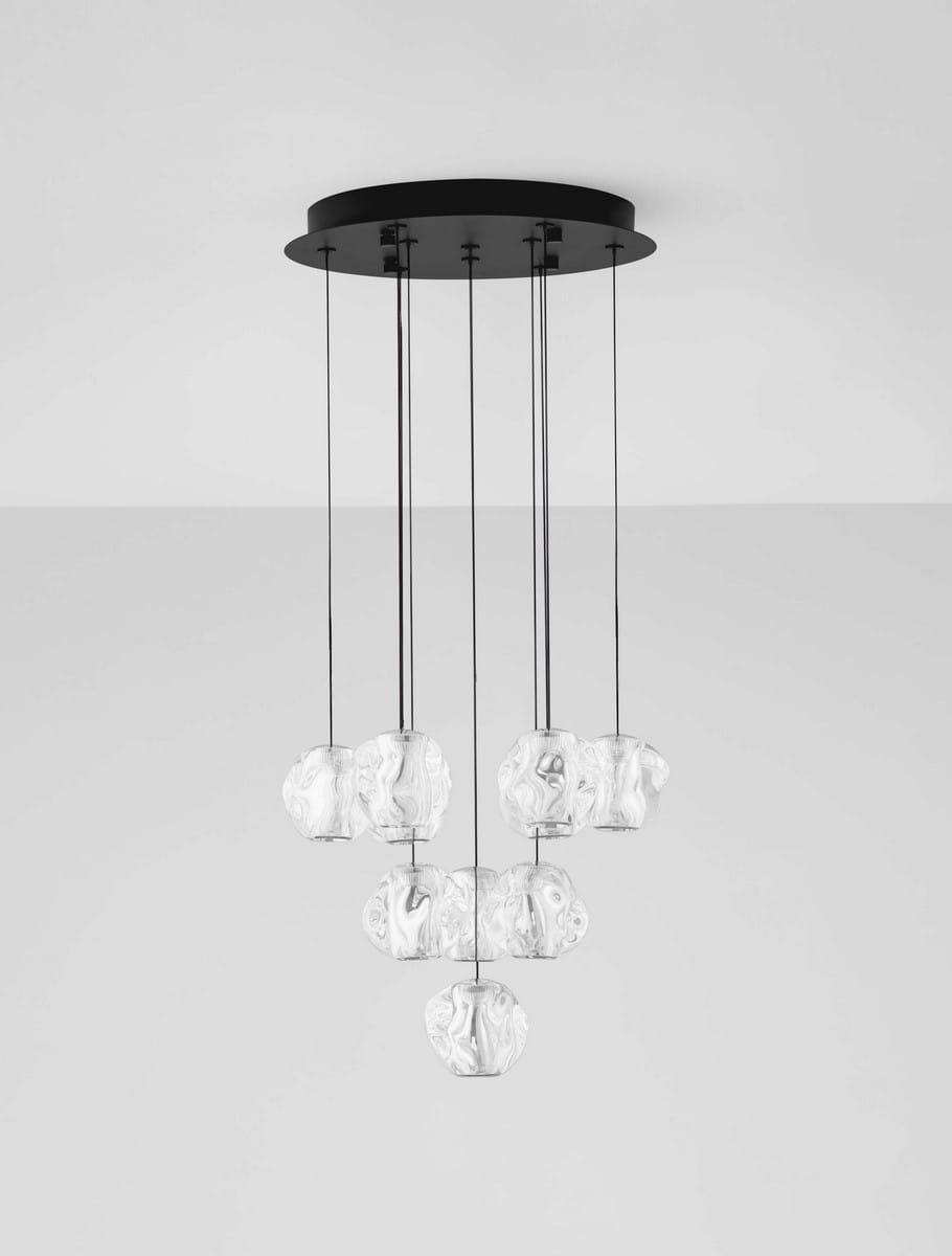 Kompozycja lampy składa się z dziesięciu kloszy wykonanych z transparentnego akrylu, które zostały rozmieszczone na różnych wysokościach, tworząc efekt przestrzennej kaskady. Akrylowe klosze przypominają organiczne, nieregularne formy, które swoim kształtem nawiązują do płynnych ruchów szkła. Każdy klosz swobodnie zwisa z okrągłej, metalowej podsufitki, co nadaje lampie lekkości i dynamicznego charakteru.