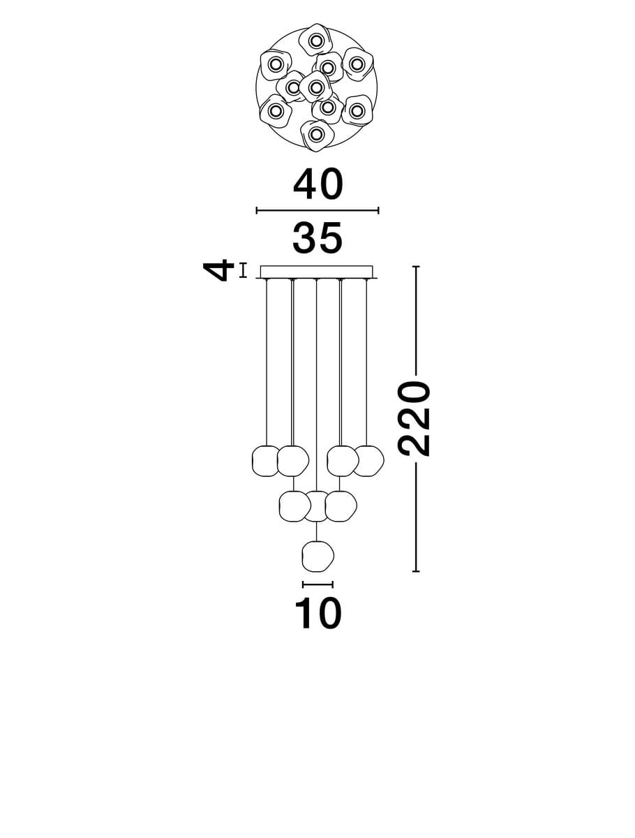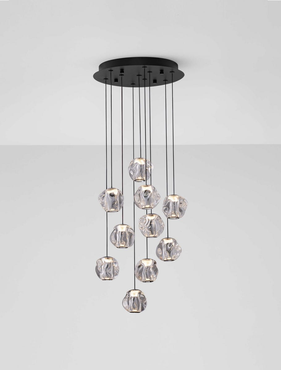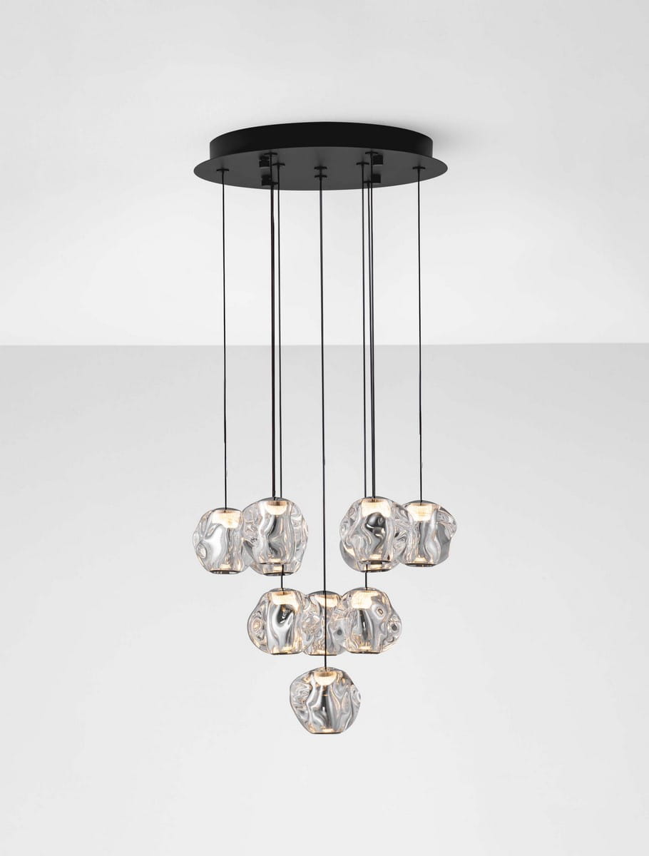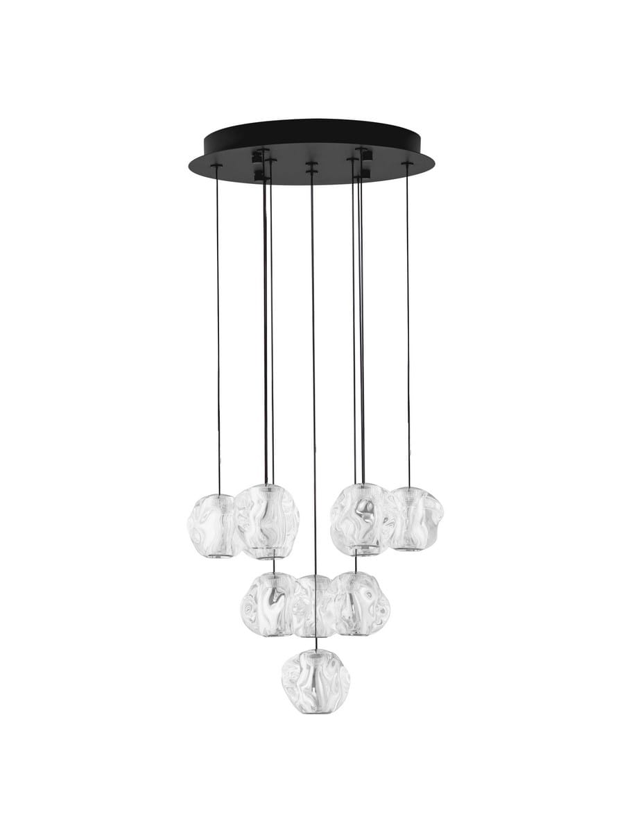 Kompozycja lampy składa się z dziesięciu kloszy wykonanych z transparentnego akrylu, które zostały rozmieszczone na różnych wysokościach, tworząc efekt przestrzennej kaskady. Akrylowe klosze przypominają organiczne, nieregularne formy, które swoim kształtem nawiązują do płynnych ruchów szkła. Każdy klosz swobodnie zwisa z okrągłej, metalowej podsufitki, co nadaje lampie lekkości i dynamicznego charakteru.