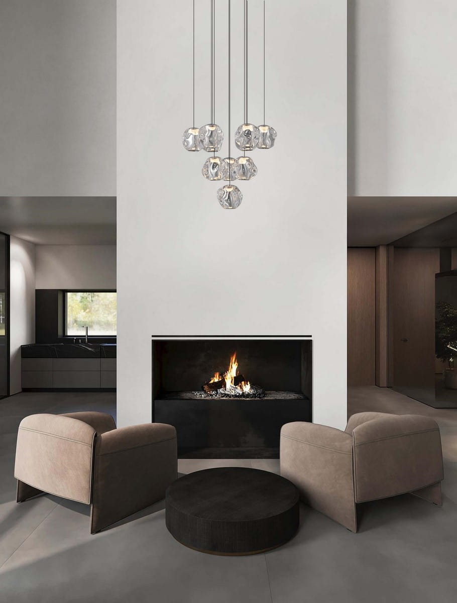 Okrągła podsufitka w subtelnym, nowoczesnym wykończeniu stanowi solidną bazę dla kompozycji, a różnorodność wysokości zawieszenia kloszy tworzy wizualny ruch, który przyciąga wzrok i dodaje wnętrzu głębi. Rozmieszczenie kloszy zapewnia równomierne rozproszenie światła, podkreślając nieregularne formy akrylowych elementów i tworząc zachwycające refleksy na powierzchniach wokół.